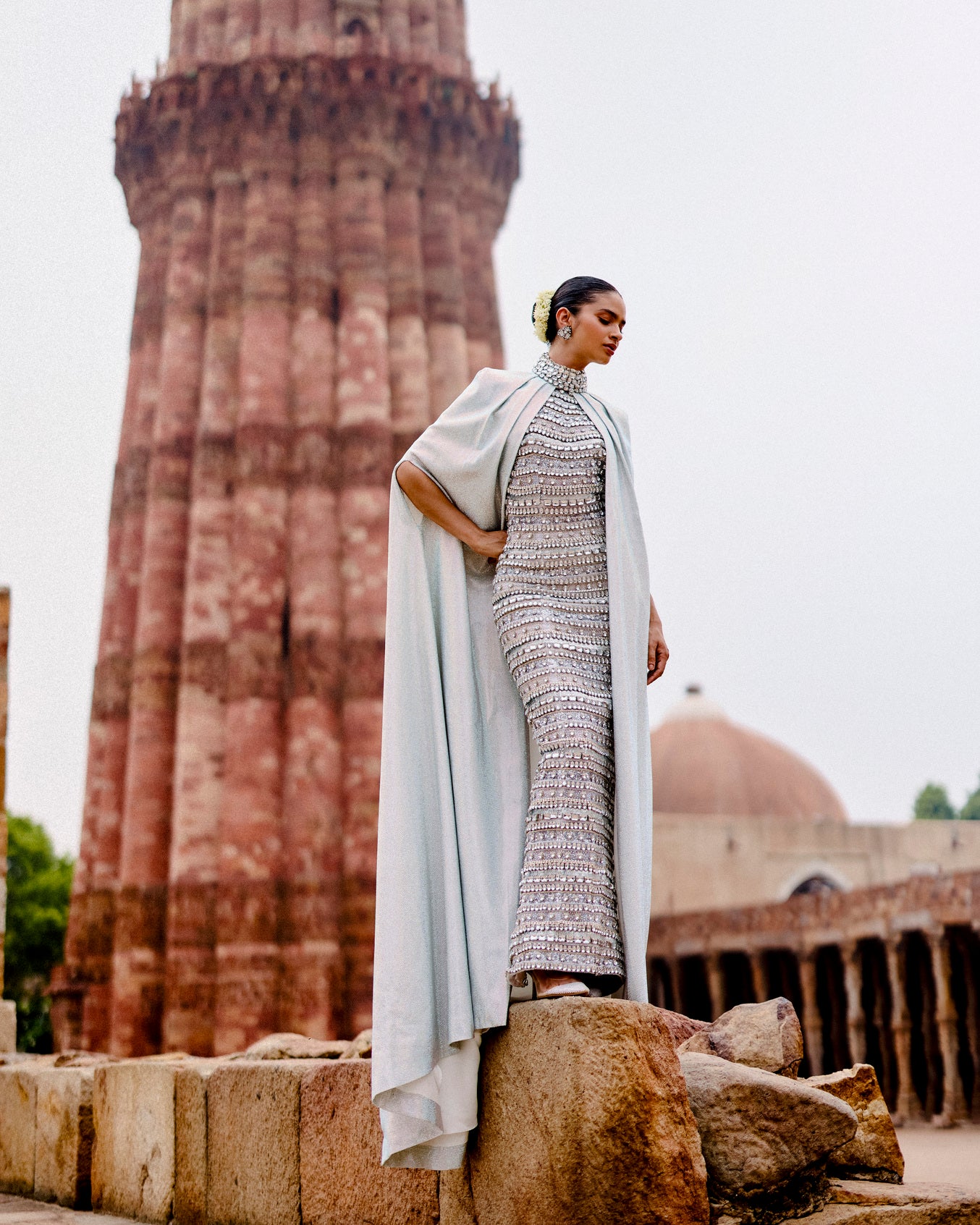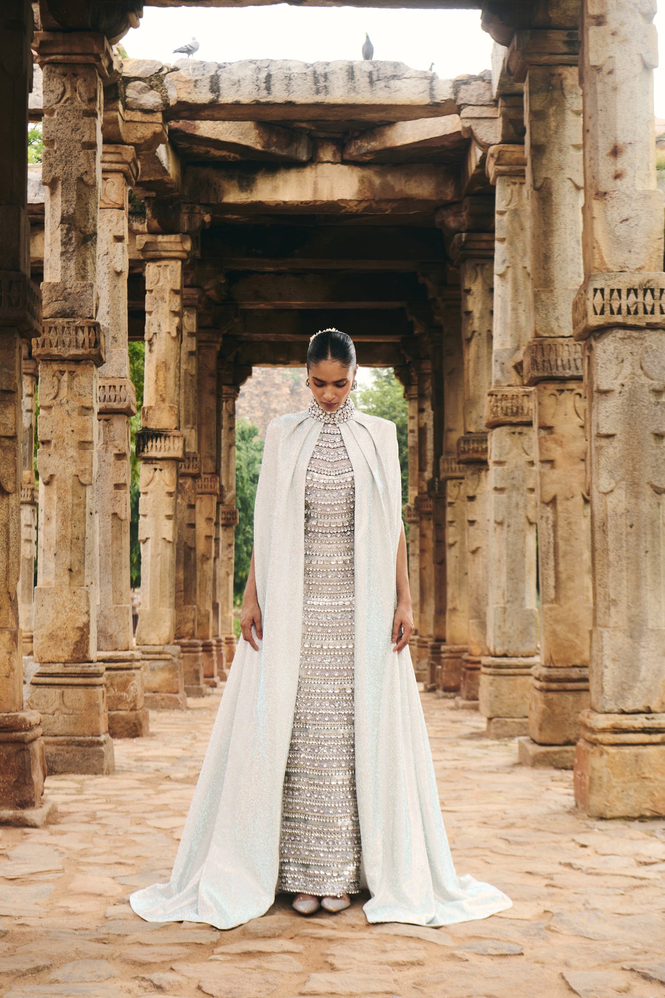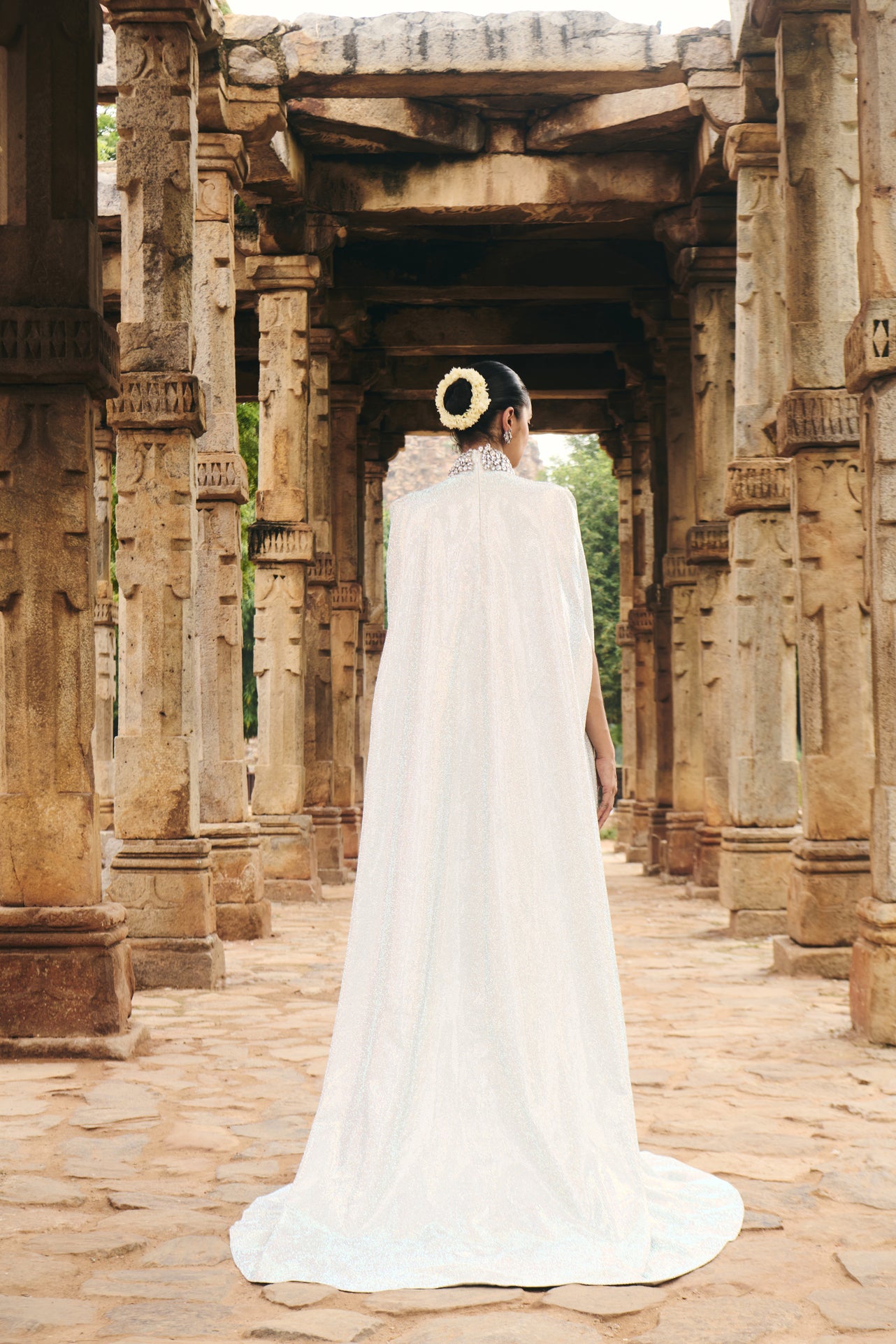 This white multimedia gown features stone embroidery on hard net fabric. It has a halter neckline and is set on a soft net lining fabric. Paired with a flowy cape made with Melon Crepe.