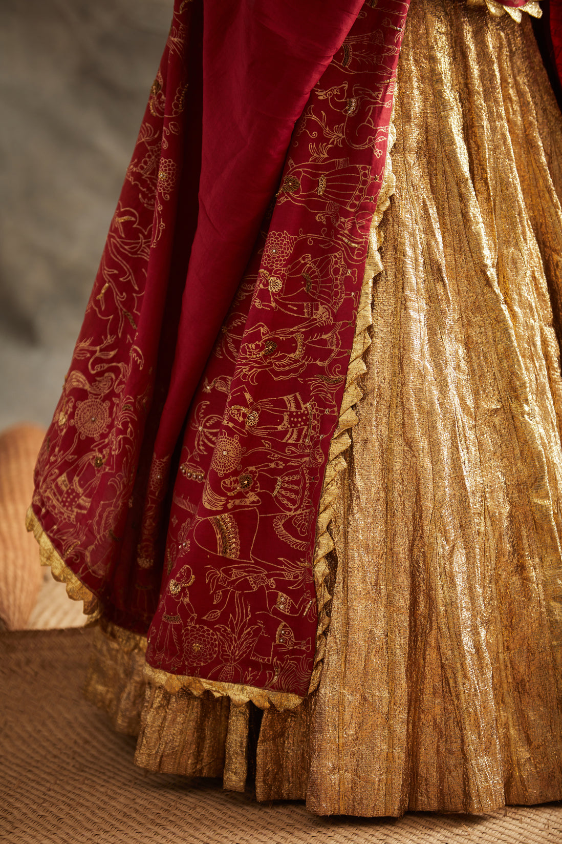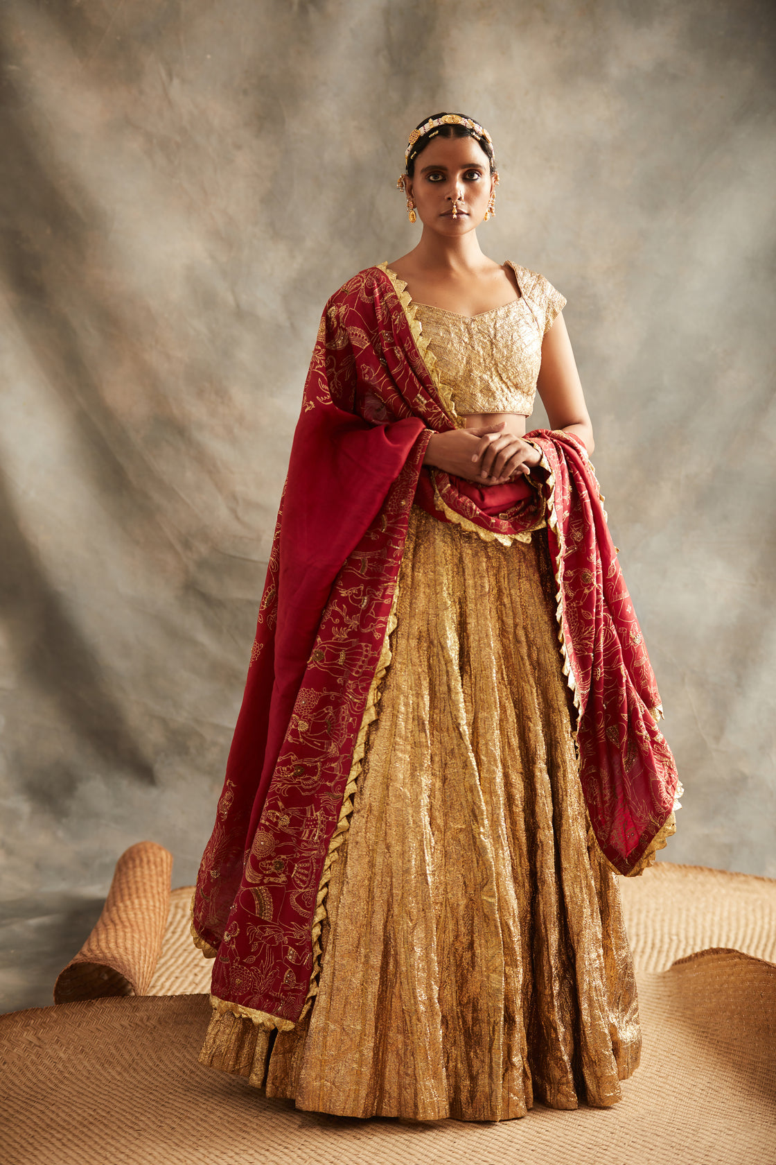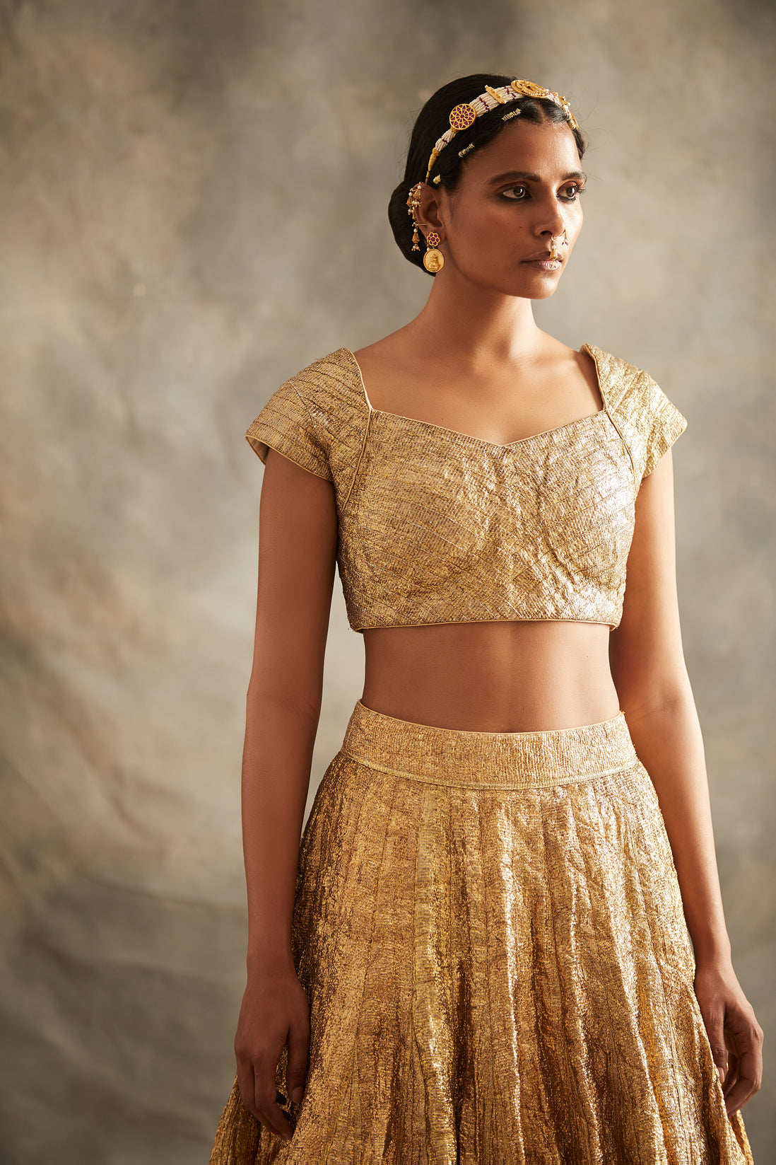 The Gold Woven Zari Gherdar Crinkled Lehenga With Lampi Blouse Teamed With Embossed Print,Hand Embroidery With Detailed Of Traingles