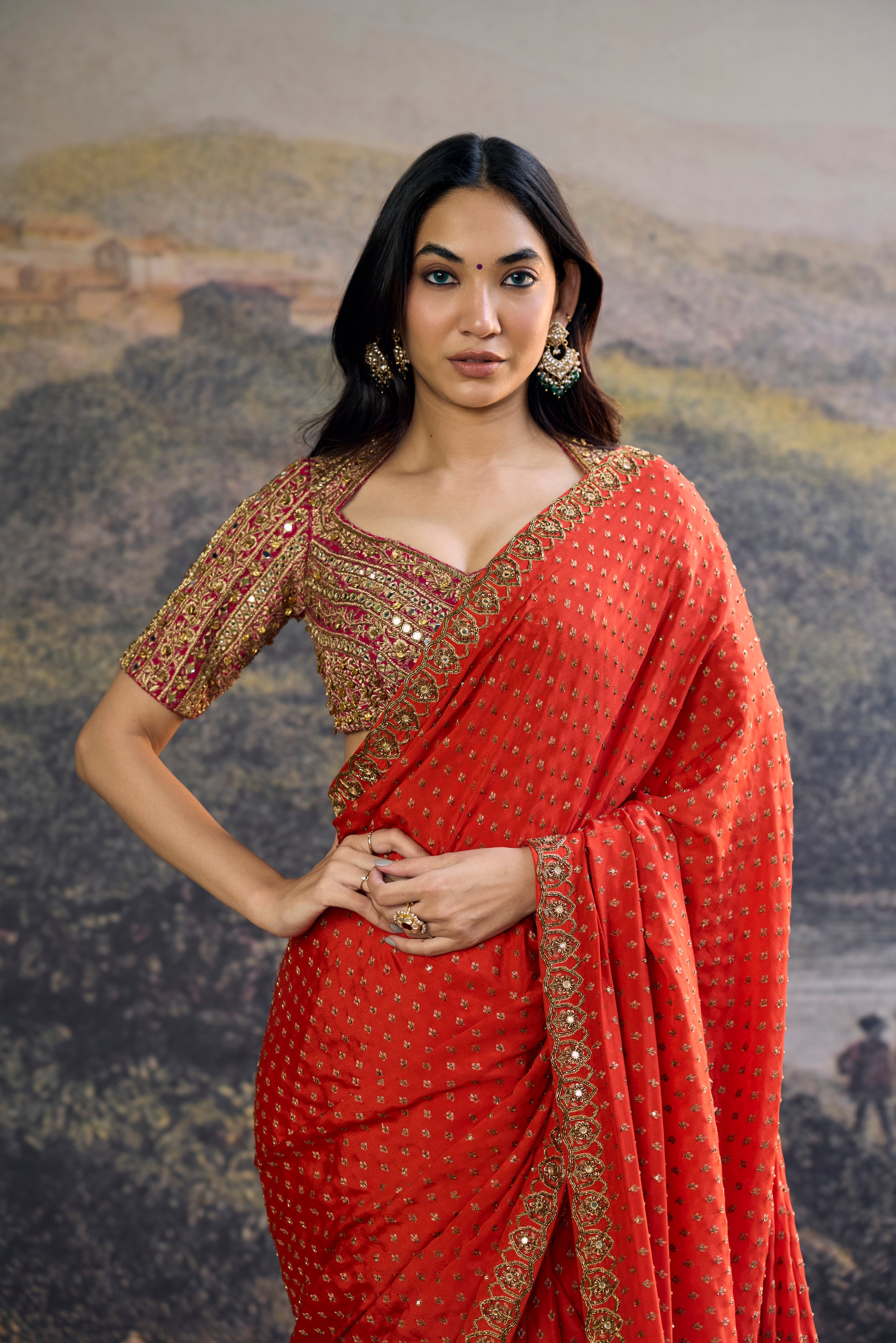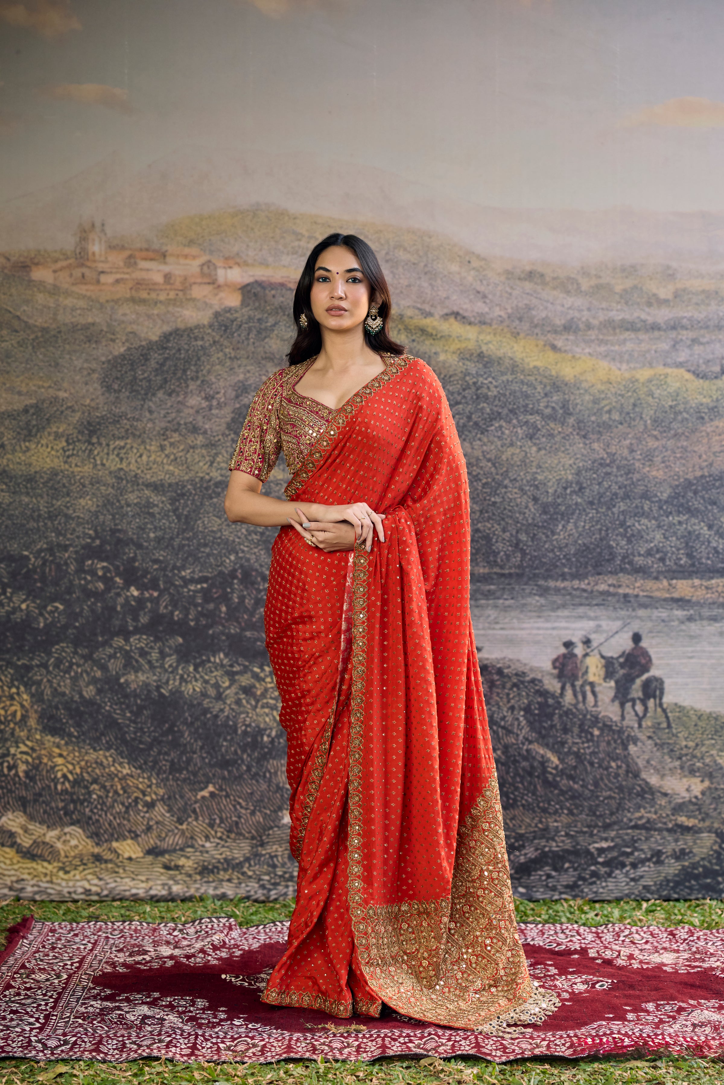 A Handcrafted Orange Crepe Saree Paired With A Contrasting Silk Blouse Featuring Intricate Hand Embroidery — A Perfect Balance Of Vibrance And Subtle Detail.