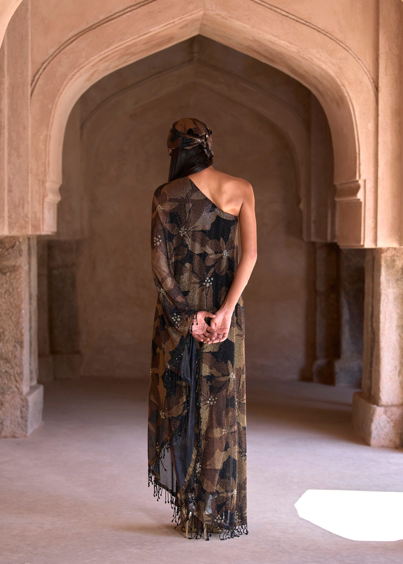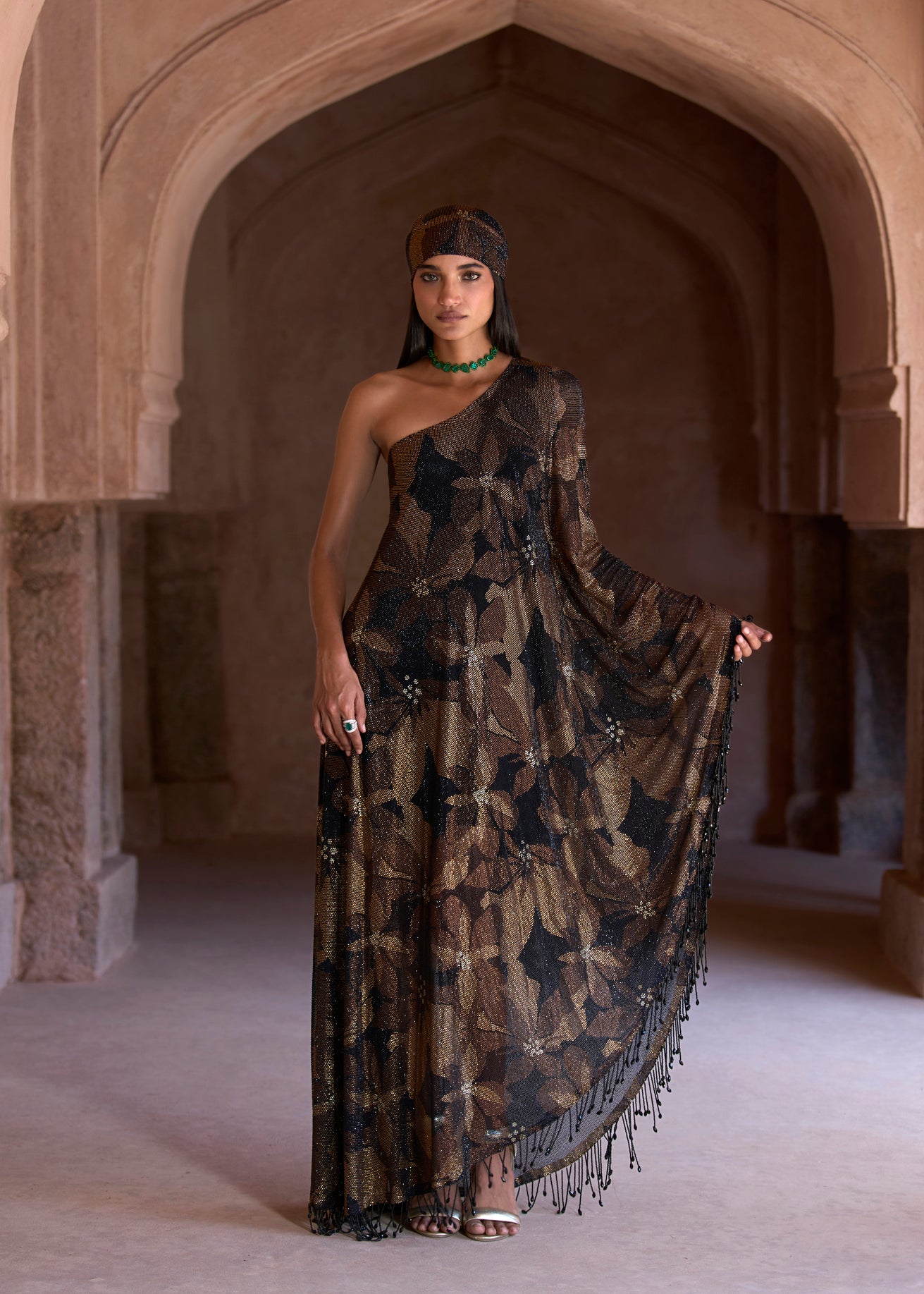 One-shoulder black and gold floral full-length kaftan with crystal droplet embellishment on the hem along with a matching headgear accessory.
