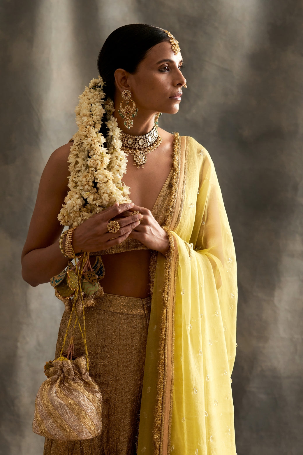 Gold Lampi Blouse And Sharara Teamed With Crystal Embroidered Silk Organza Dupatta