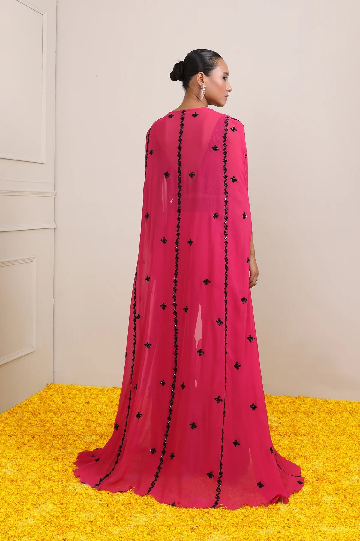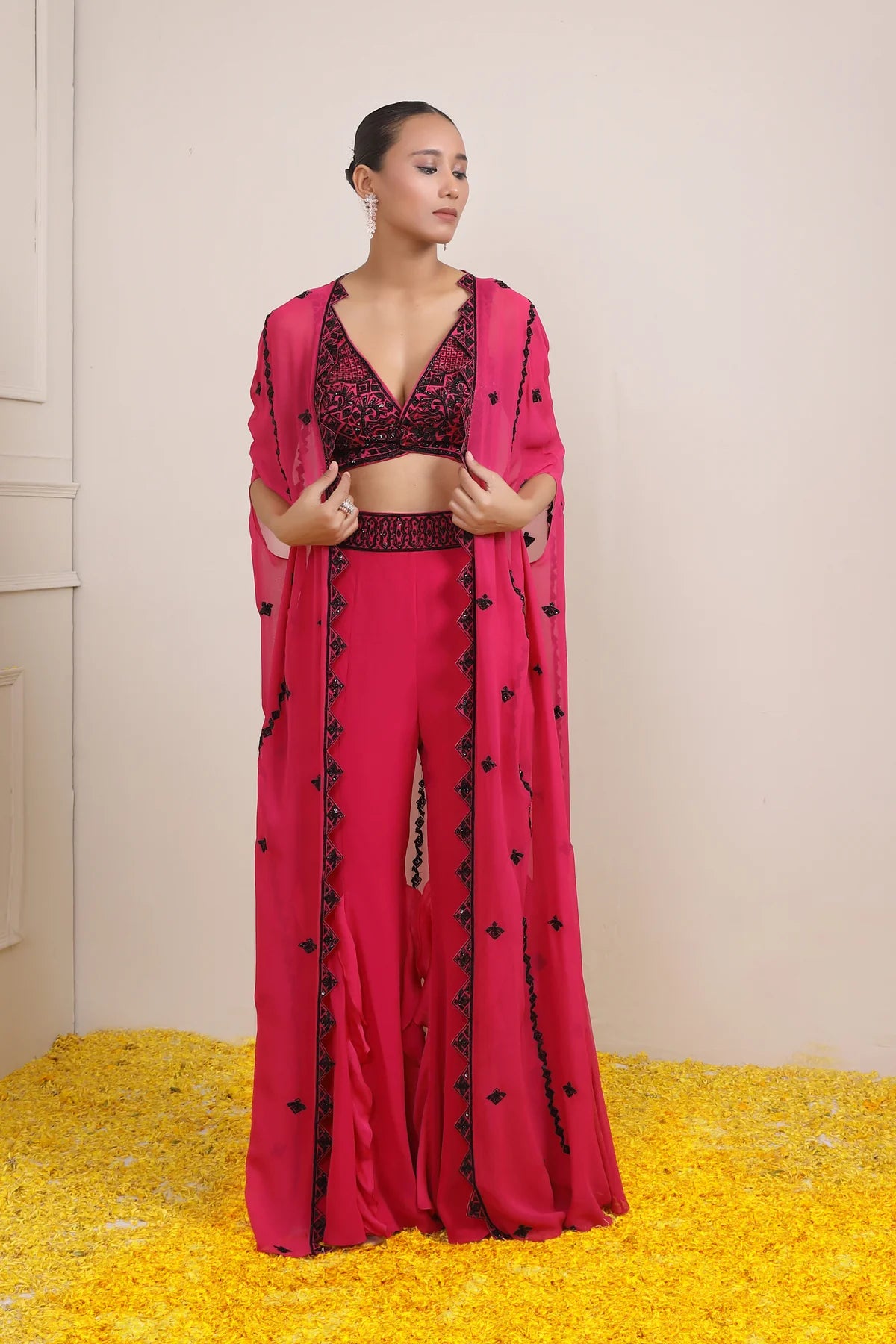 Hot Pink modern silhouette meets with enchanting Indian embroidery. Class Co-ord Set includes a embroidered Crop Top and flared Cape paired with wide leg Pants.