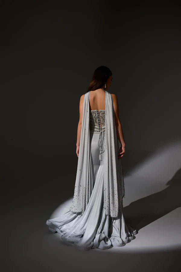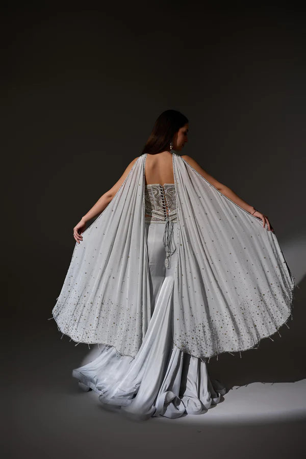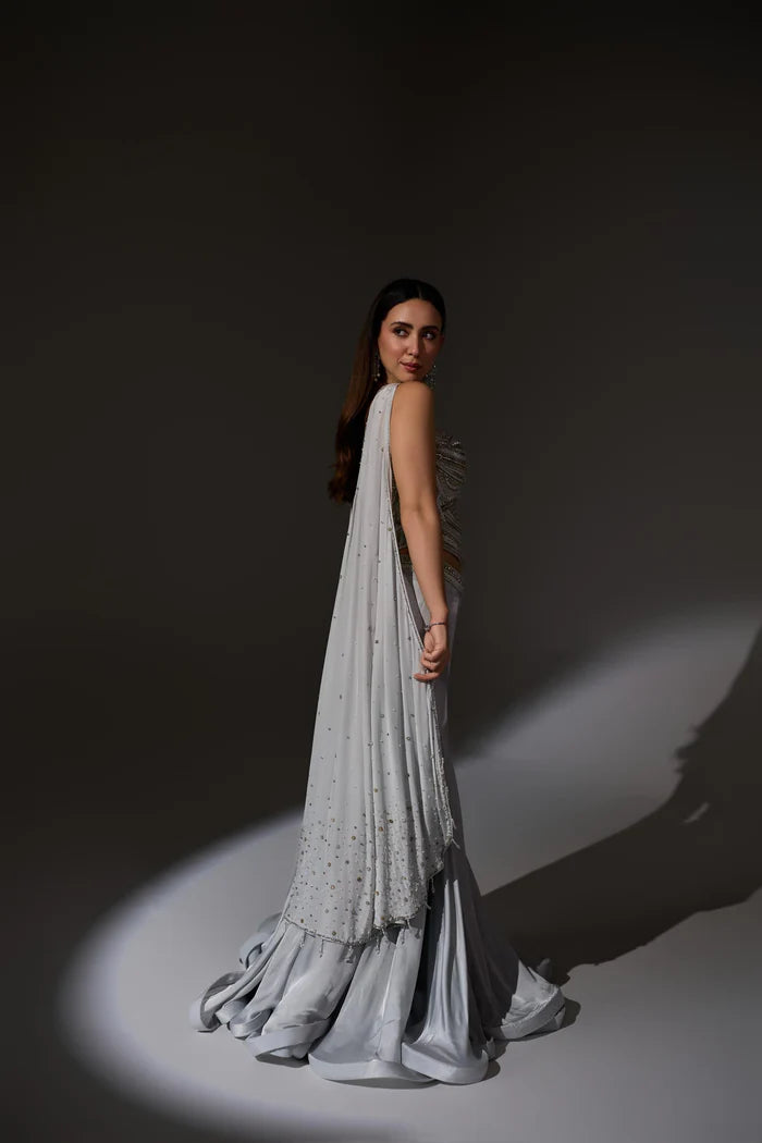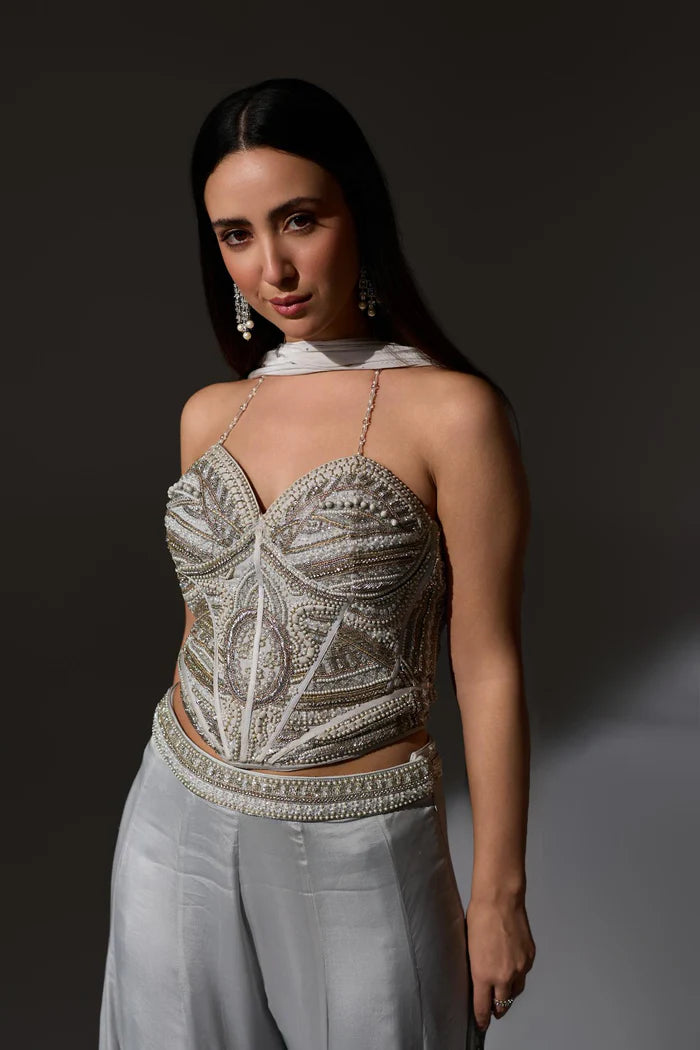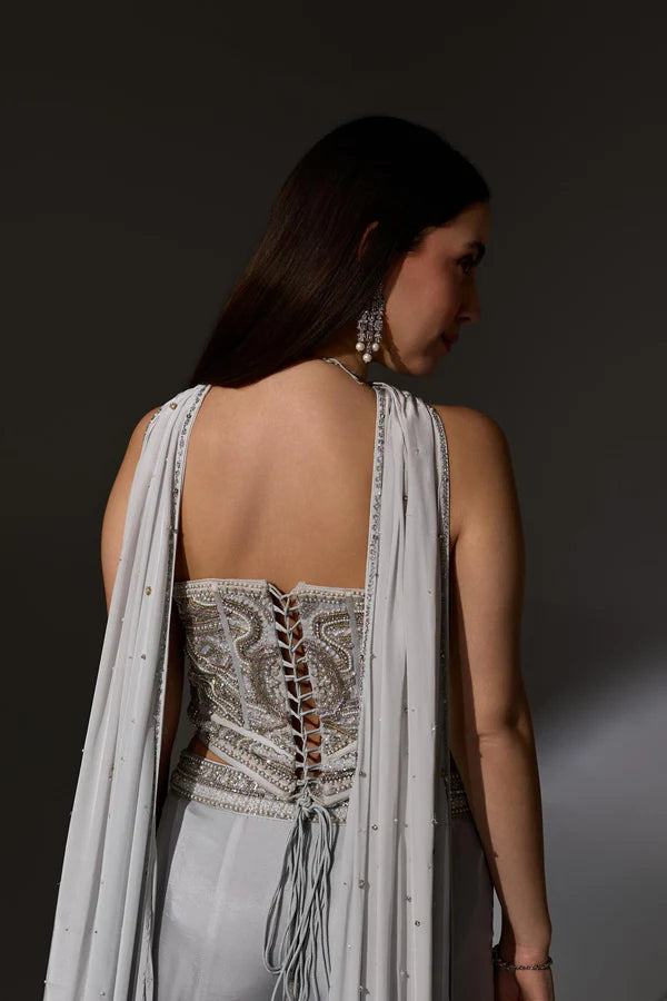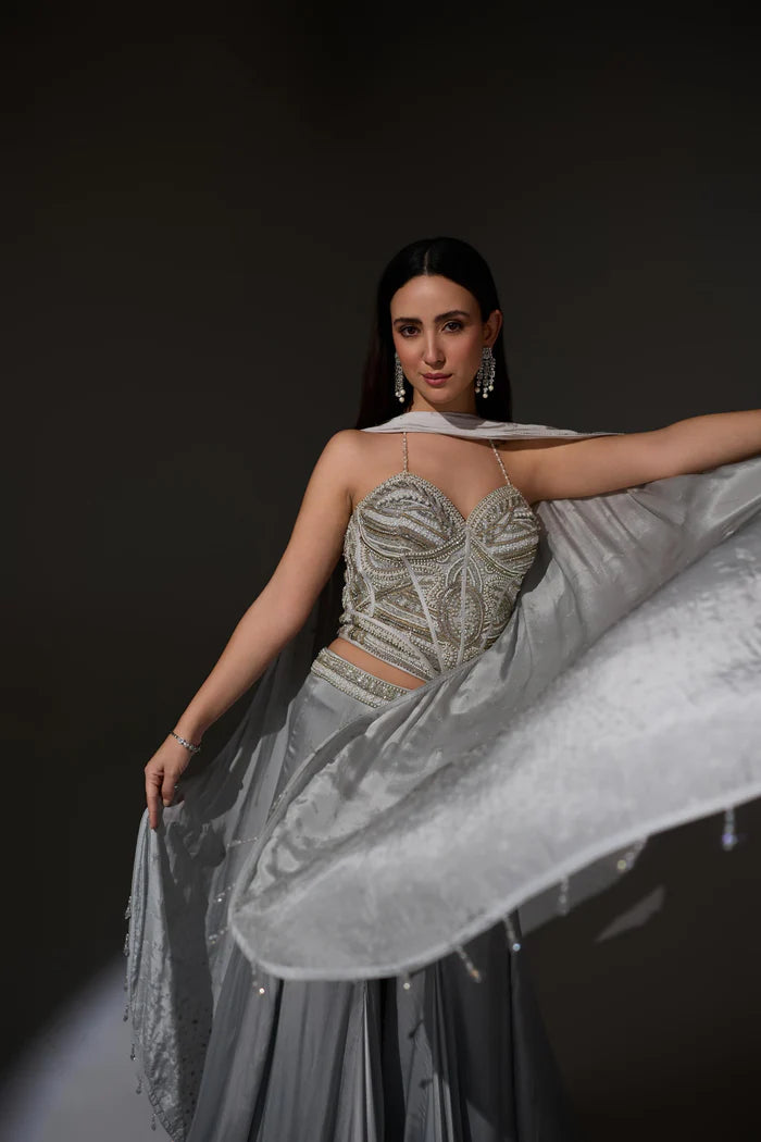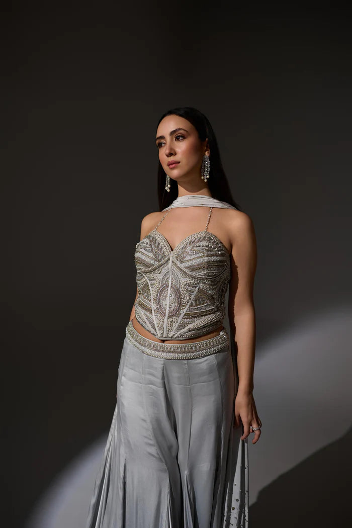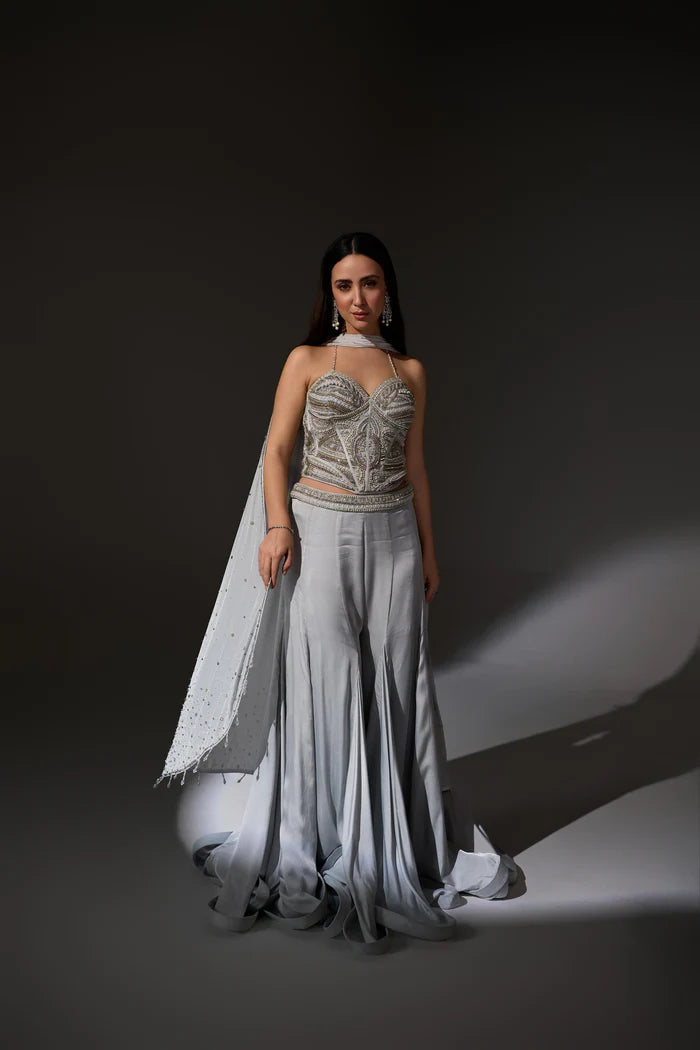 A Victorian-inspired sharara set designed for the modern muse. The look features a structured corset embellished with hand-appliqué and fine aari embroidery, evoking a sense of timeless romance. Paired with a dramatic sharara, detailed with wired hems for sculpted fullness and graceful movement.