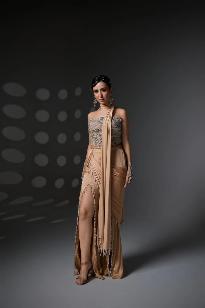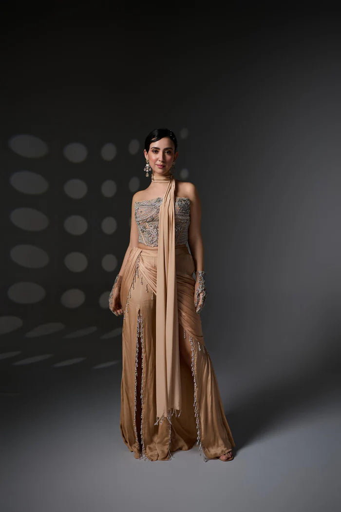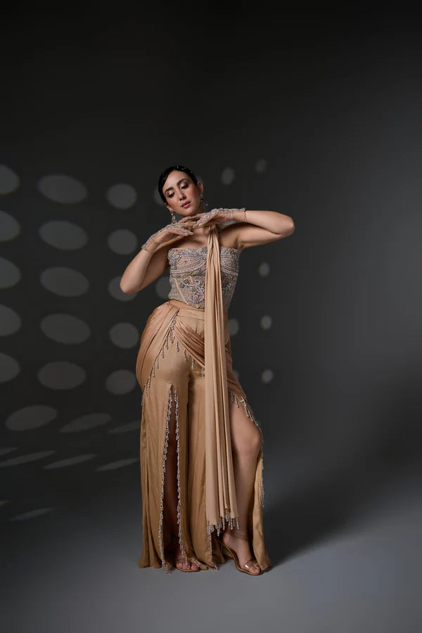 A contemporary ensemble crafted for the modern muse — this look features front-slit pants finished with playful tassel edging, offering movement and edge. Paired with a long, sculpted corset adorned with delicate aari hand embroidery, the outfit blends bold tailoring with artisanal finesse.