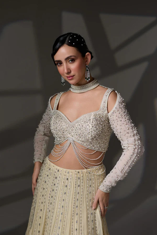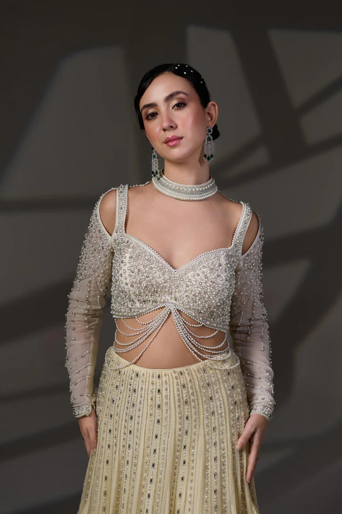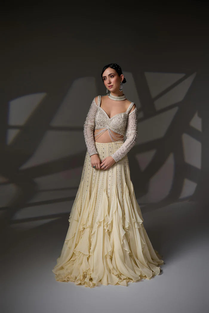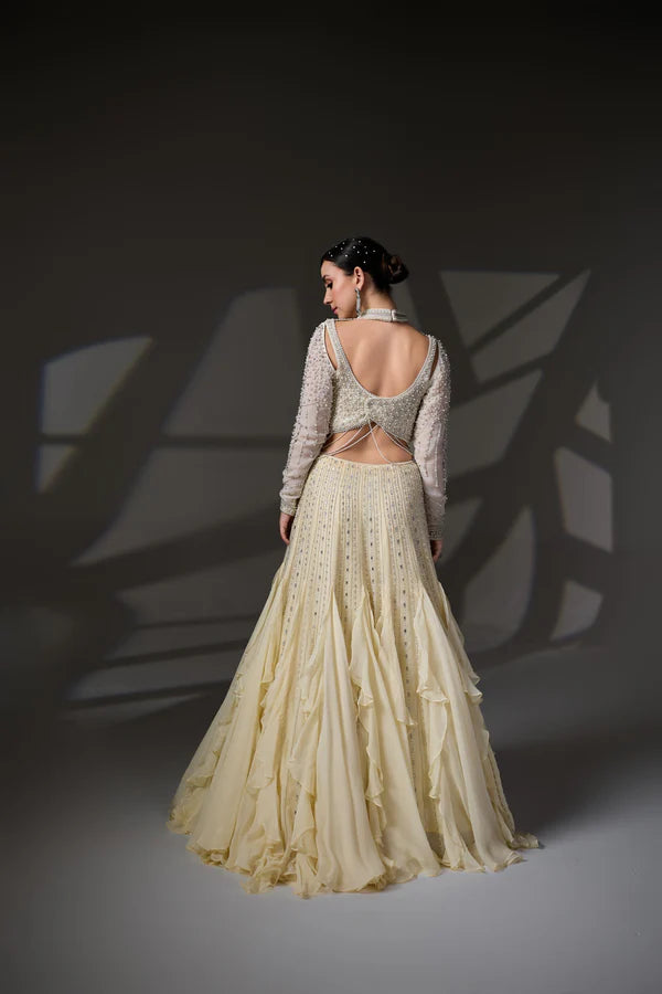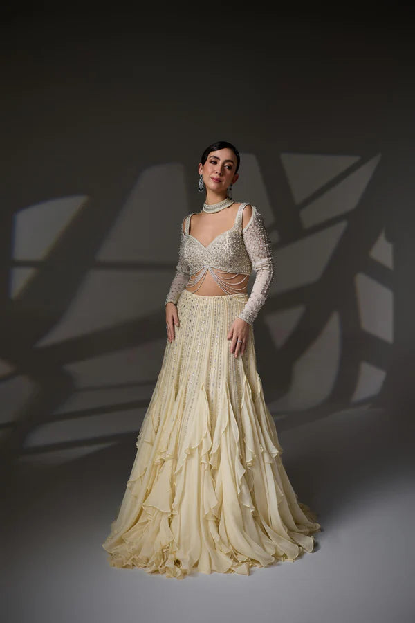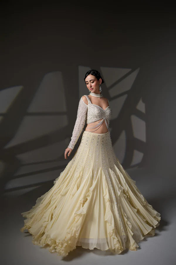 Make a bold yet graceful statement with this Victorian-inspired ensemble — featuring a full-sleeve blouse embellished with delicate hand embroidery and cascading tassels that add movement and charm. The look is completed with a voluminous ruffle skirt, offering layers of soft drama and fluidity with every step.