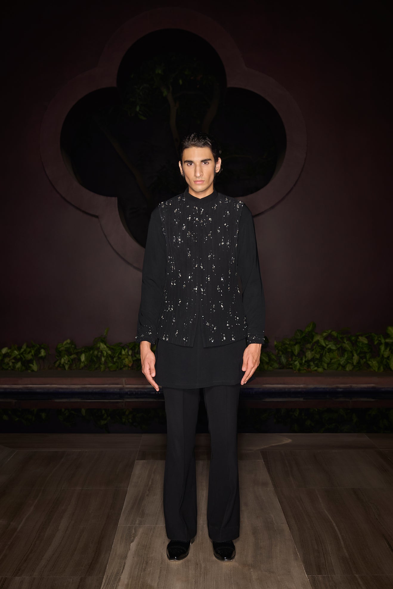 An embellished Nehru jacket adorned with crystals, stones, and intricate 3D dori work, paired with a sleeve-embellished kurta and pants