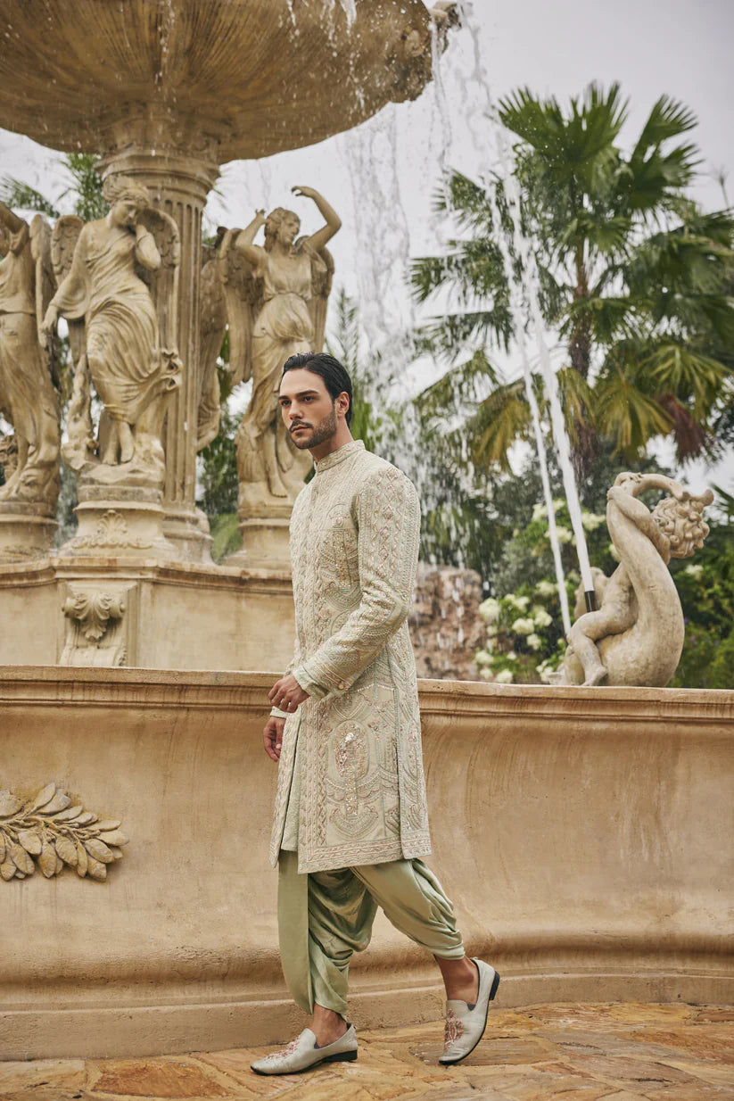 Powder Sage Green sherwani is crafted on luxurious shimmer tissue fabric and adorned with intricate thread and zardosi embroidery that exudes understated royalty. Paired with a textured kurta featuring tonal threadwork and classic dhoti pants, the ensemble offers a perfect balance of tradition and contemporary flair. The standout element is the dupatta, showcasing exquisite peacock embroidery and a distinctive cut that adds drama and grace.