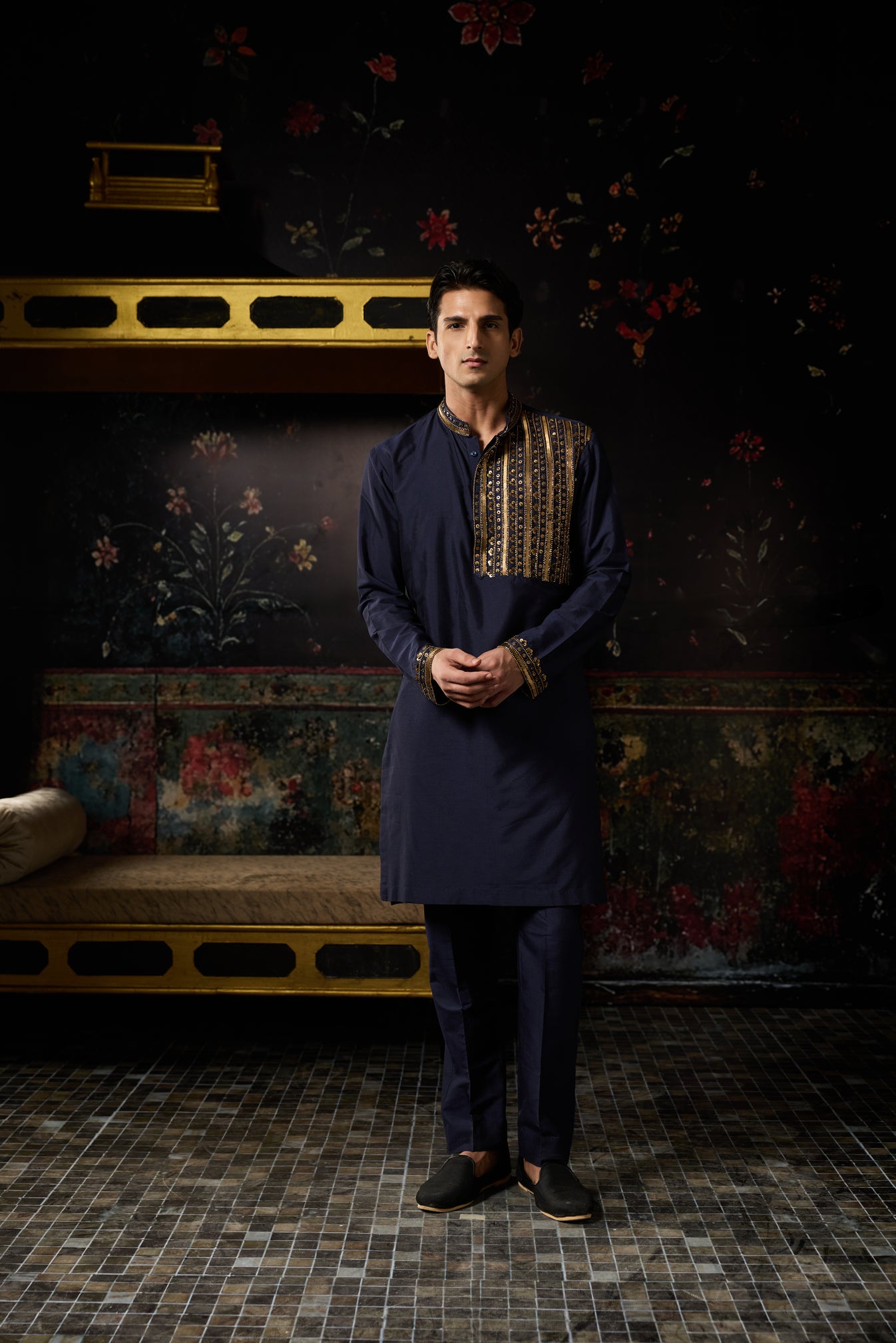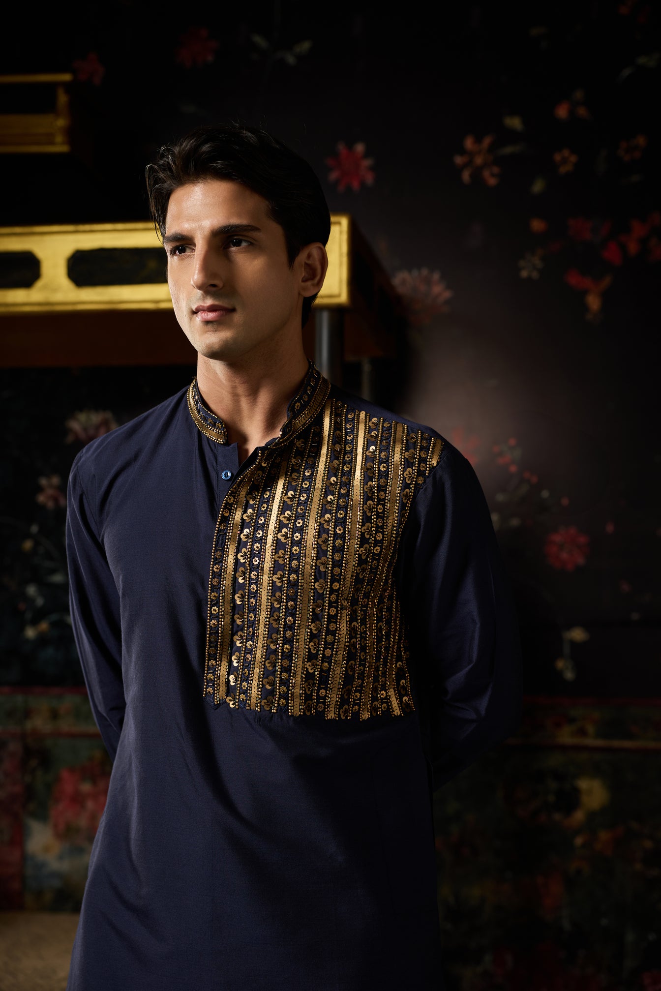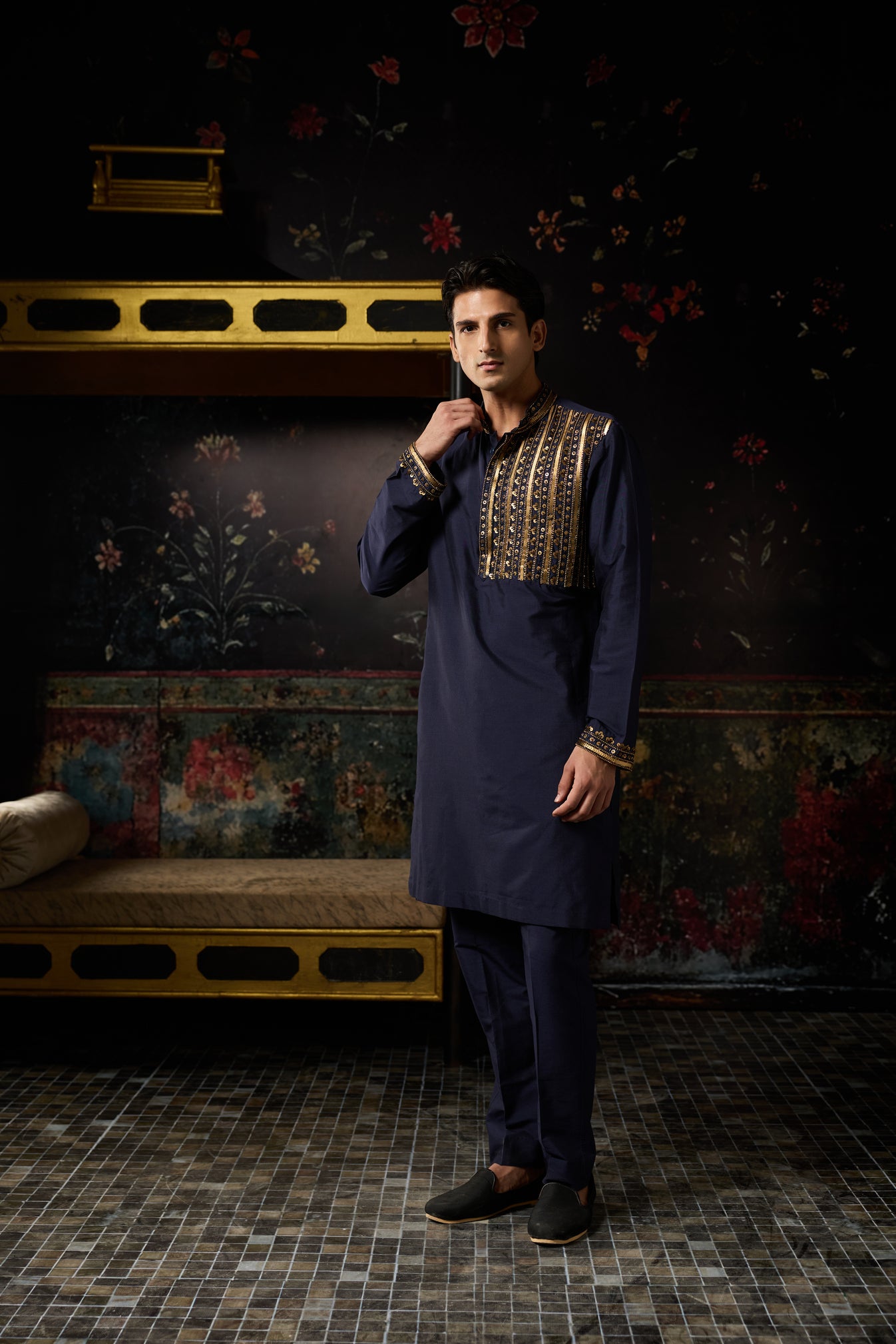 Blue With Linear Matt Gold Embroidered Kurta Paired With Blue Pants