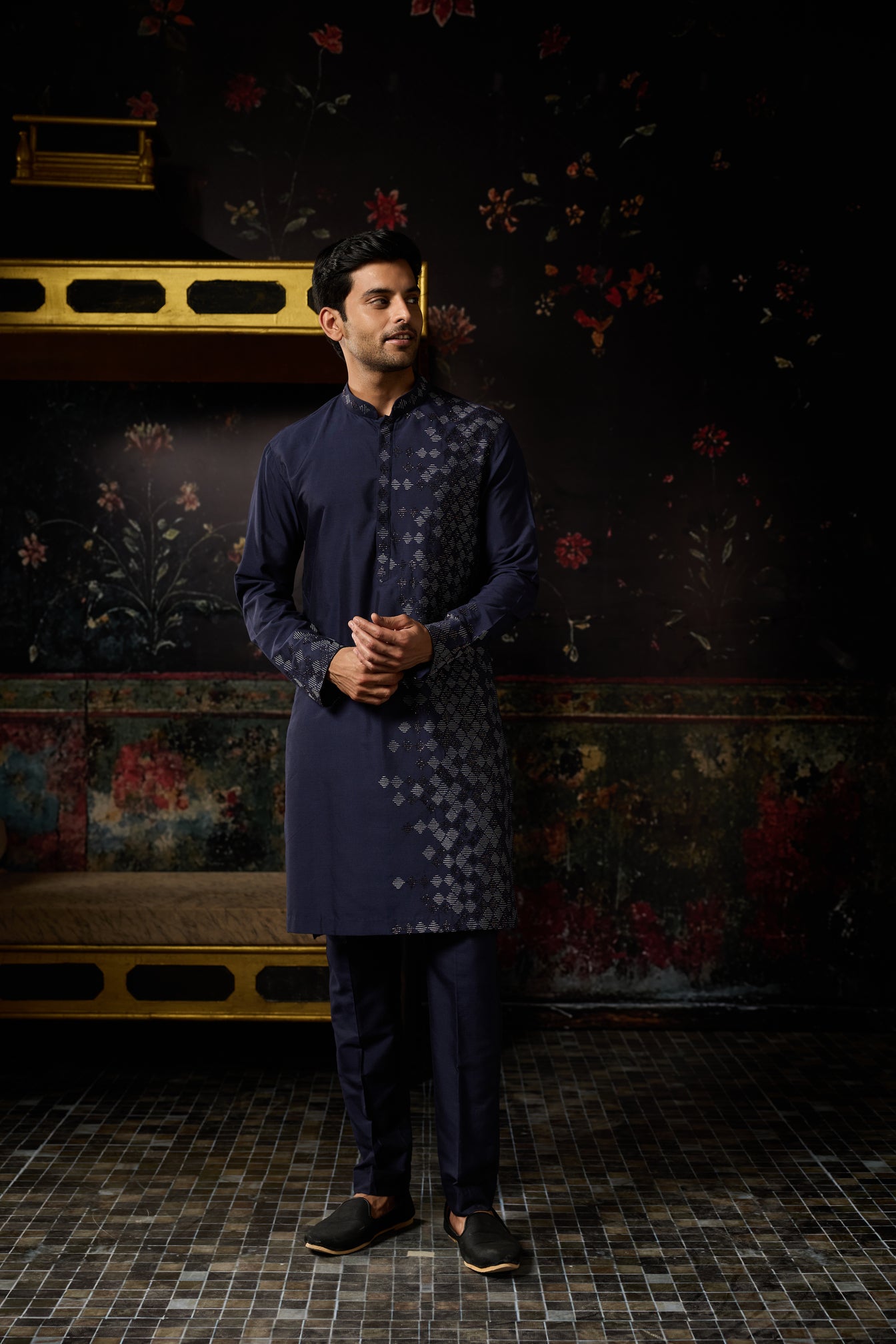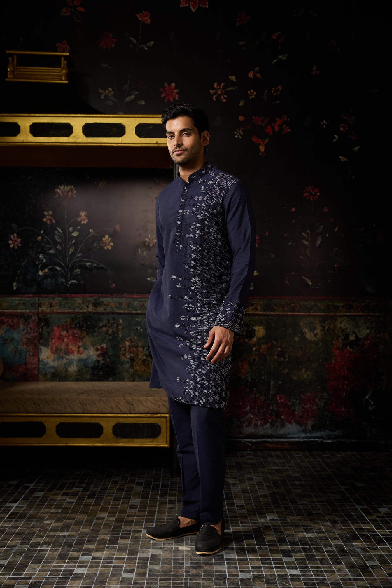 Dark Blue Diamond Thread & Cutdana Mix Embroidered Kurta With Blue Pants
