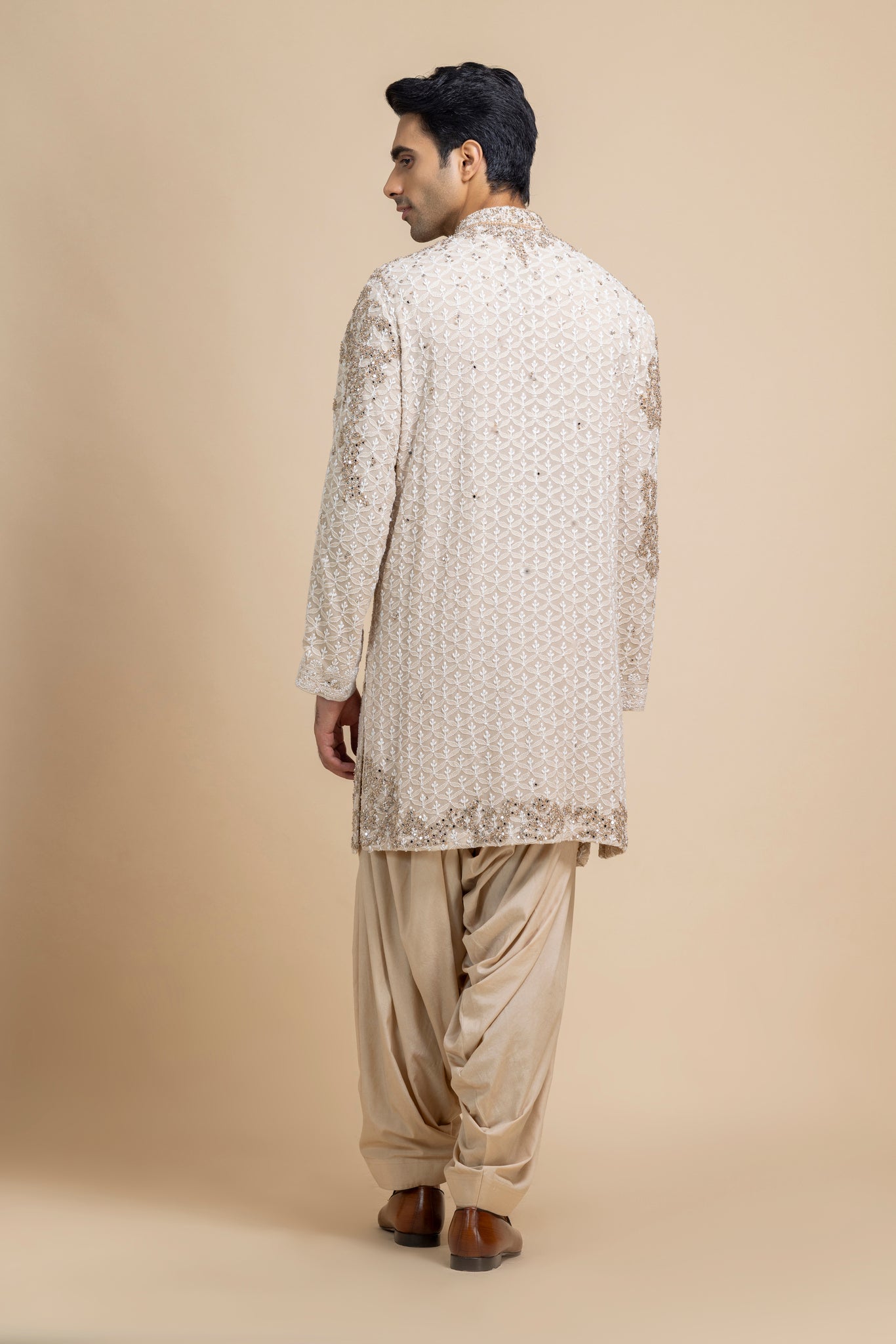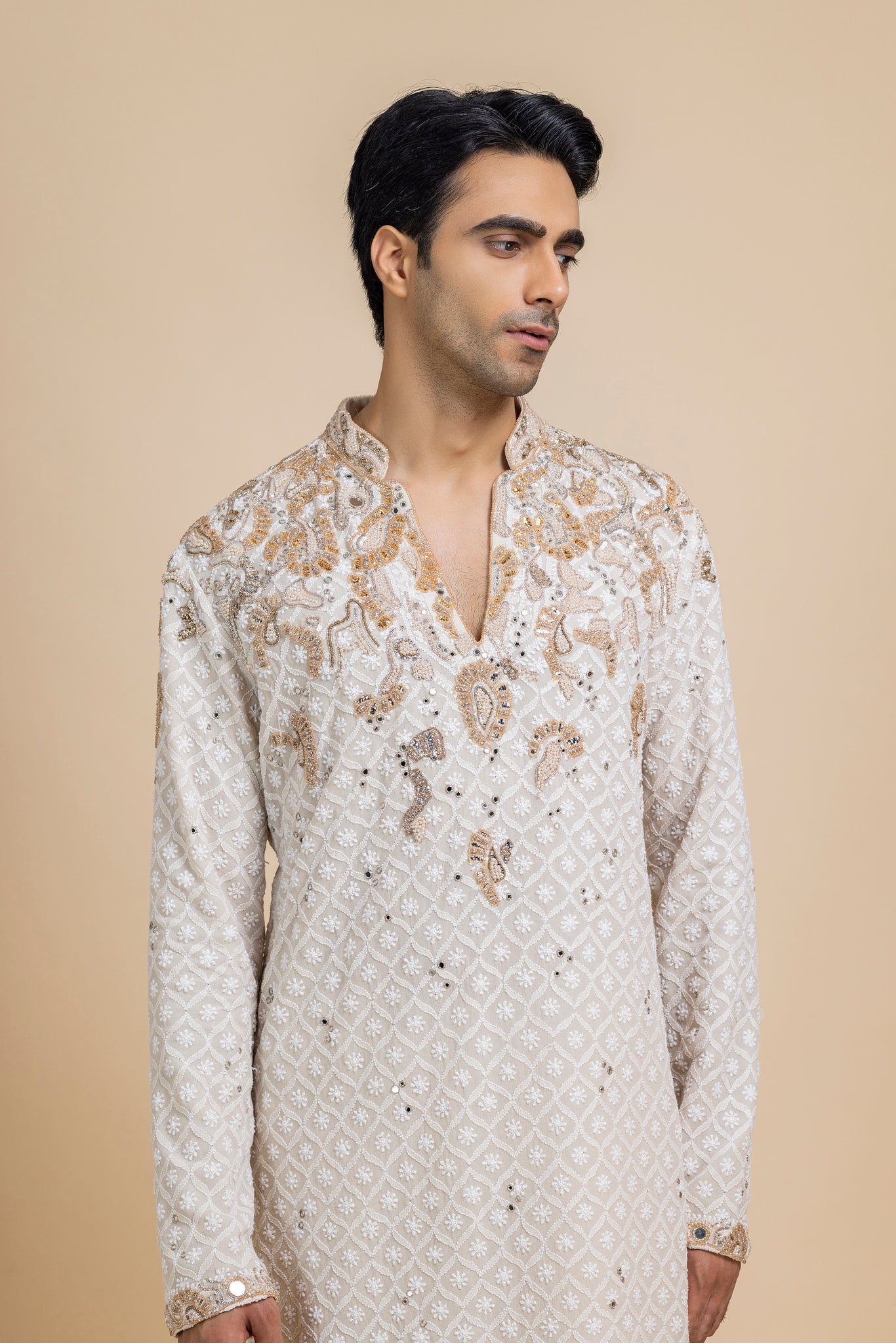 This Ivory Embroidered Chikankari Kurta With Beige Salwar, Highlighted With Intricate Zardozi And Bead Embellishments, Is An Exquisite Choice For Celebrations That Demand Elegance With A Touch Of Grandeur.