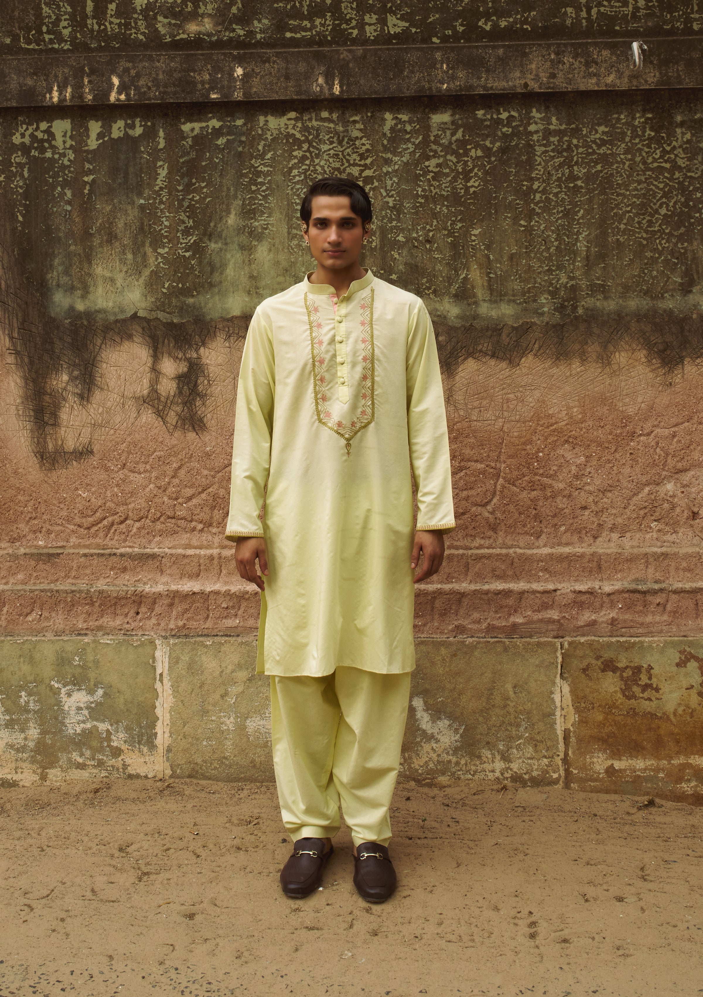 This pastel green kurta in pure cotton silk is adorned with delicate floral motifs, brought to life through intricate aari and dori embroidery in soft peach color thread. The full sleeves are finished with embroidered borders, while the placket is subtly highlighted with a peach accent. Paired effortlessly with a classic drawstring salwar, the ensemble exudes graceful charm and understated elegance.