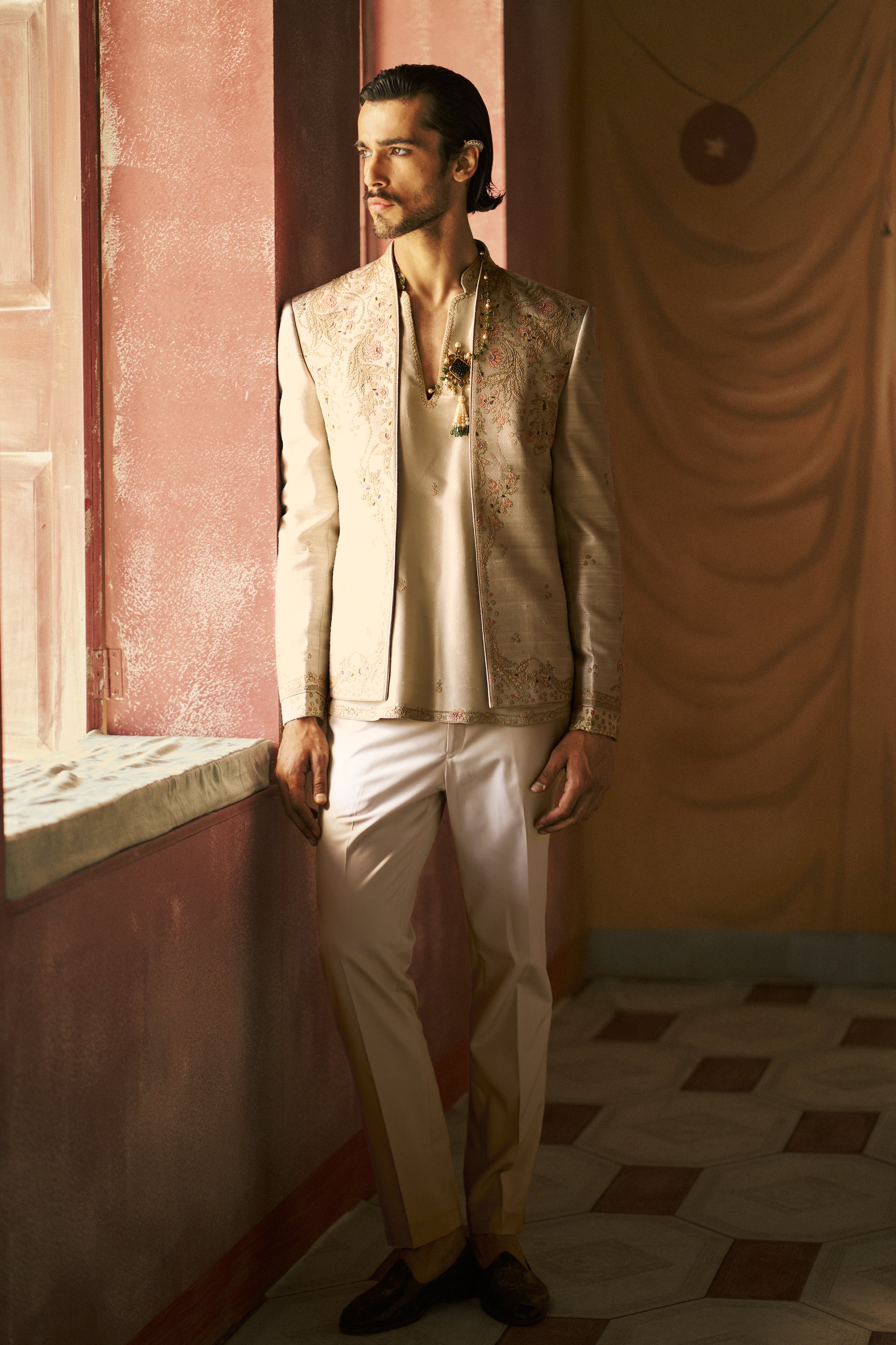 This Sea Breeze-Toned Ensemble Features A Dupion Kurta And Suiting Fabric Trousers, Complemented By An Open-Front Raw Silk Jacket With Intricate Floral Pastel Dori Embroidery. A Perfect Fusion Of Classic Tailoring And Sophisticated Craftsmanship