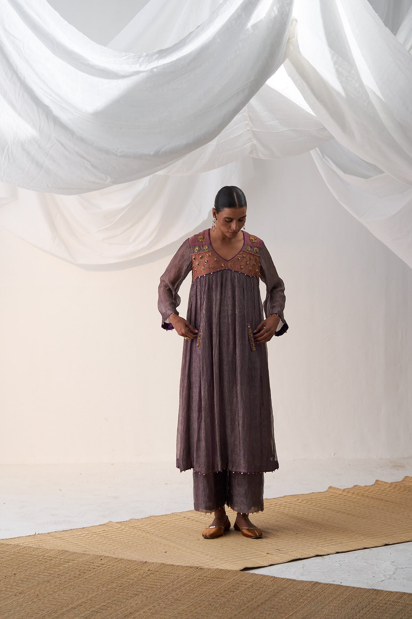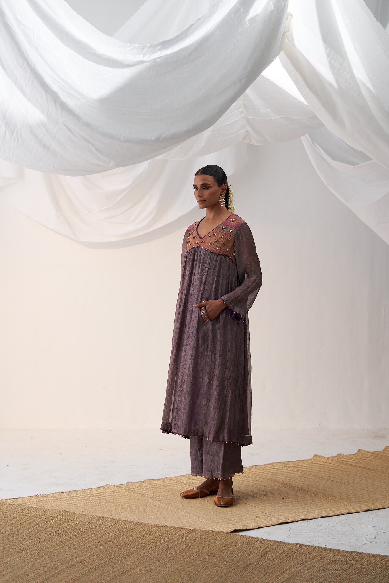 Free style gathered kurta with intricated ghunghroo embroidery on neckline, pocket and sleeve's hem, paired with culotte pants