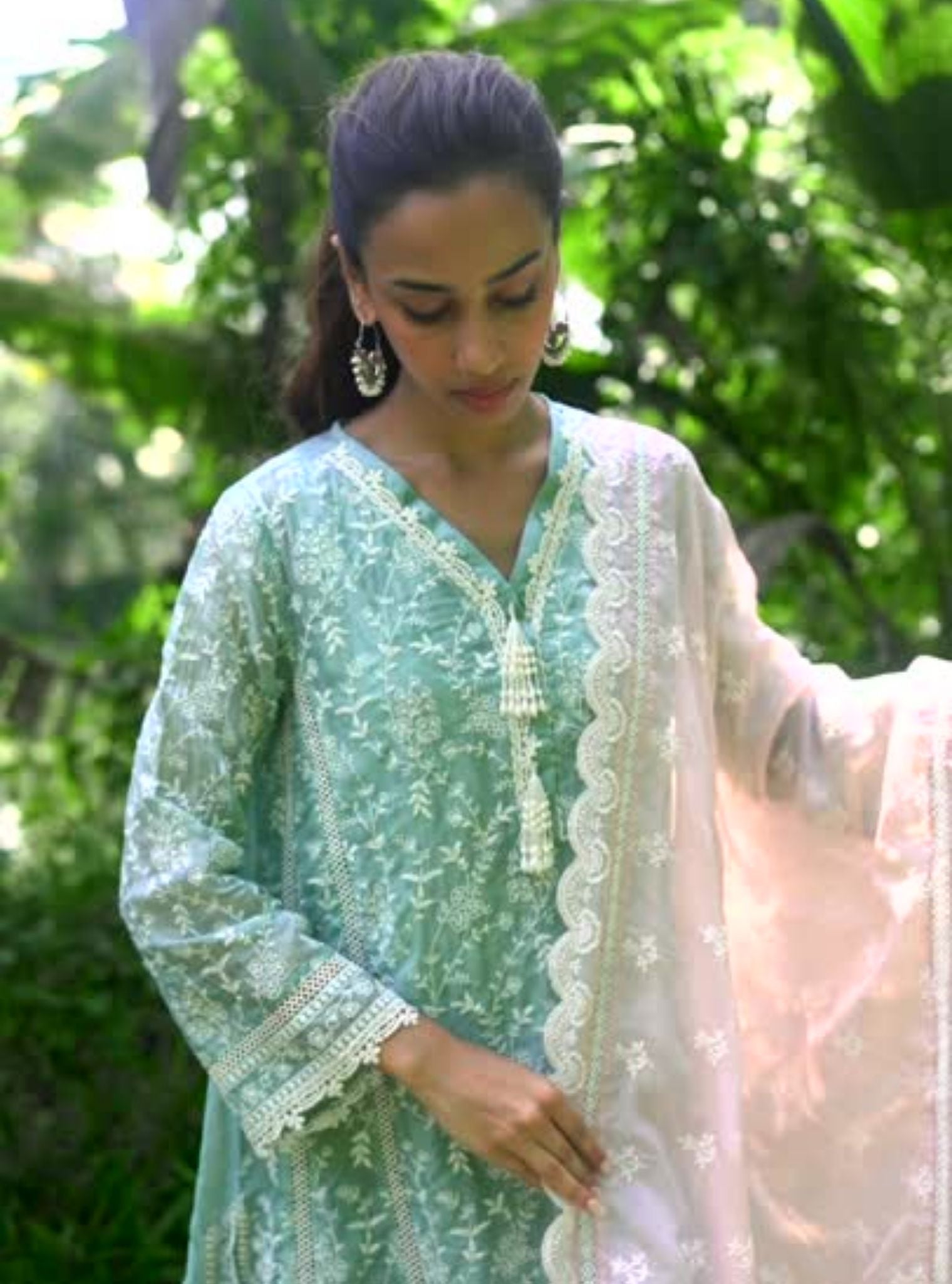 This kurta set in a refreshing shade of teal blue is a stunning choice for intimate summer festivities. Made from breathable organza, the kurta features intricate floral and vine embroidery that stands out beautifully against the cool teal backdrop. The V-neckline is adorned with delicate lace detailing and playful tassels. The three-quarter sleeves, finished with scalloped lace edges, enhance the airy and lightweight appeal of the ensemble.