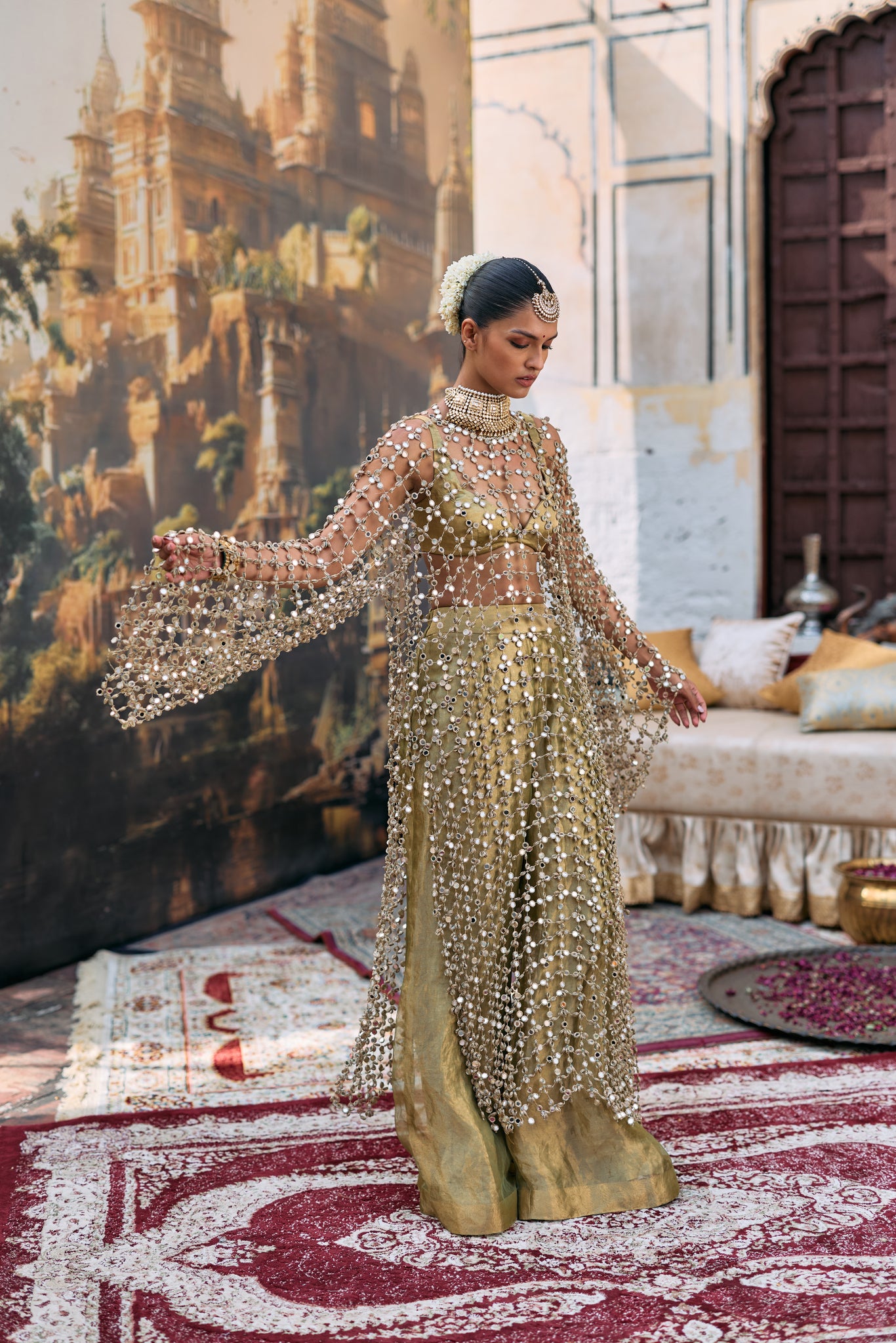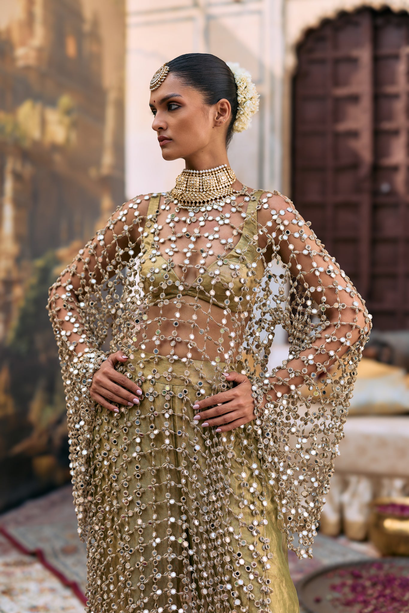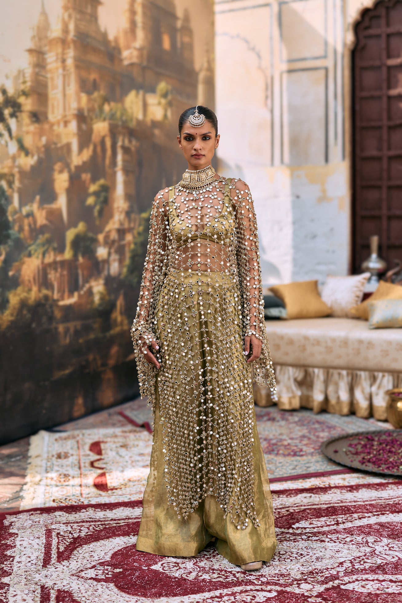 This outfit features a full sleeves mirror jaal kurta. It's paired with a green tissue bralette and a matching wide leg pants.