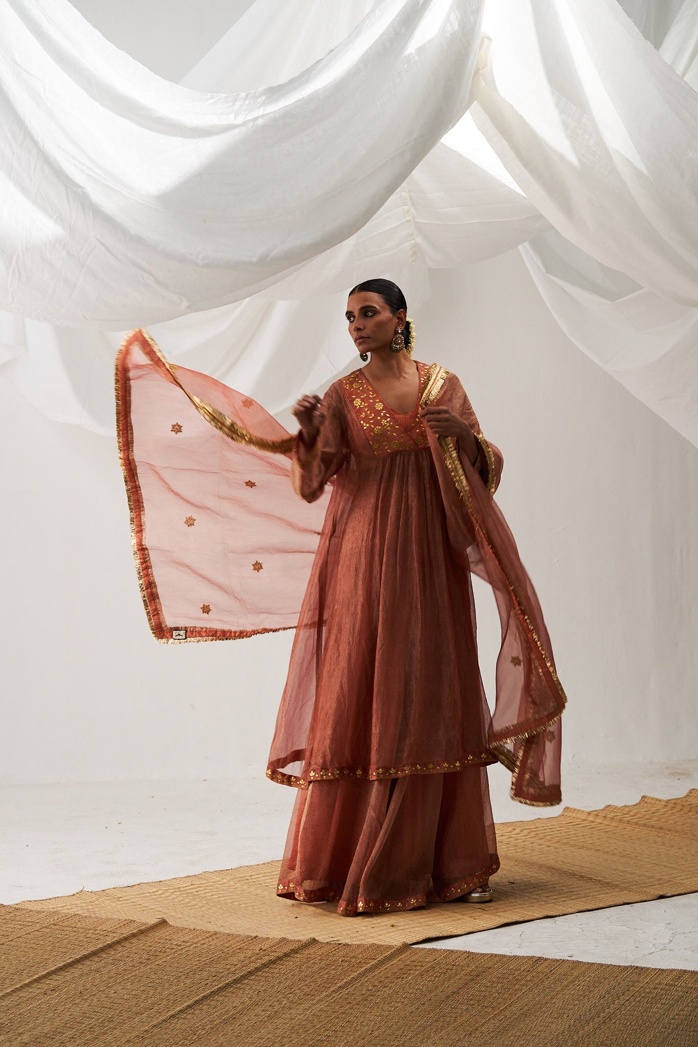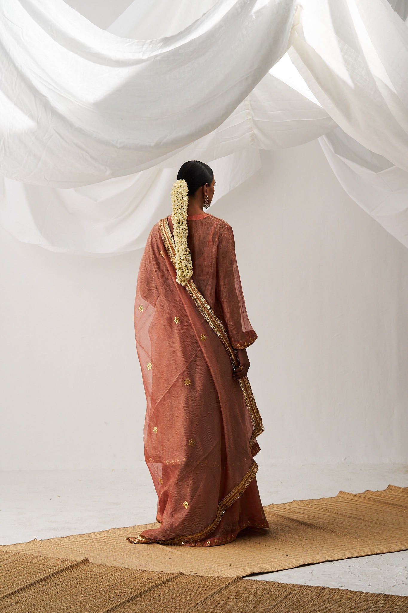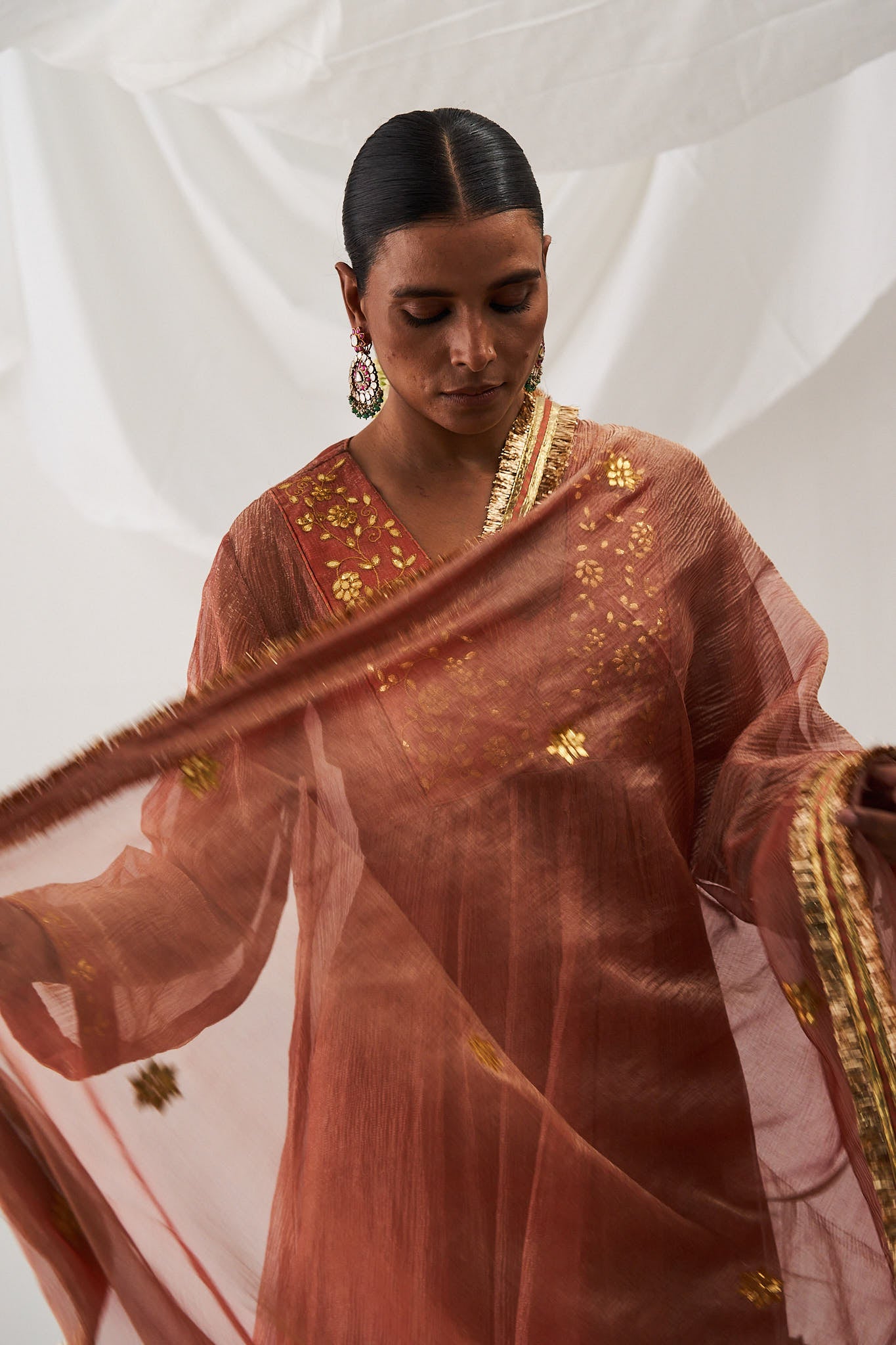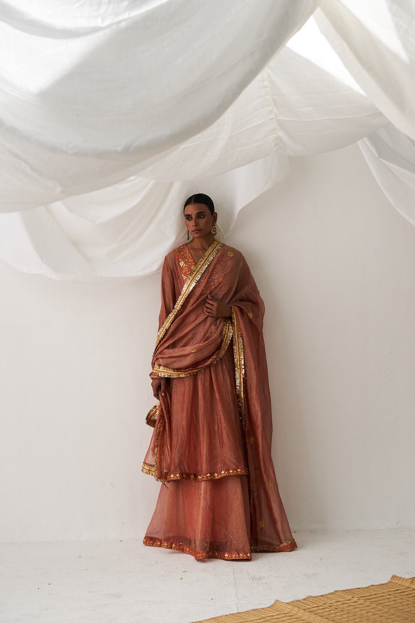 Peach gathered gota patti embroidered kurta paired with bralette, biased skirt and kiran edged dupatta