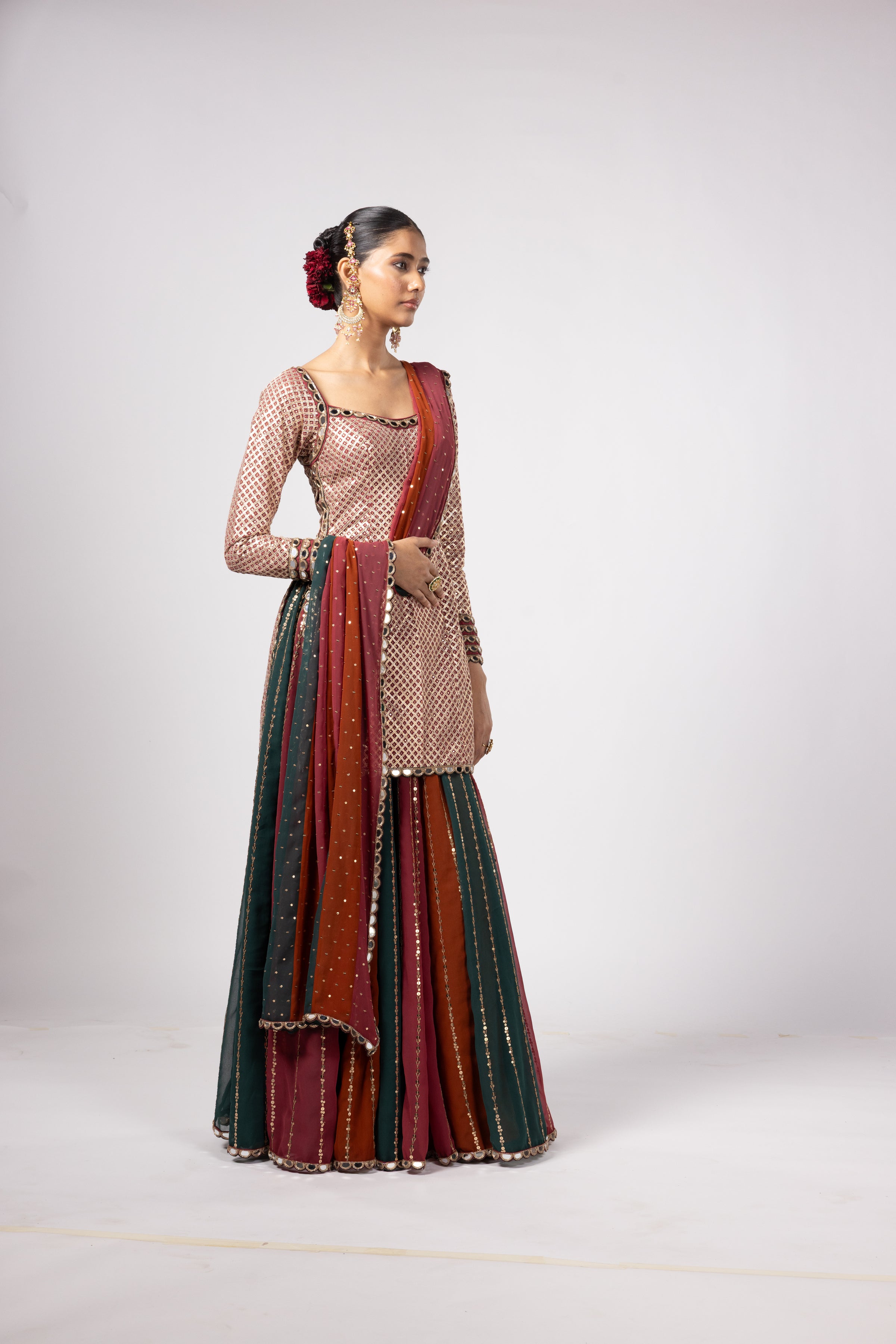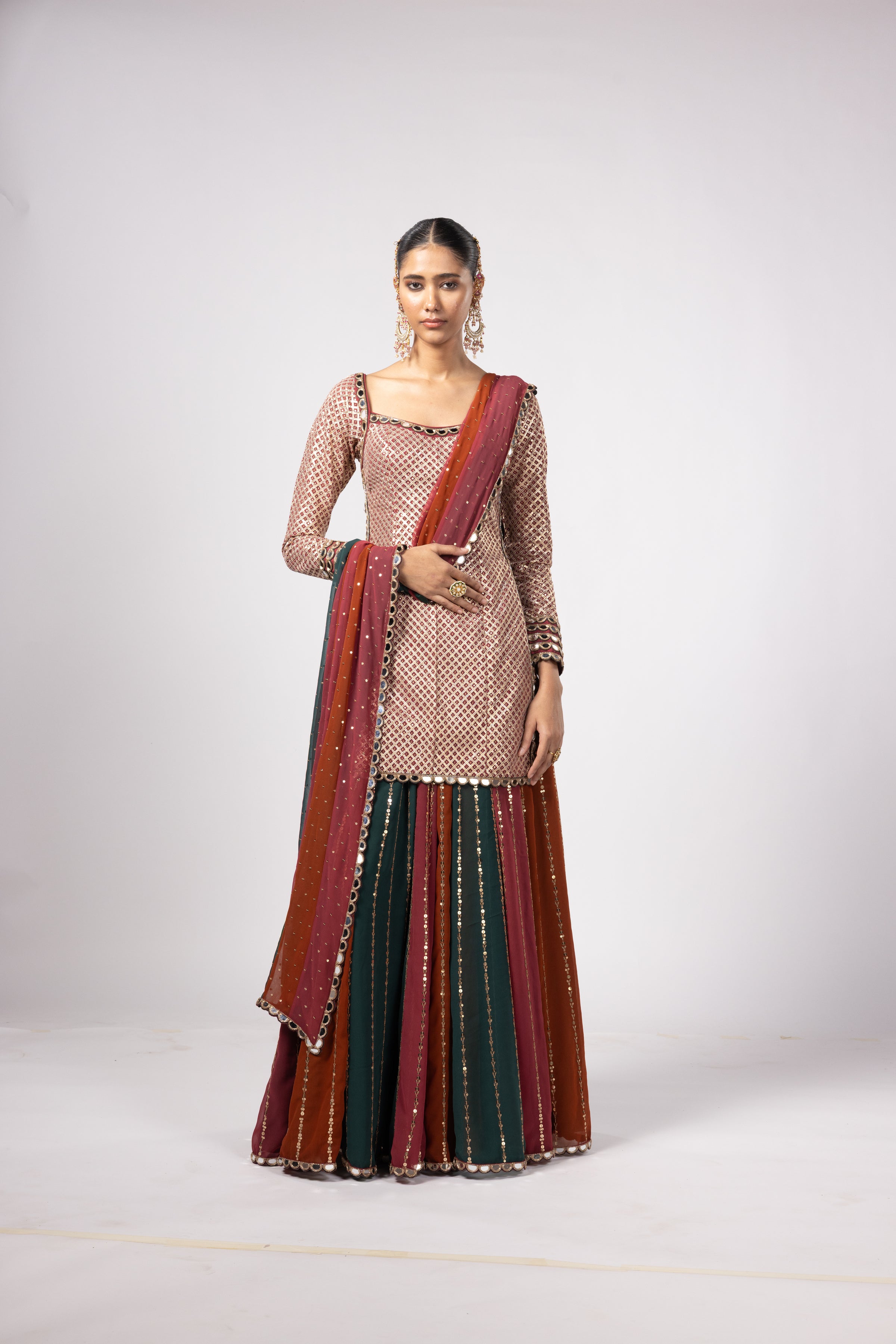 A vibrant multicolor lehenga pants set in jade green, rust, and cranberry tones, adorned with linear sequins embroidery, paired with a kurta.