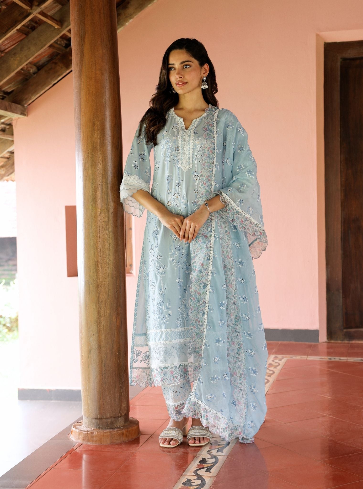 This powder blue cotton kurta set is a breath of fresh air for your summer wardrobe. The kurta’s delicate tonal floral motifs exude a serene and feminine vibe. Intricate lace detailing adorn the neckline and sleeves. Made from lightweight cotton, it promises breathability and ease, making it perfect for warm days.