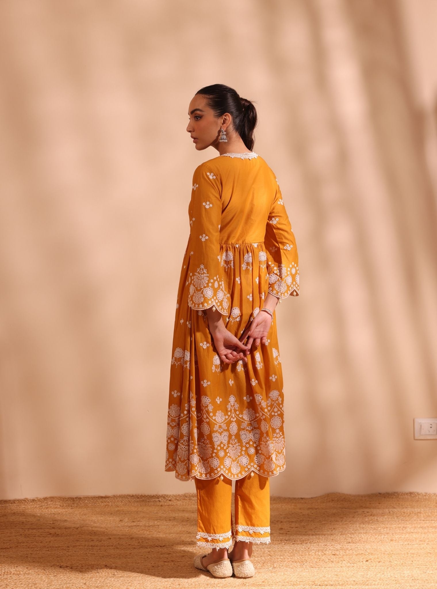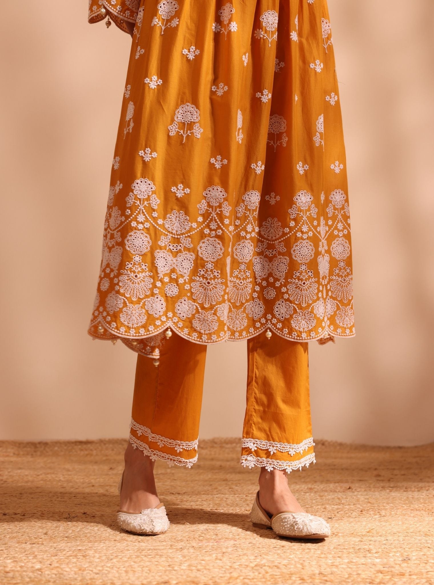 Step into summer with this radiant orange cotton Anarkali set - a celebration of vibrant hues and breezy comfort. The Anarkali, crafted from soft and breathable cotton, features intricate white thread embroidery, bringing a refreshing contrast to the warm base. The V-neckline and scalloped sleeves are adorned with delicate lace accents and embroidery. The empire waistline flows into a flared hem, ensuring ease of movement and a flattering fit for sunlit gatherings.