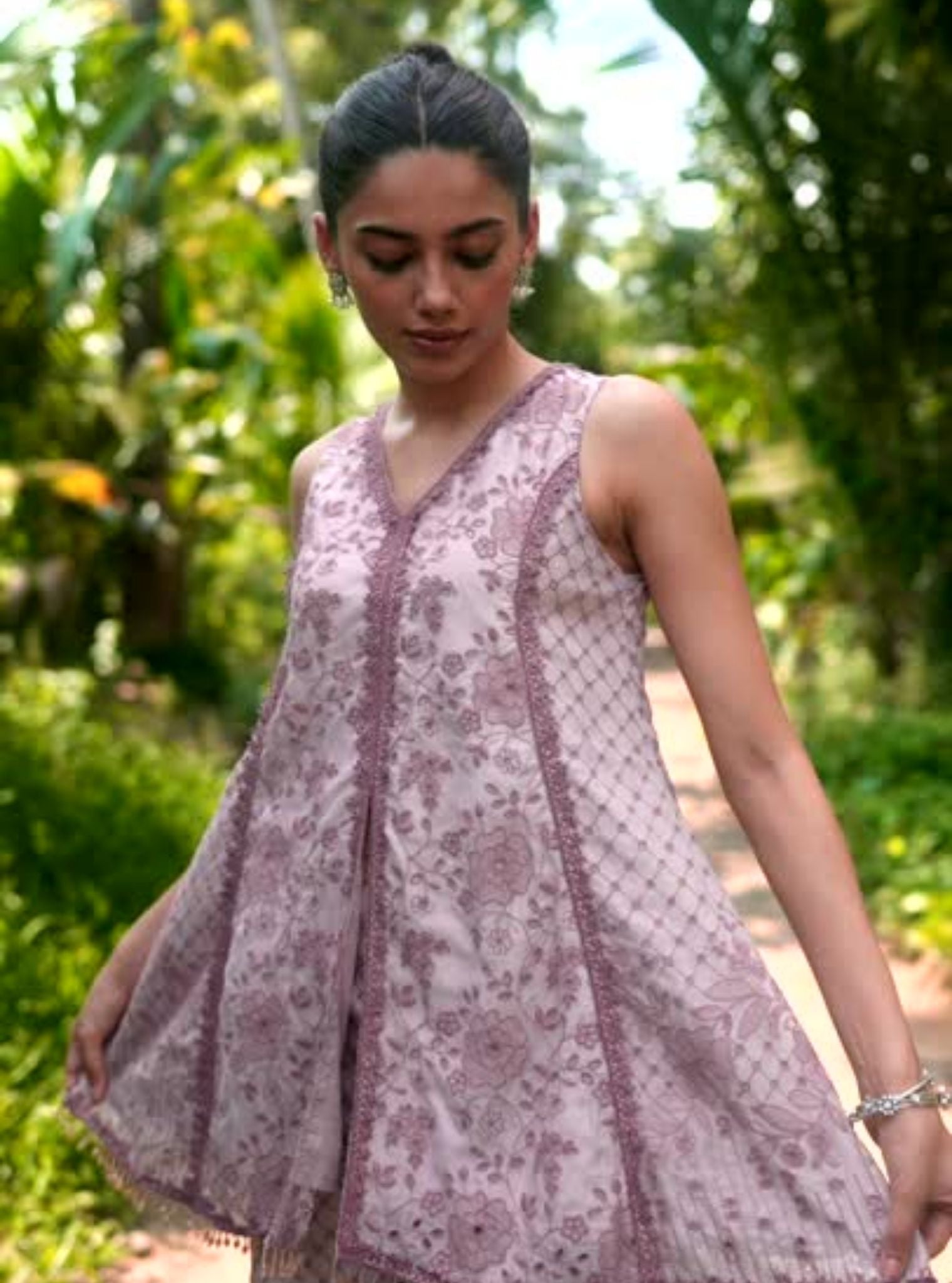 This blush pink co-ord set is a harmonious blend of elegance and modern flair, designed for those who love understated sophistication. The sleeveless kurta features a V-neckline and is adorned with delicate tonal jaal and floral embroidery. The flowy silhouette is enhanced by a charming tassel trim, adding a playful yet refined touch. Paired with the top are the flared pants, which feature a captivating mix of jaal and floral embroidery. The pants are finished with matching lace trims.