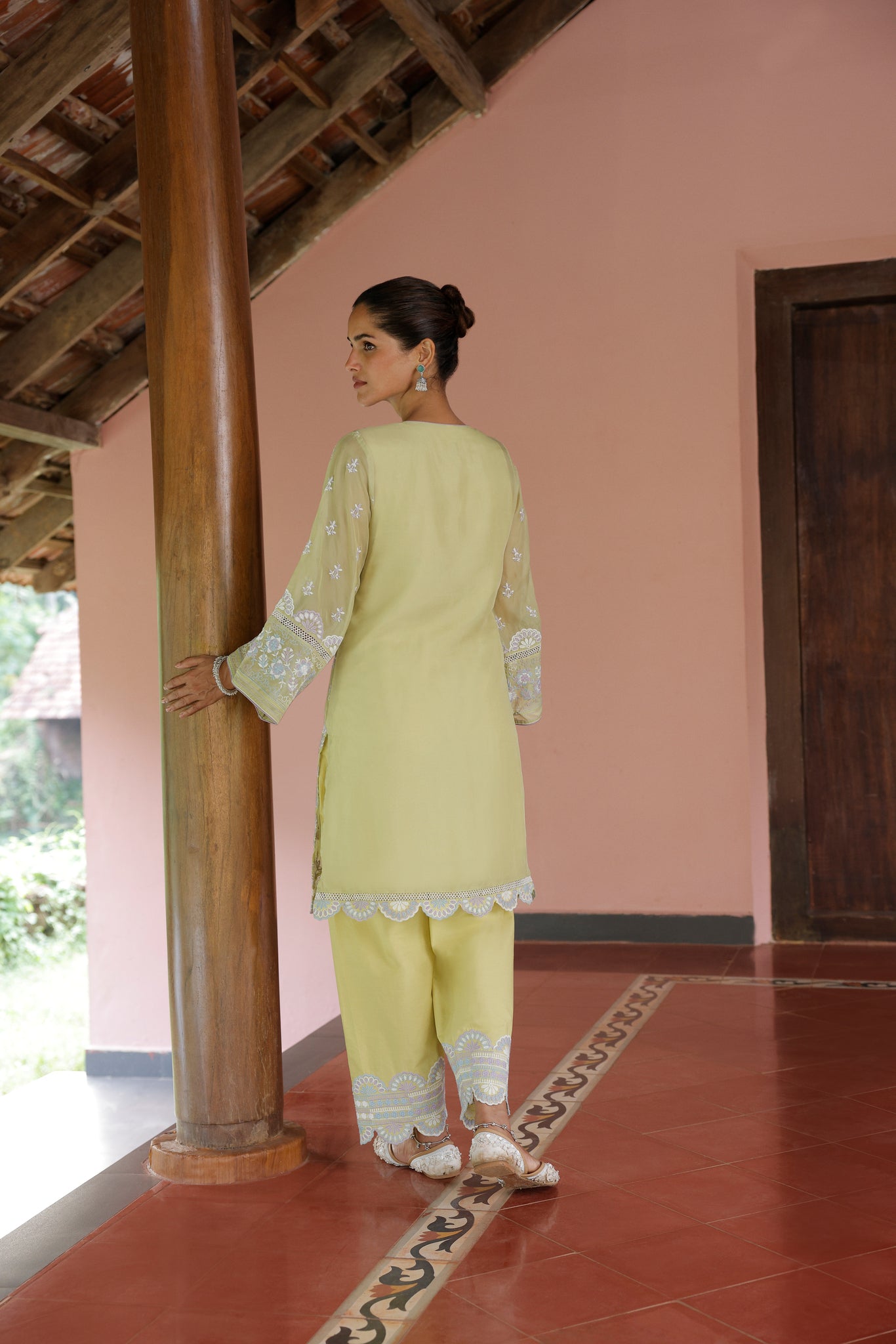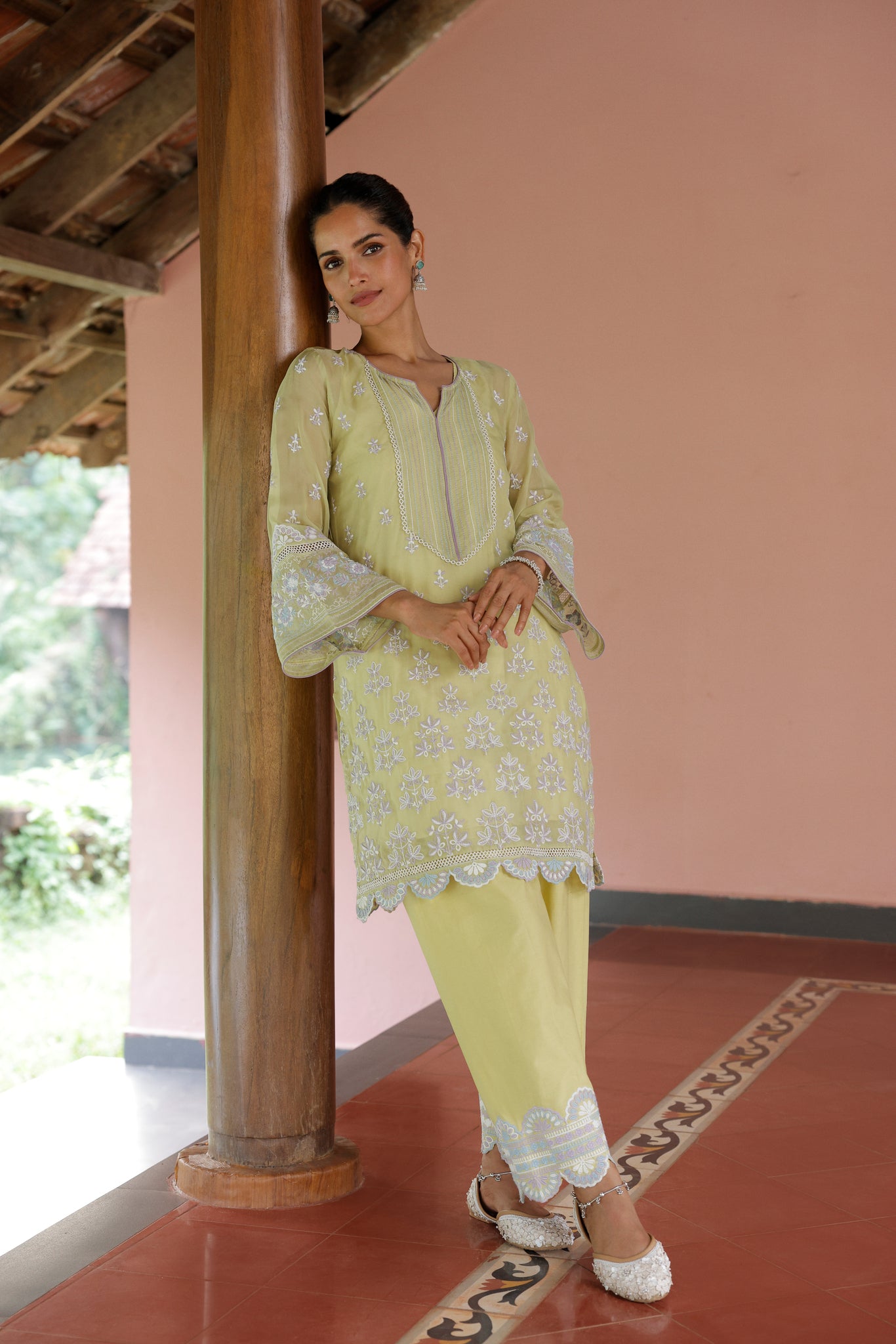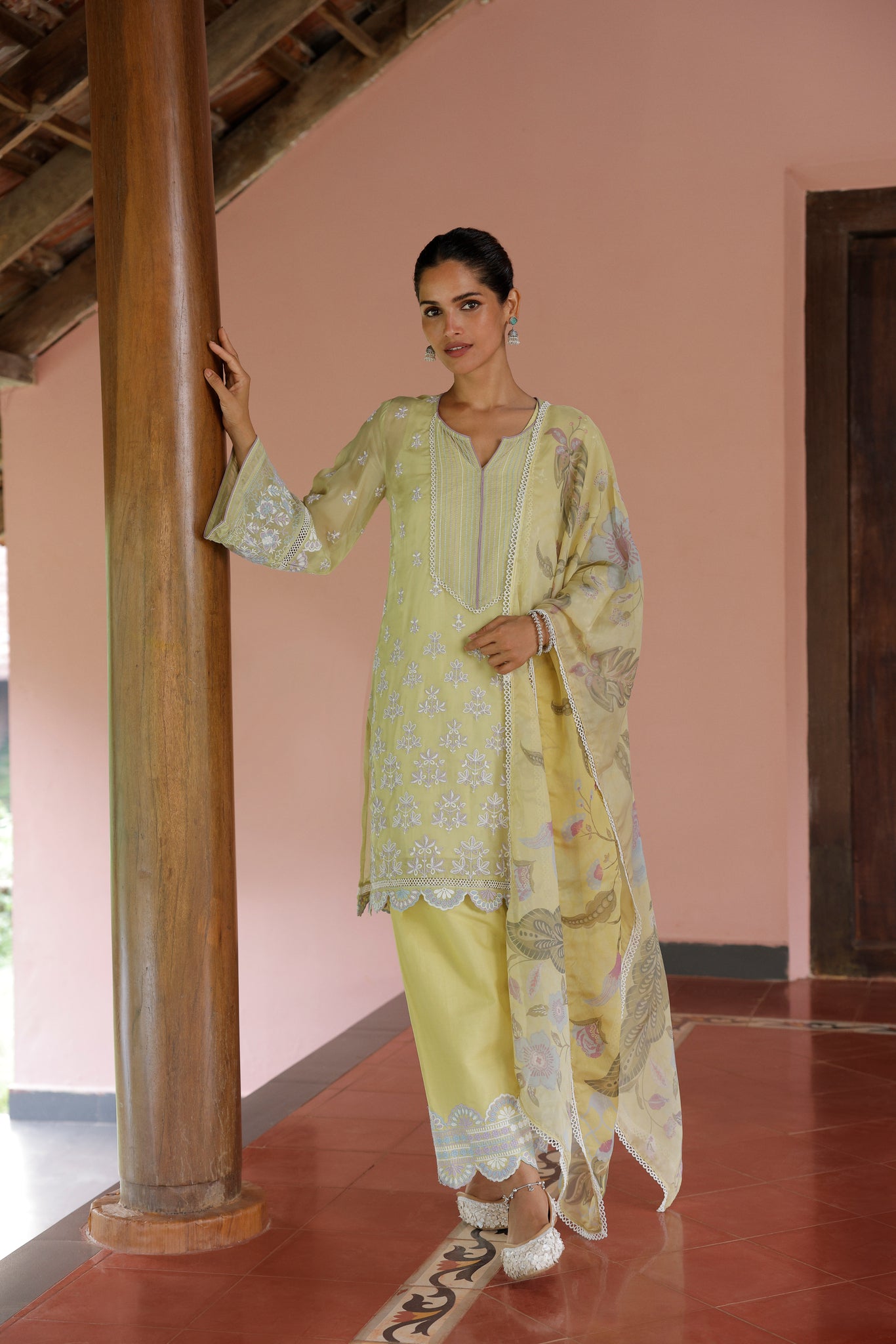 This lime green kurta set is designed to bring effortless grace and sophistication to your wardrobe. Crafted from airy, lightweight organza, the kurta features intricate white and blue embroidery that delicately trails along the bodice and hem, creating a refined, ethereal appeal.