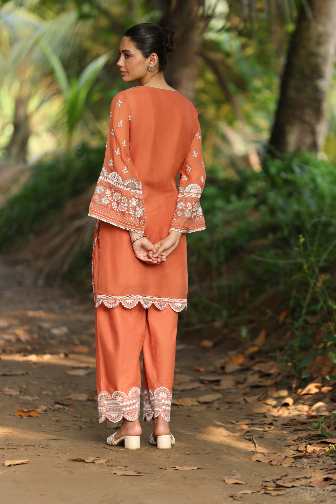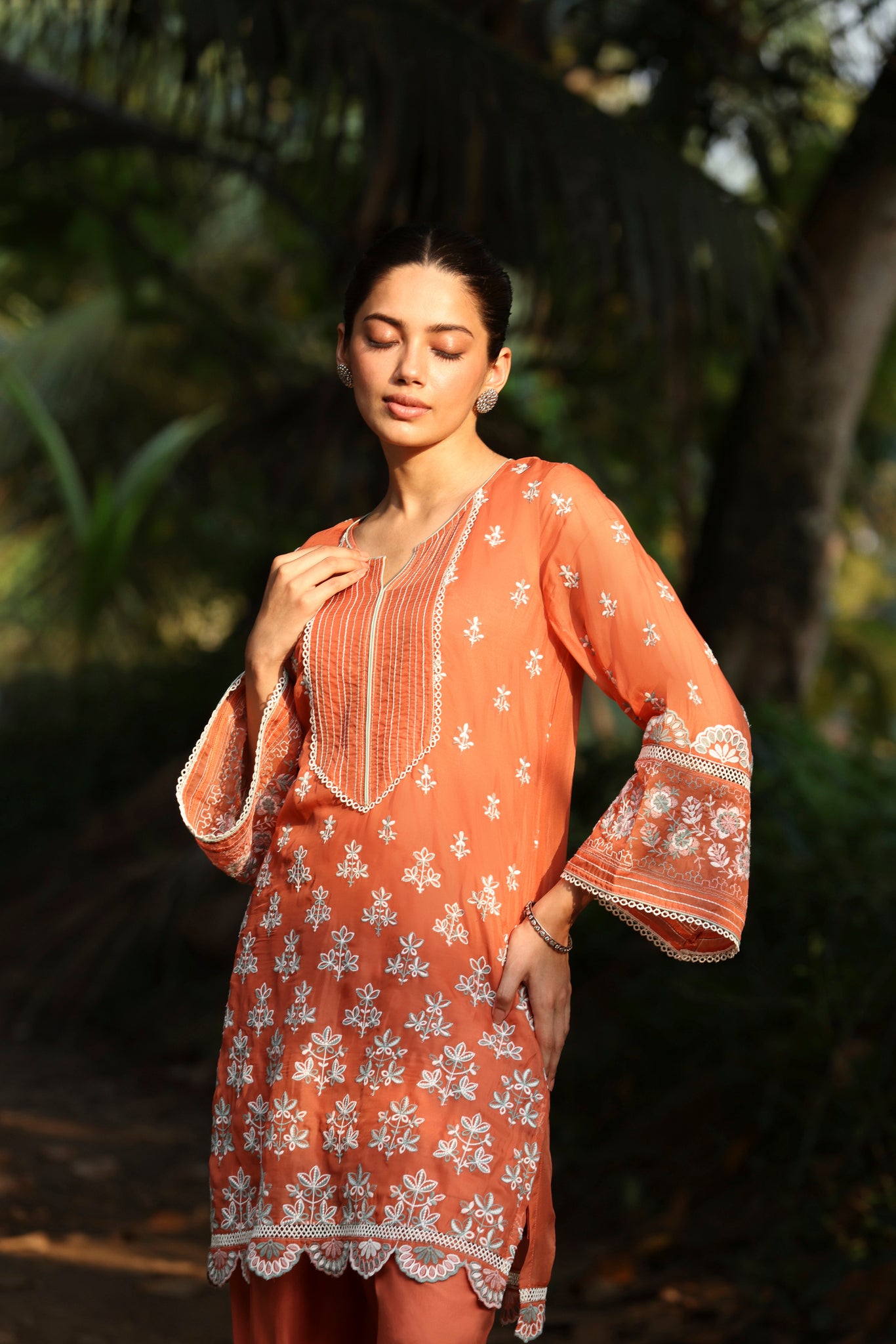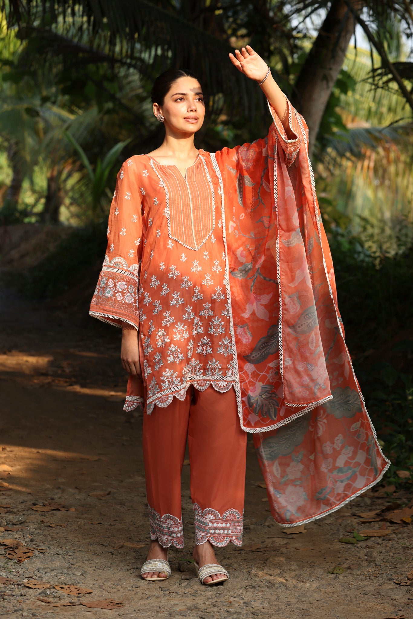 Bask in the warmth of summer with this exquisite terracotta kurta set, a perfect fusion of elegance and breezy comfort. Crafted from lightweight organza, the kurta is adorned with intricate white embroidery that cascades down the bodice and hemline. The notched neckline is adorned with an embroidered yoke. Paired with straight-fit trousers that feature a matching embroidered hem, this set ensures a summer-ready silhouette.