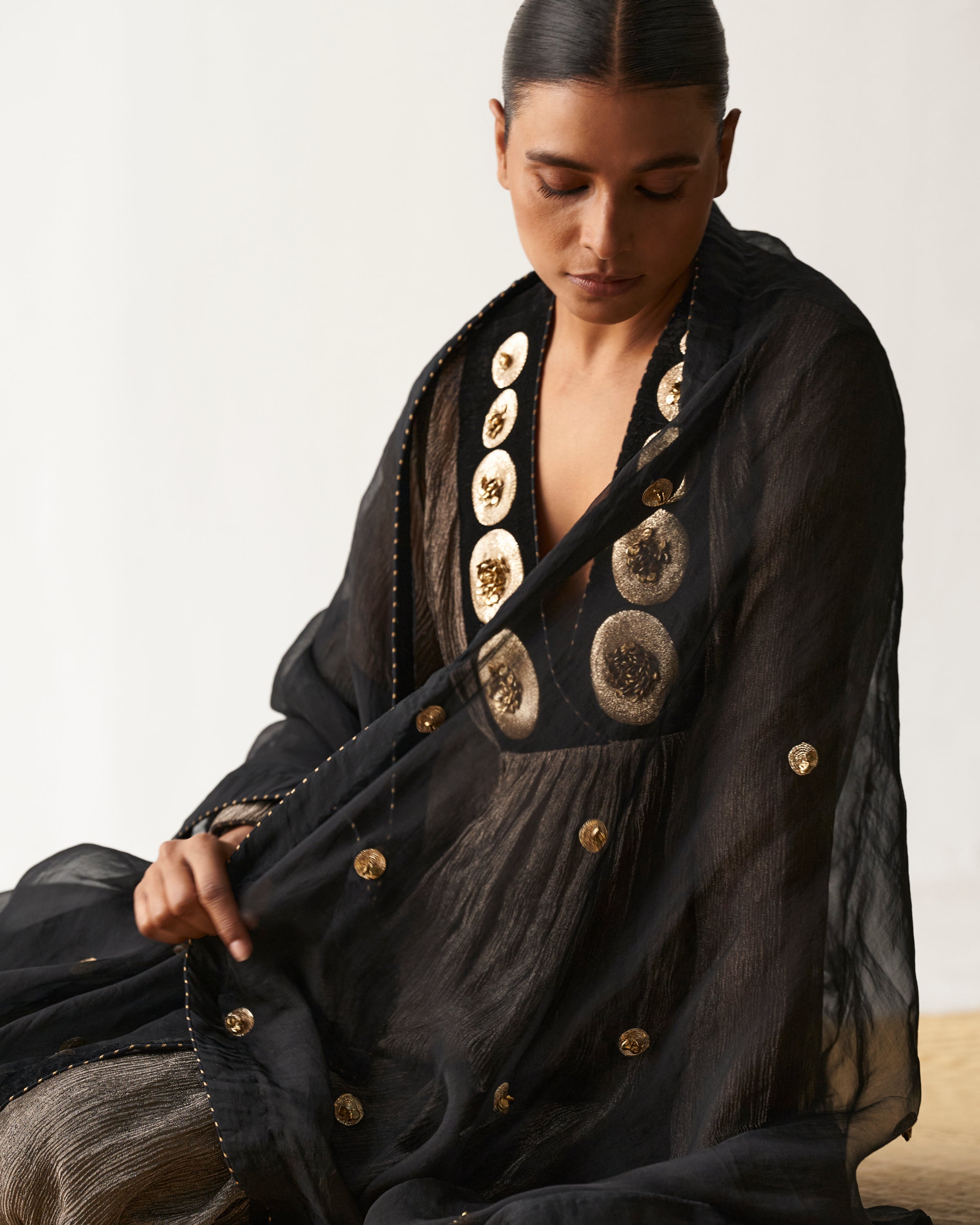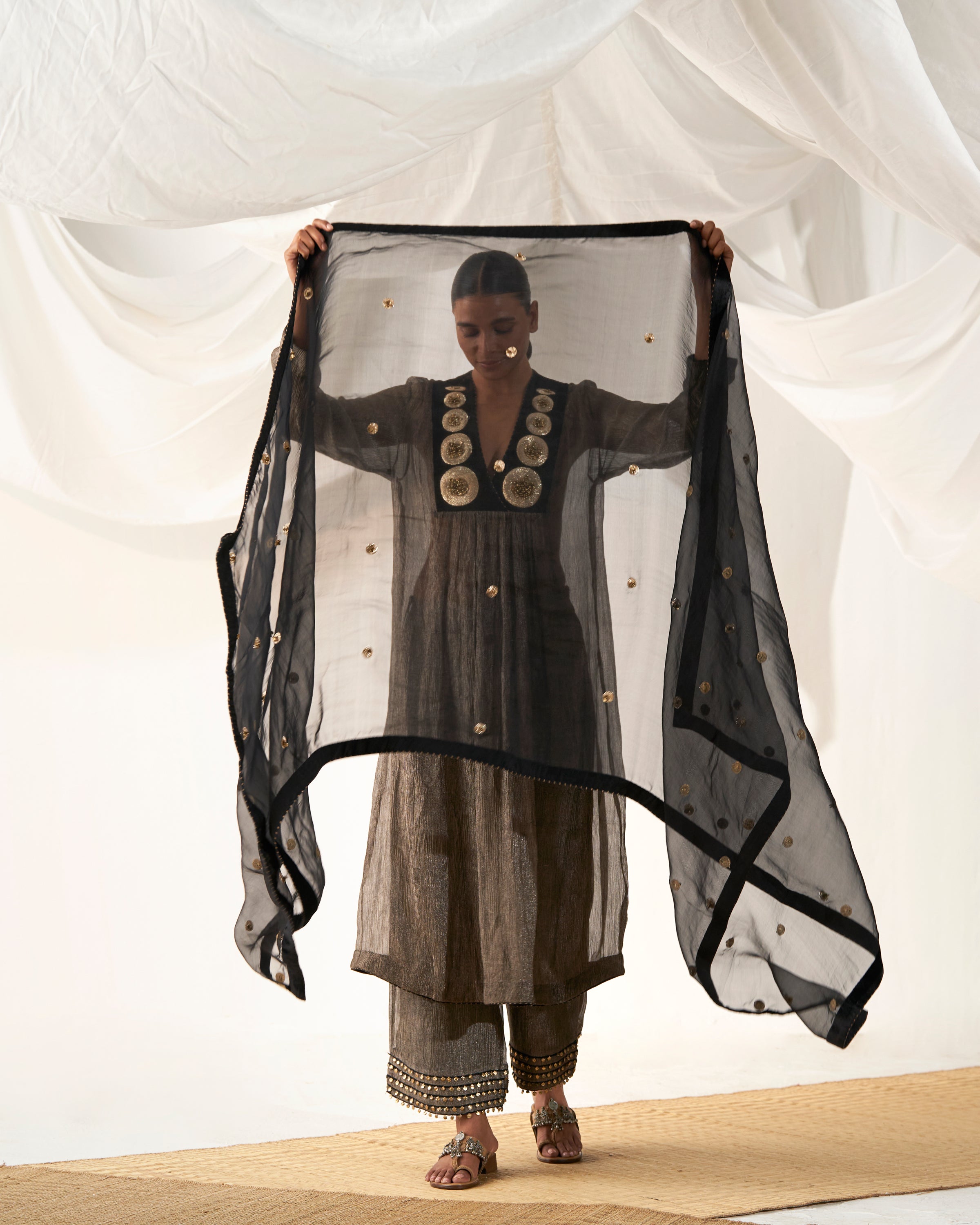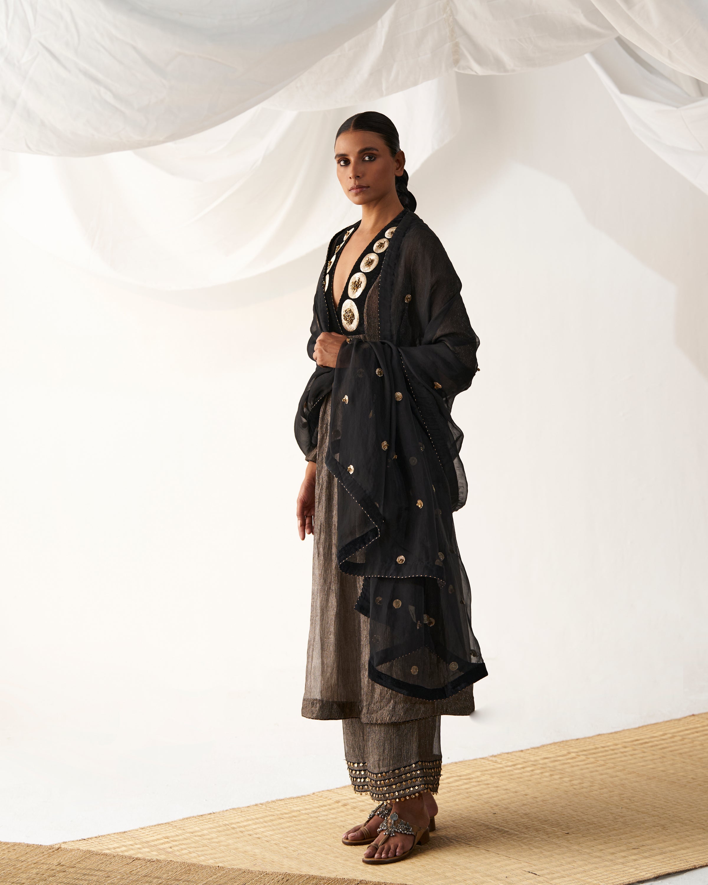 Black kurta with embellished antique dot embroidery on neckline paired with ghunghroo detailed culotte pants and organza dupatta