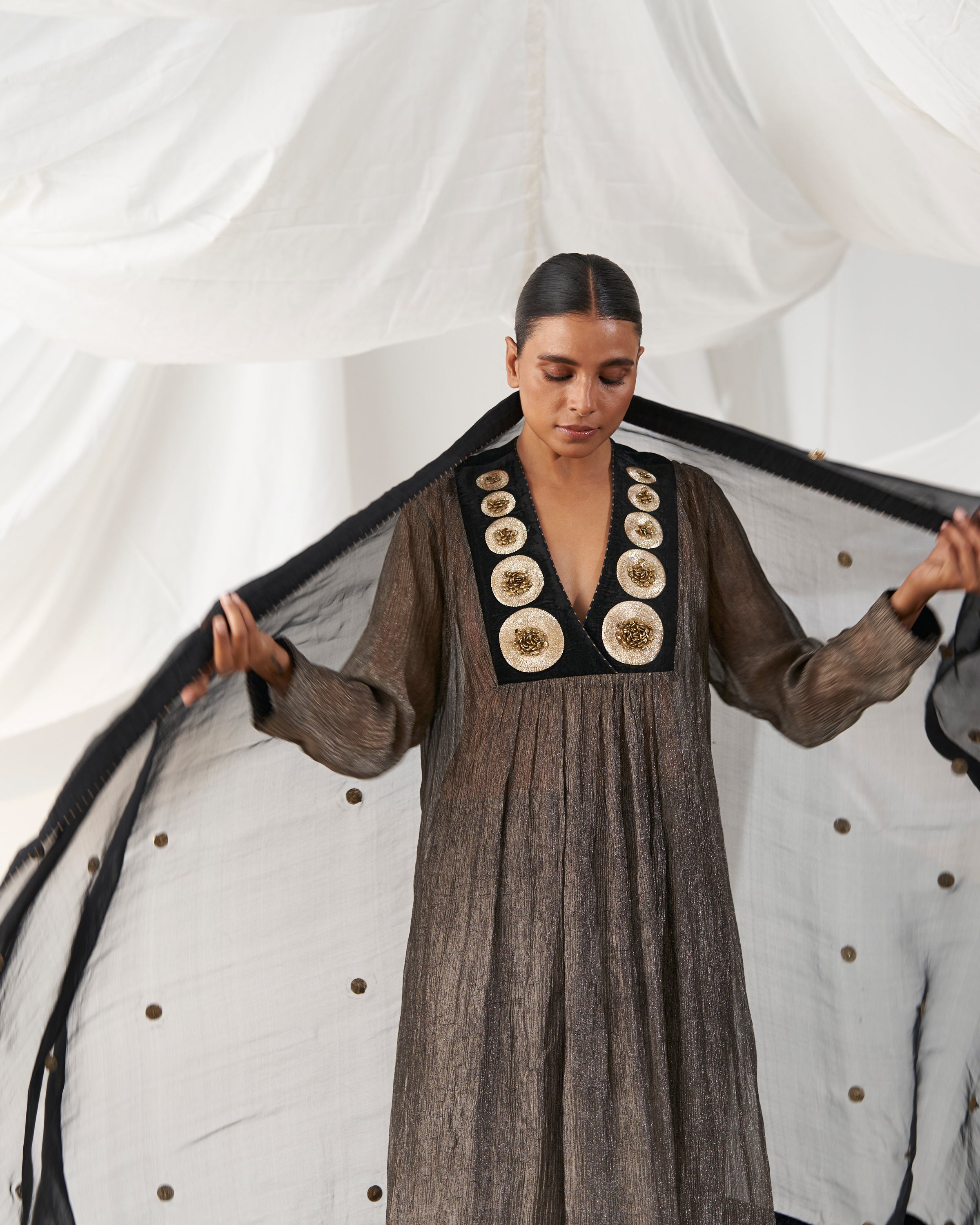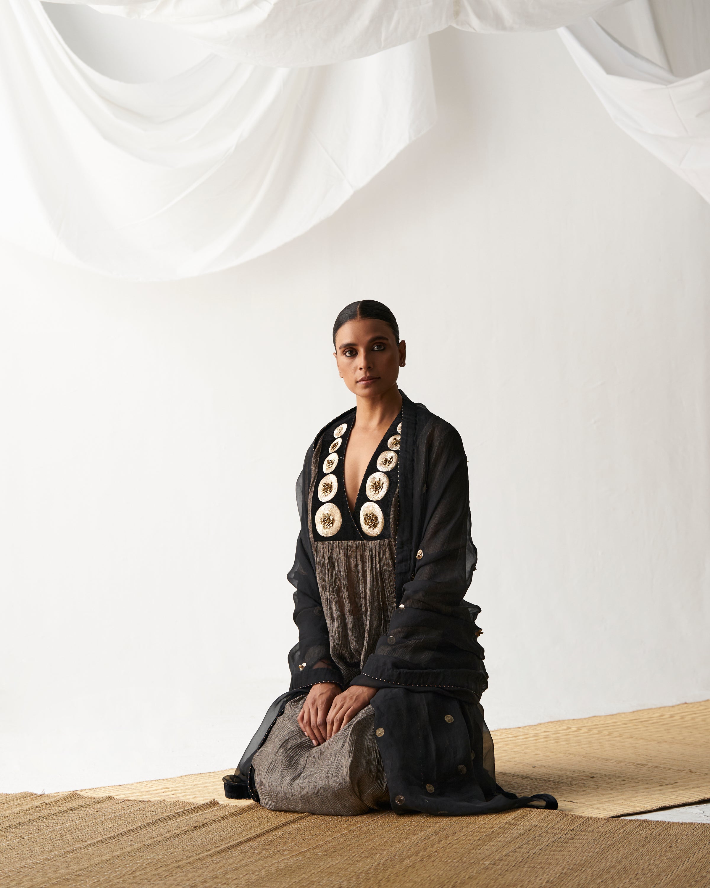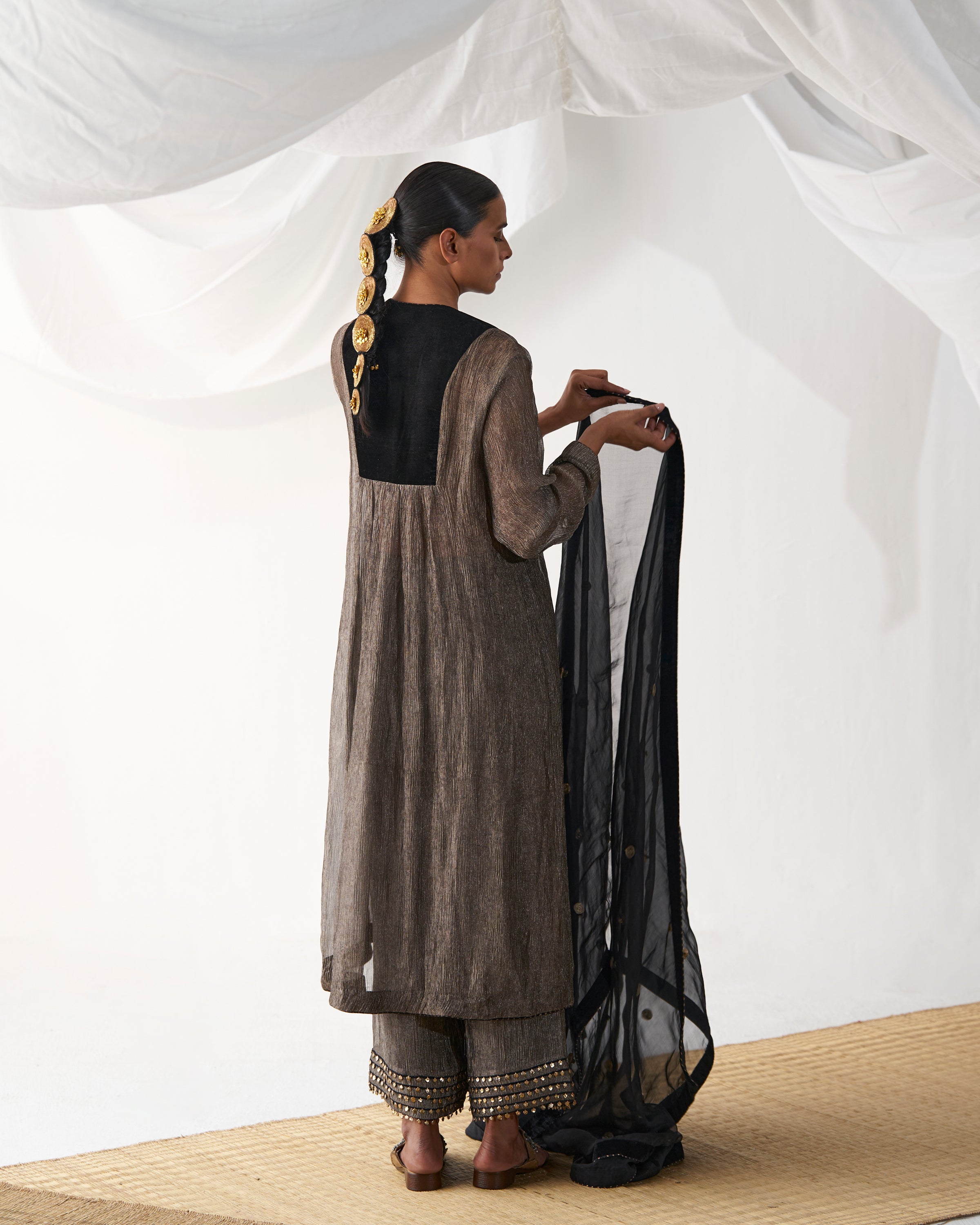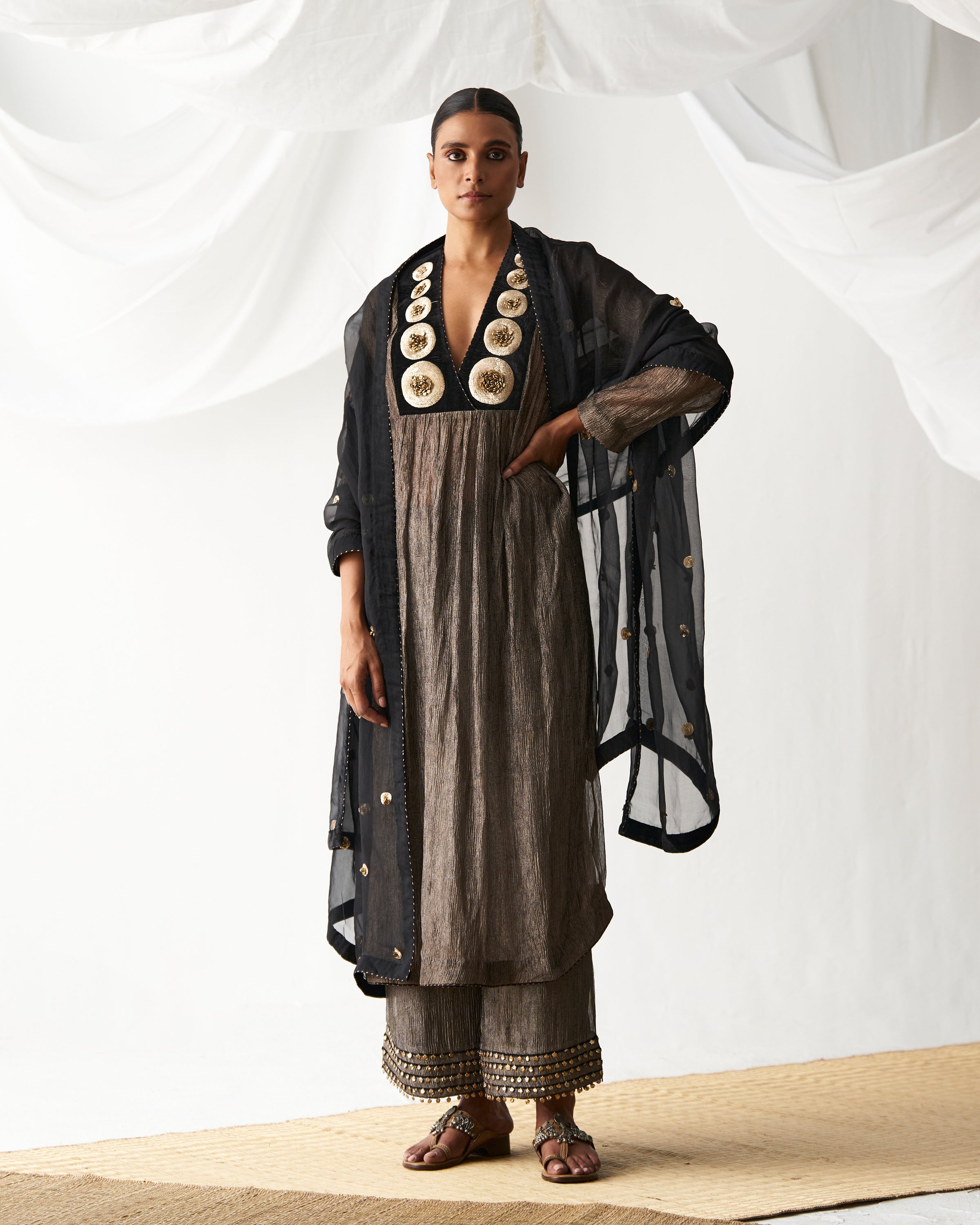 Black kurta with embellished antique dot embroidery on neckline paired with ghunghroo detailed culotte pants and organza dupatta