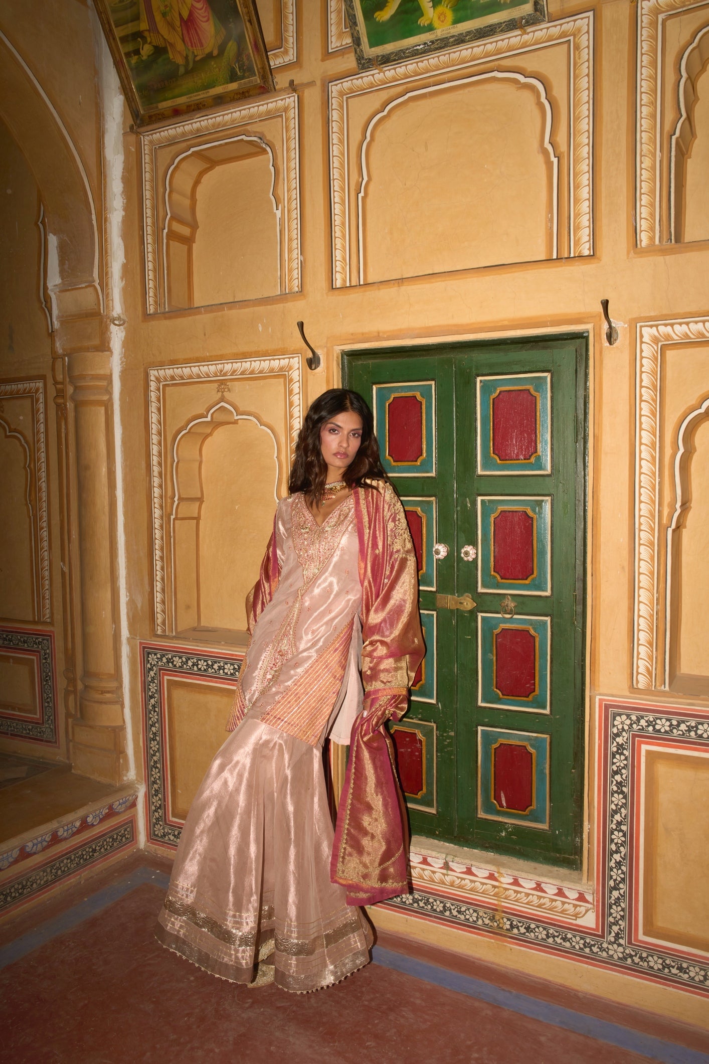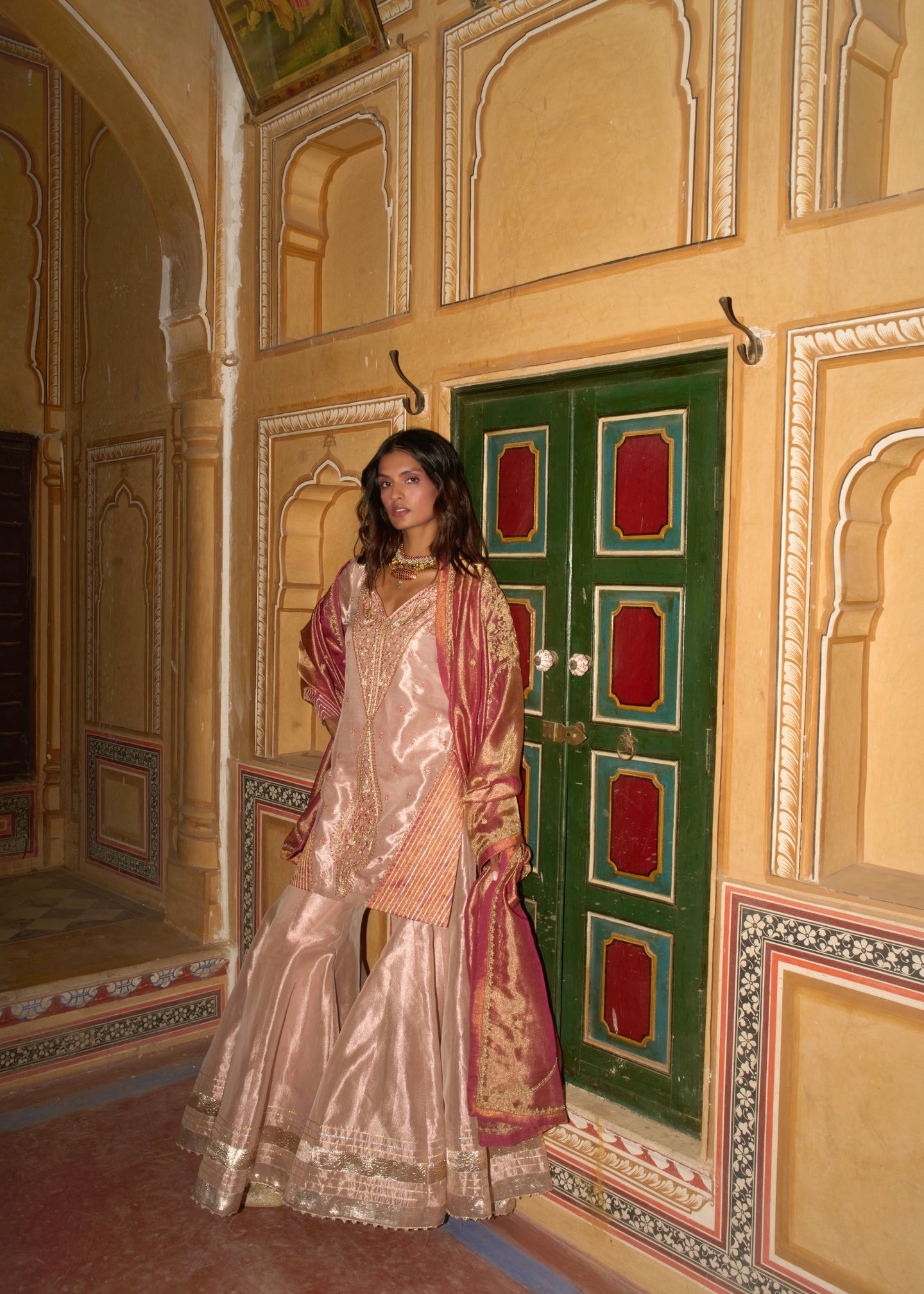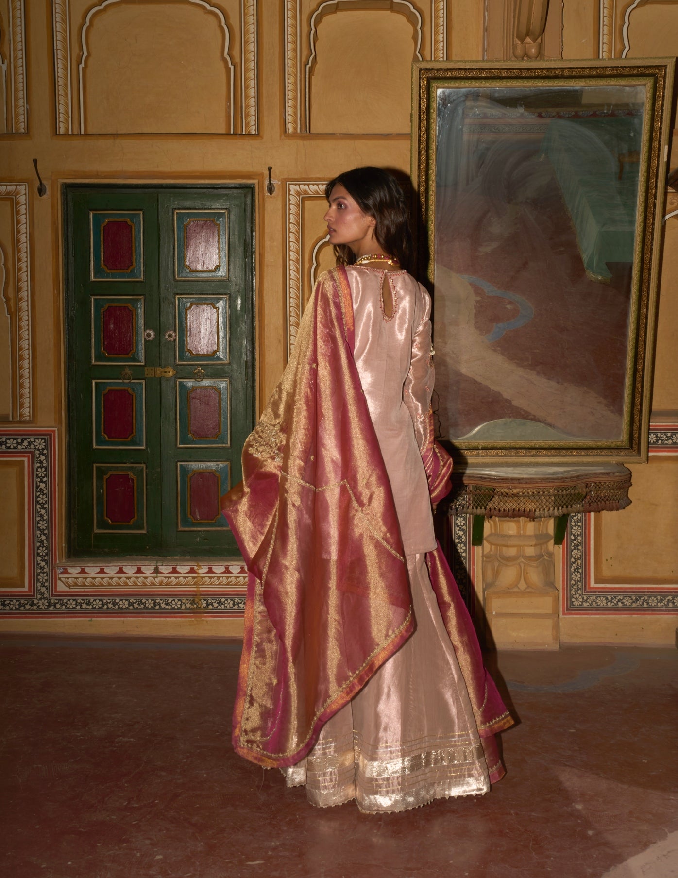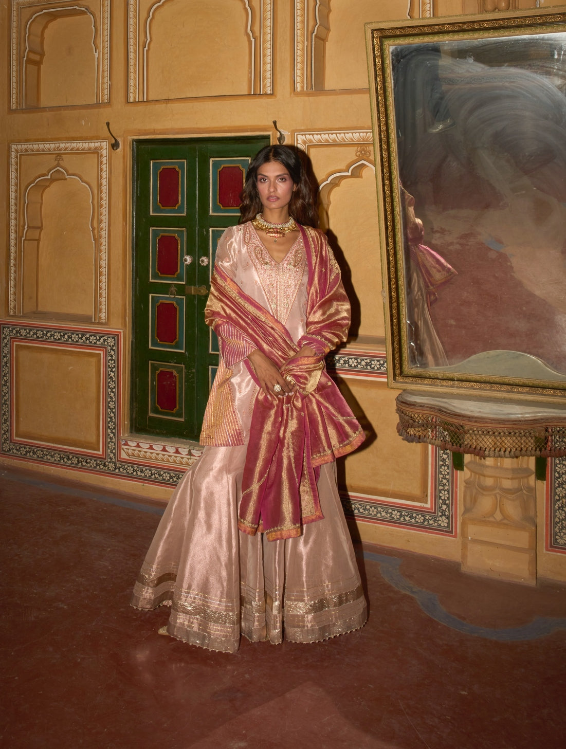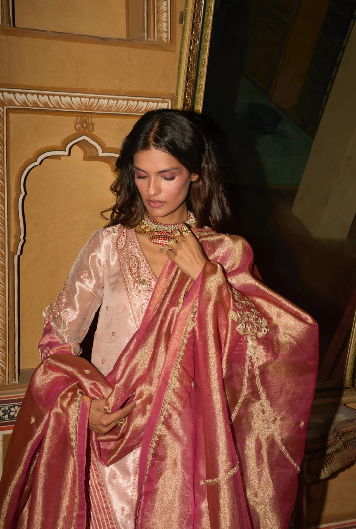 In the soft glow of rose gold, this pure tissue sharara radiates timeless elegance, adorned with intricate detailing and rich gota patti textures. It is gracefully paired with a delicately embroidered short kurta and a vibrant hot pink dupatta, embellished with fine embroidery, shimmering dori work, and subtle sequins - capturing a harmonious blend of tradition and refined allure.