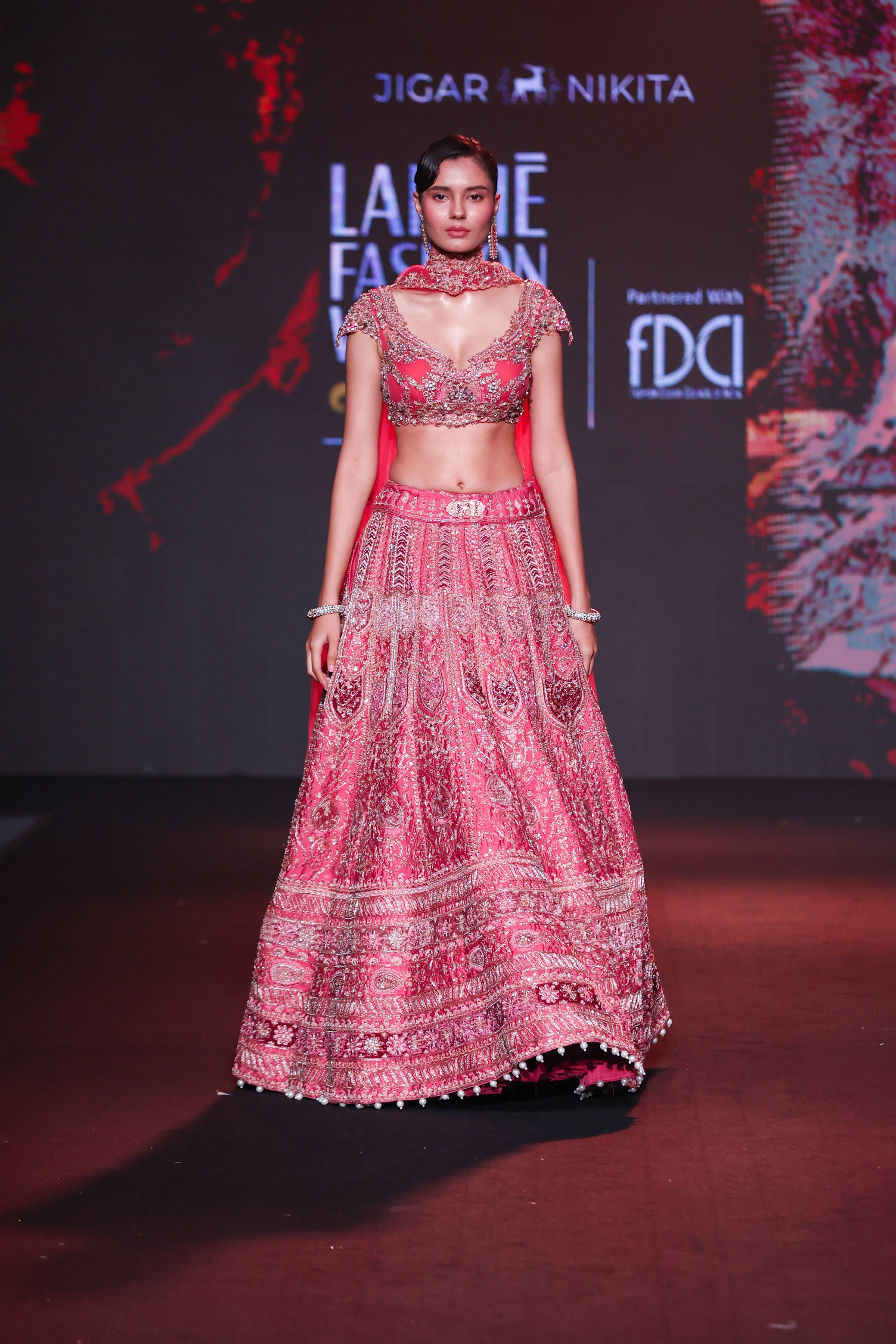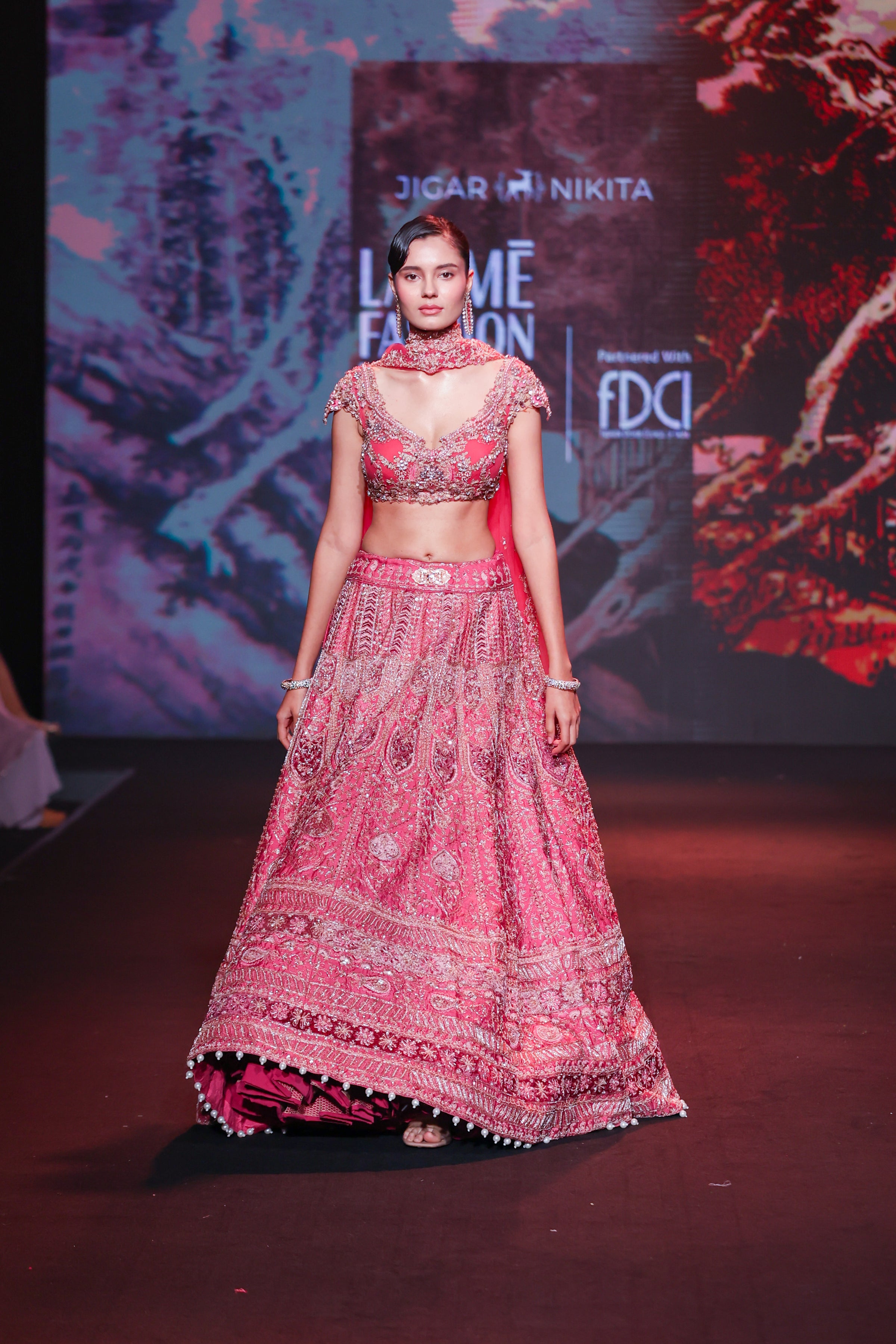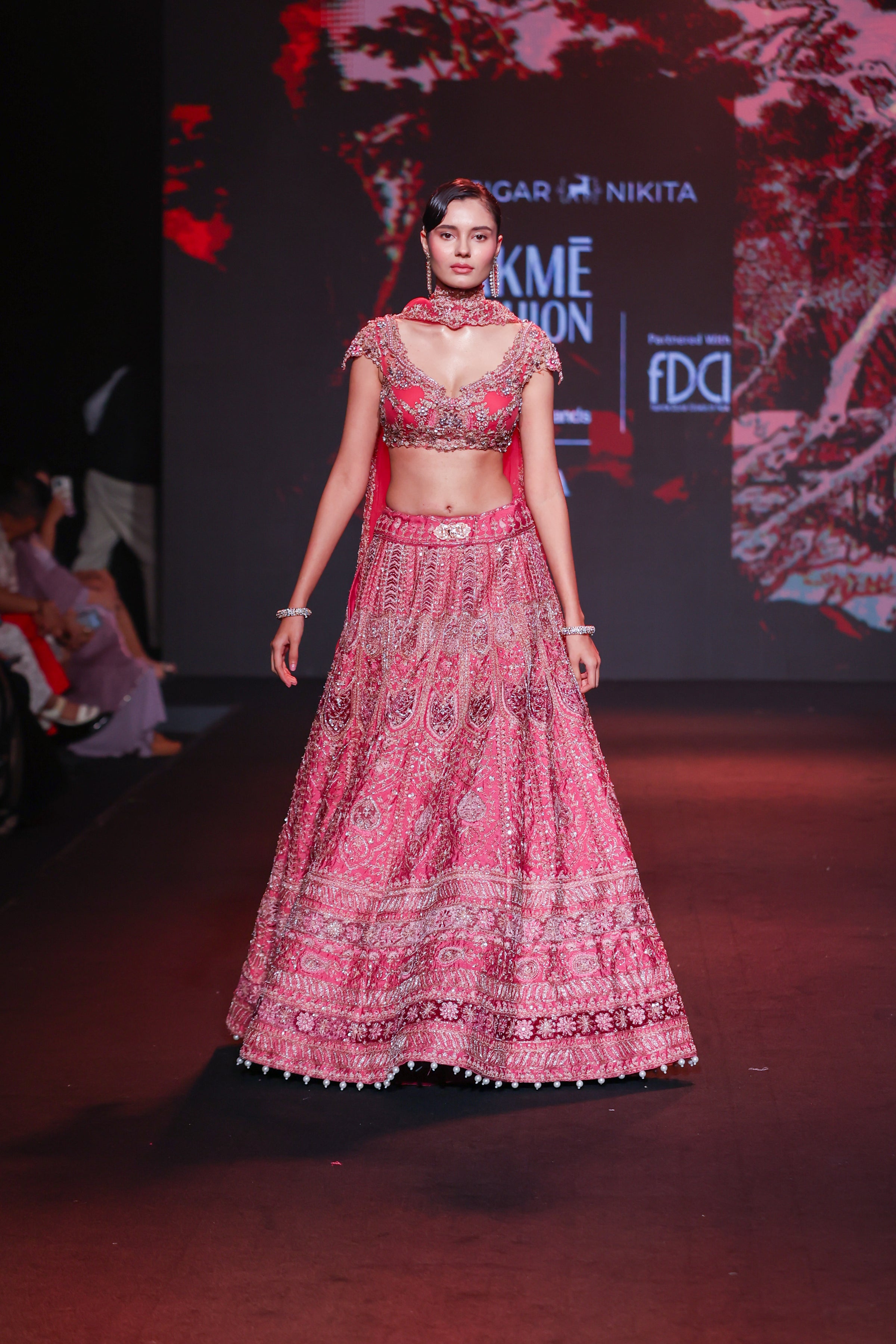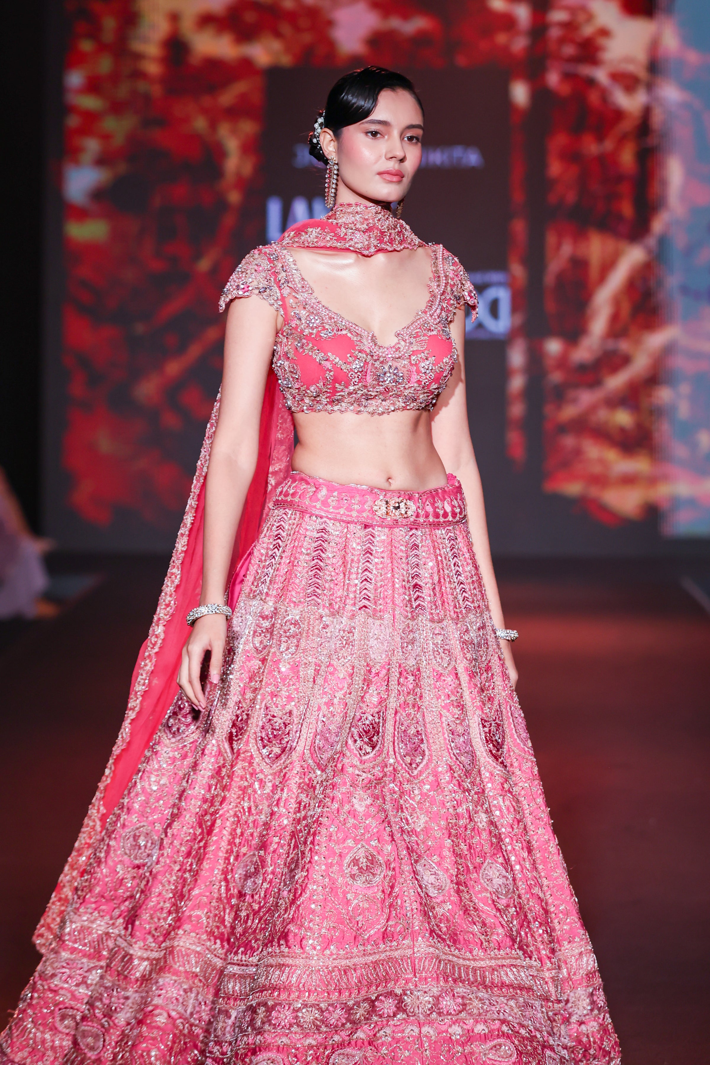 This exquisite lehenga set, drenched in a vibrant rosy hue reminiscent of Pantone Dusky Pink, captures timeless femininity and elegance. Crafted in luxurious raw silk, the lehenga showcases intricate threadwork and sequin embroidery in traditional motifs, creating a radiant and regal visual. The structured blouse features crystal embellishments and delicate scalloped detailing, enhanced by a flattering sweetheart neckline and sculpted fit. Paired with a sheer net dupatta edged in hand-embroidered finesse, this ensemble beautifully blends traditional artistry with contemporary sophistication.