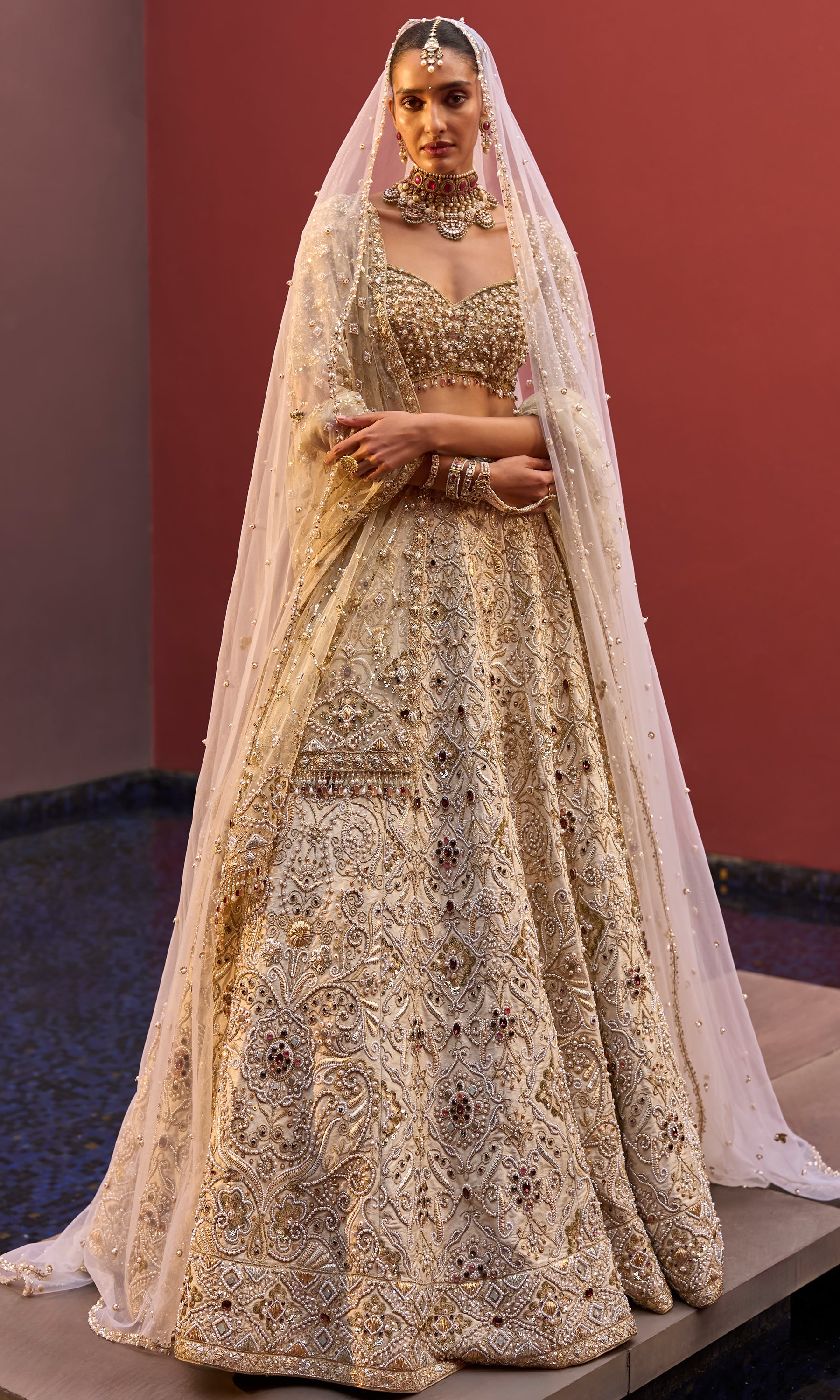 Discover timeless elegance with this Ivory Regal Jeweled Lehenga Set, crafted in premium raw silk and finished in a classic ivory tone. The lehenga features intricate hand-embellishment using pearls, sequins, zari, gemstones, dori, poth, and gota, creating a rich, couture-inspired surface. Perfect for brides seeking a sophisticated and regal statement look.