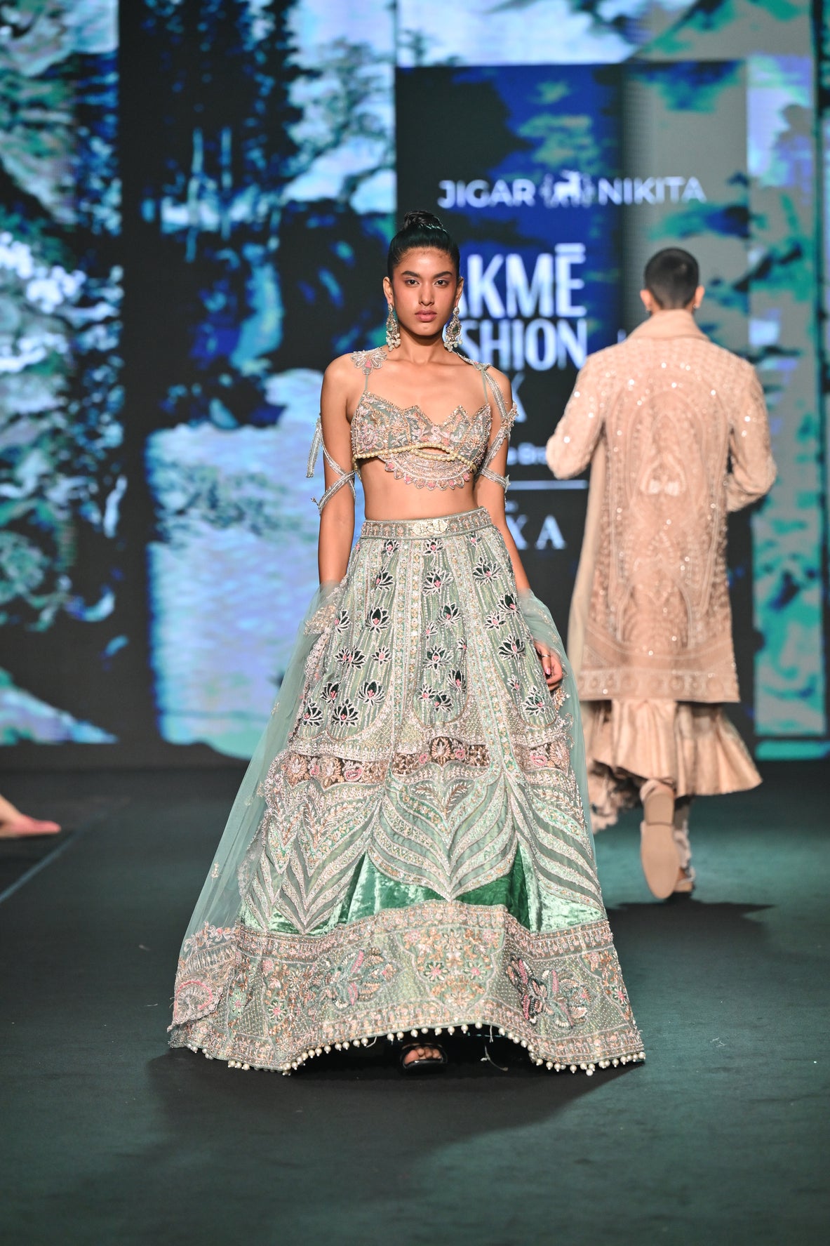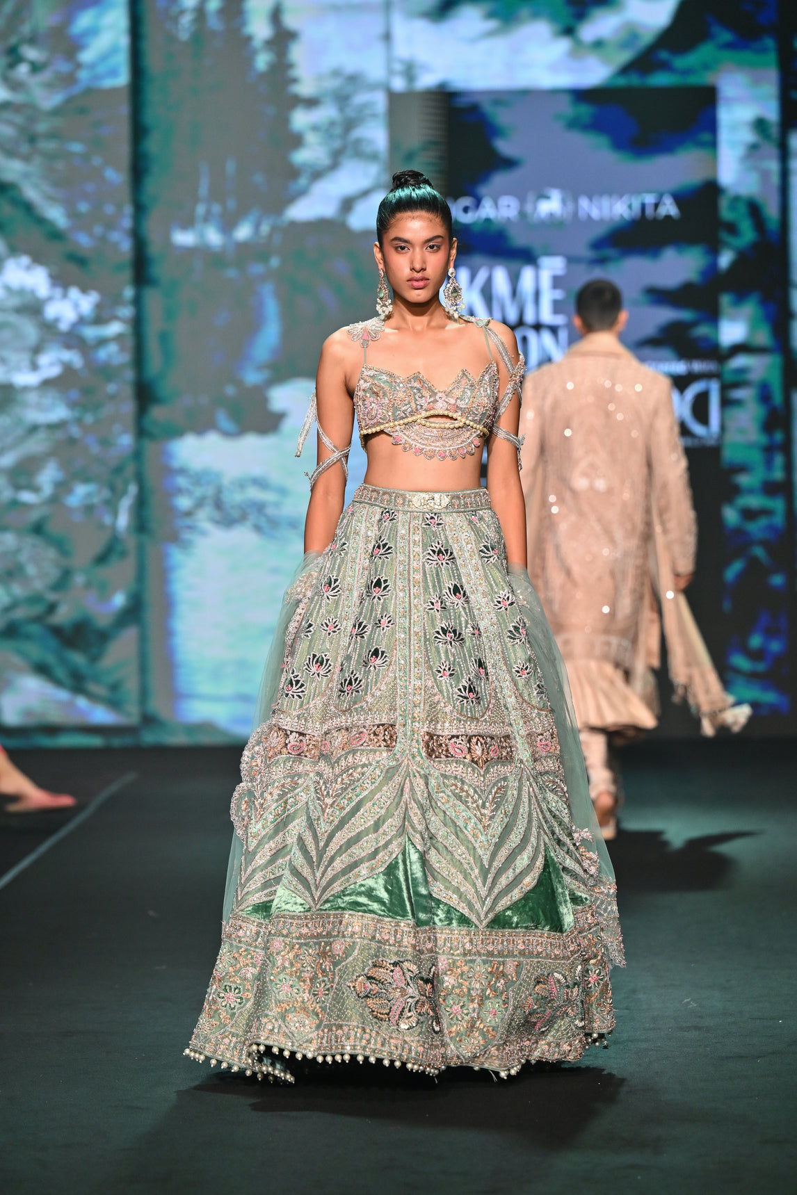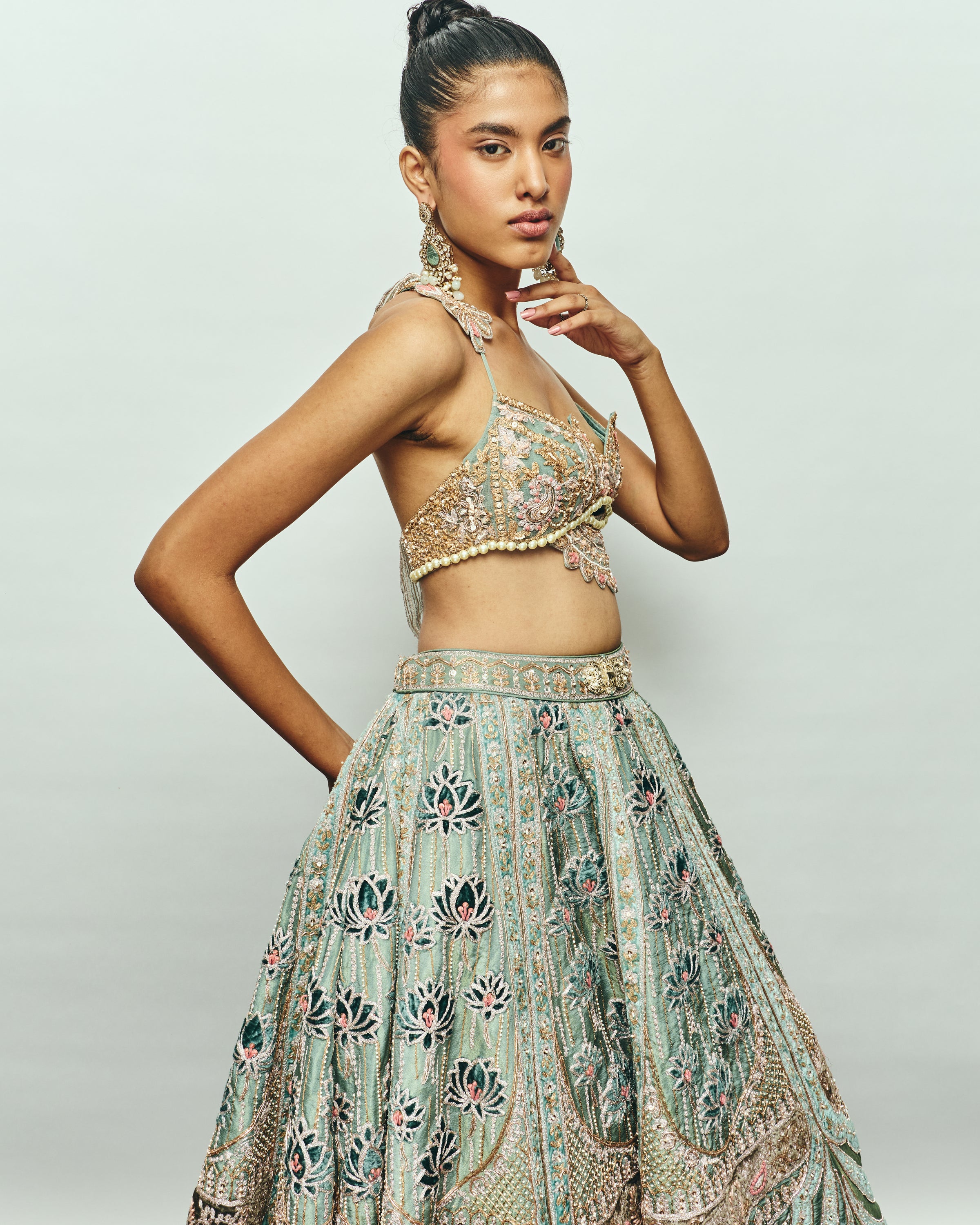 Crafted on a luminous shimmer tissue base, this exquisite lehenga embodies modern opulence with traditional artistry. The ensemble features intricate velvet appliqués gracefully spread across the silhouette, highlighted by striking lotus motifs that add depth and dimension. Each velvet patch reflects subtle teal hues, creating a captivating interplay of colour and texture. The blouse stands out with its distinctive lotus-inspired shape, meticulously adorned with velvet detailing that mirrors the lehenga’s design language. Completing the look is a contemporary dupatta with pointed edges, adding a bold and modern twist to this couture masterpiece.