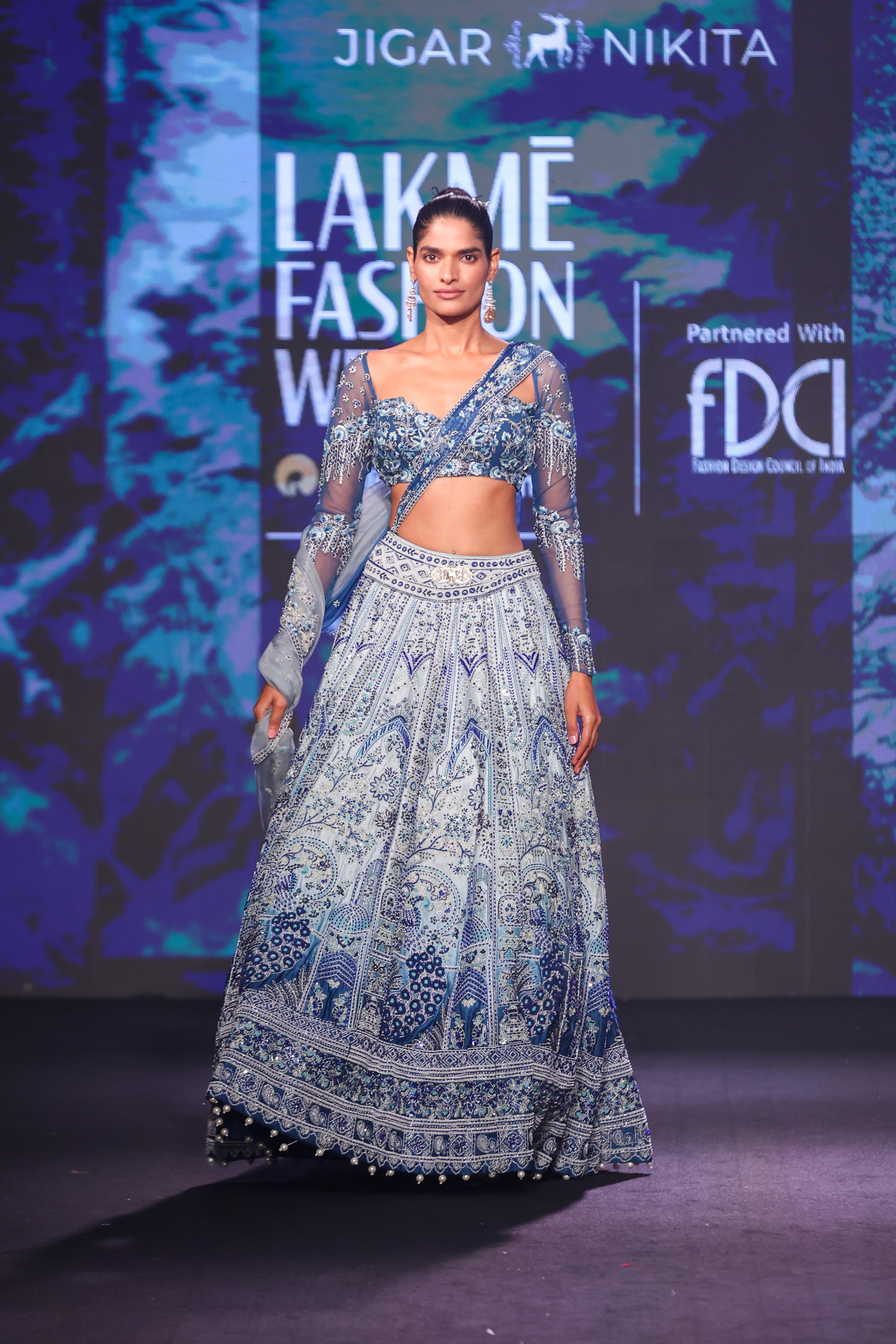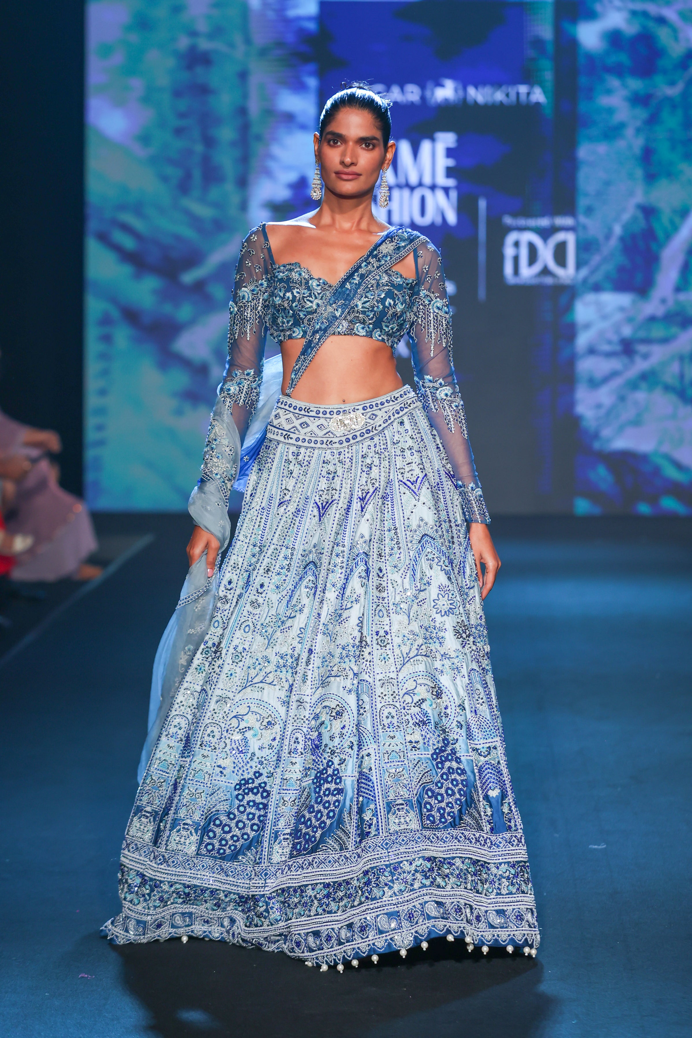 An artistic symphony of colour and craftsmanship, this breathtaking lehenga set transitions beautifully from pristine white to a serene French blue, creating a mesmerizing ombré effect. Each panel is intricately embroidered in tonal blue hues, featuring resham, zari, sequin, and kutdana work—blending traditional detailing with refined sophistication. The lehenga is adorned with majestic peacock motifs, symbolizing grace and grandeur, meticulously hand-embroidered across the ensemble. The harmonious play of texture and tone lends depth and dimension, making it a true statement of couture artistry. A timeless celebration of elegance and craftsmanship, this piece is perfect for modern brides and festive soirées alike.