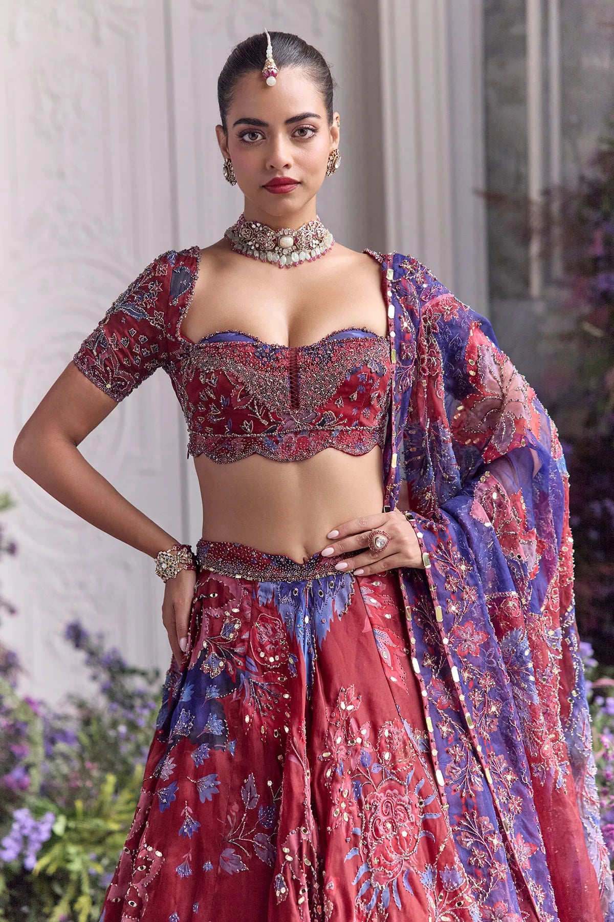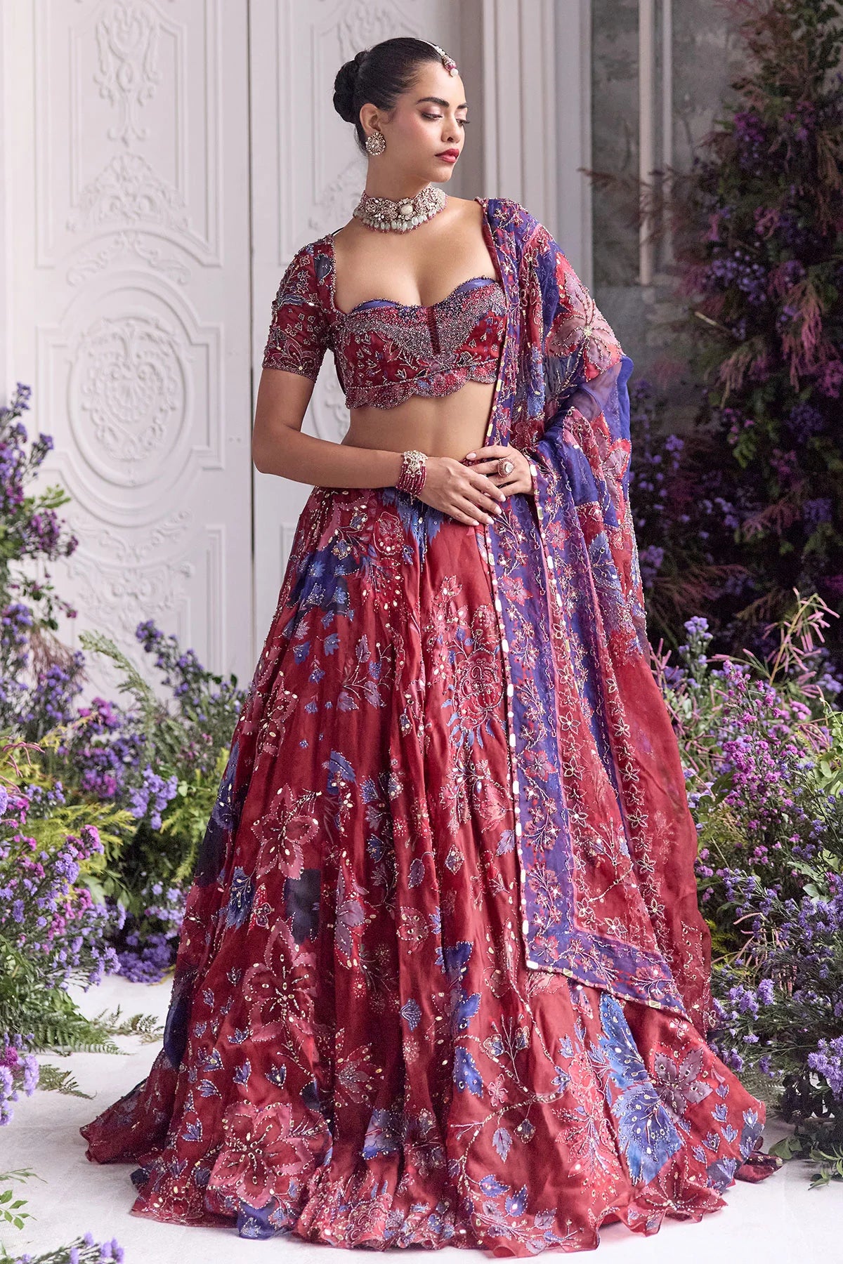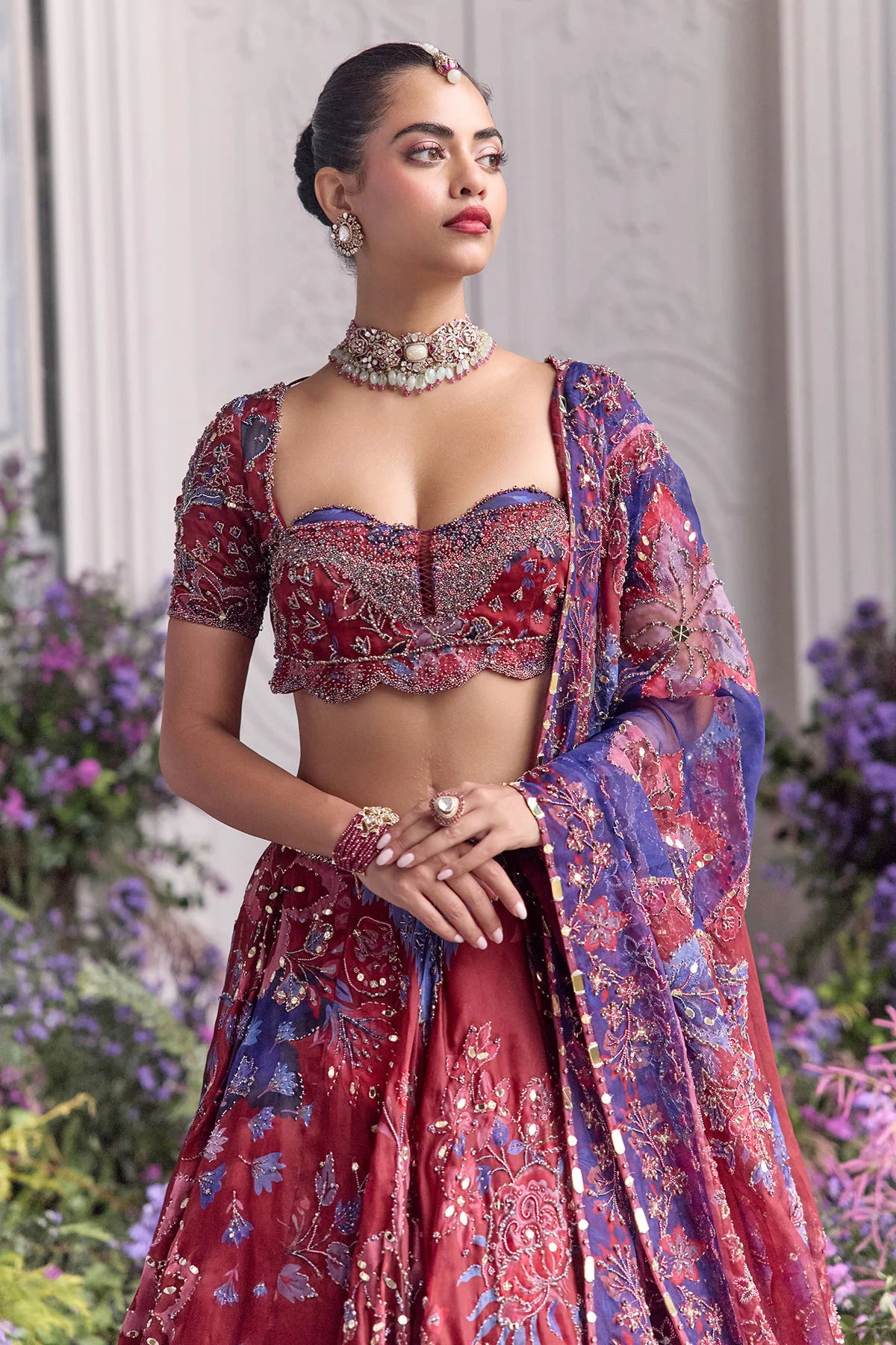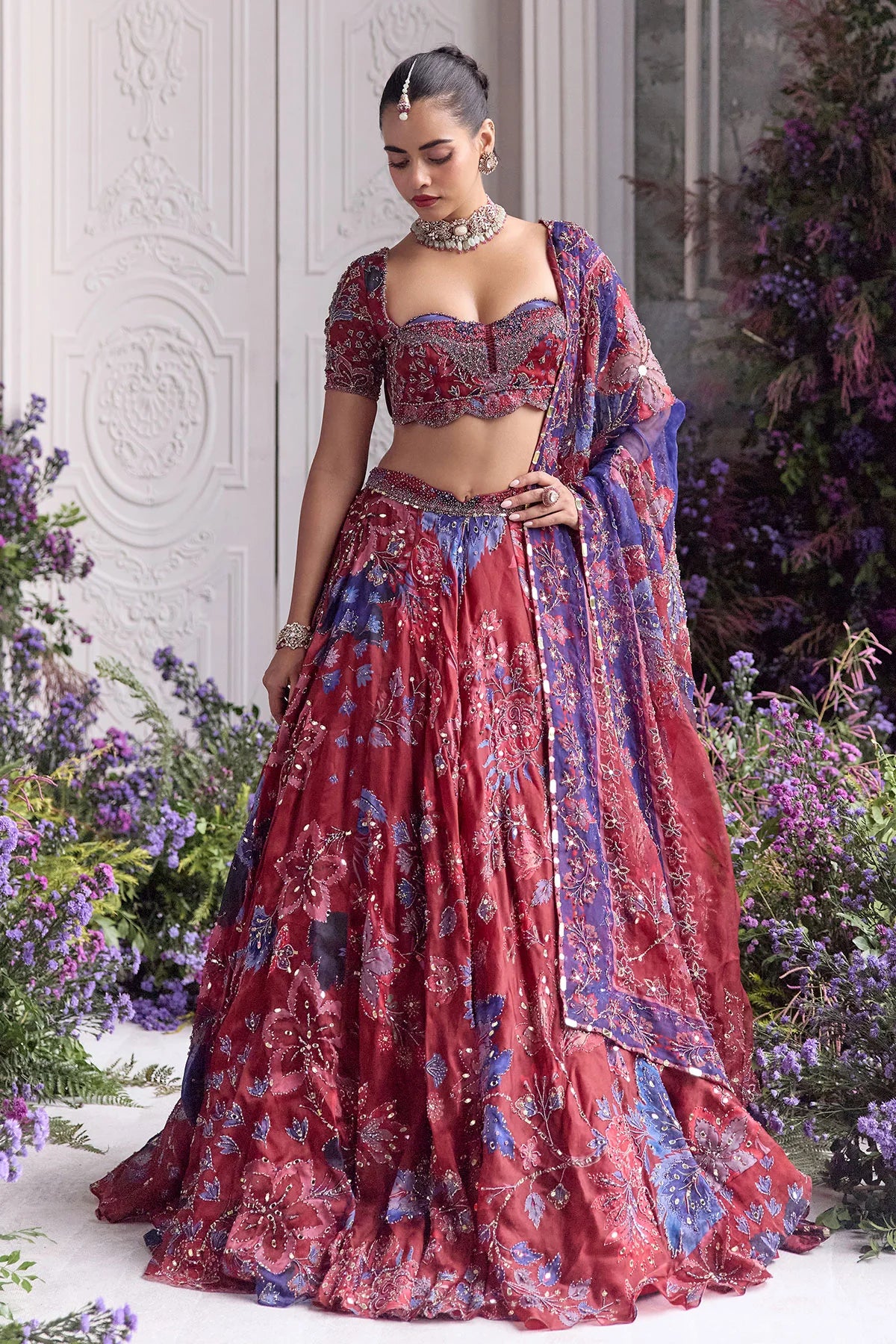 HEAVY HAND EMBROIDERED SCALLOPED BLOUSE PAIRED WITH HEAVY EMBROIDERED LEHENGA AND DUPATTA FEATURING VEIL