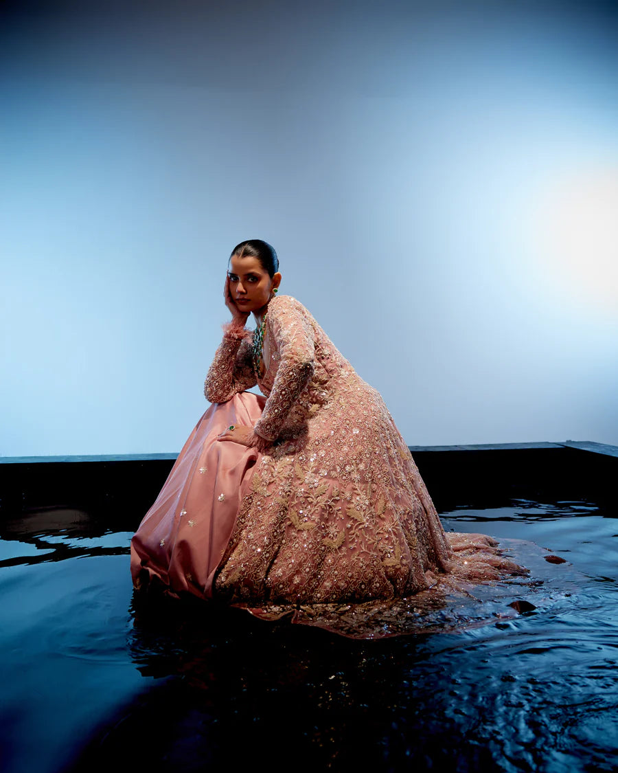 Exuding regal charm, this ensemble showcases a blush pink kalidaar jacket intricately embroidered with pearl, garnet, and bead work. Paired with an embroidered lehenga adorned with small motifs and scalloped border embroidery, the attire exudes elegance. The dupatta features embellishments on one elongated side and scalloped detailing on the remaining, completing the royal look of the ensemble.