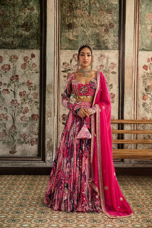 Fuschia Print And Highlighted Angrakha Blouse Lehenga Set