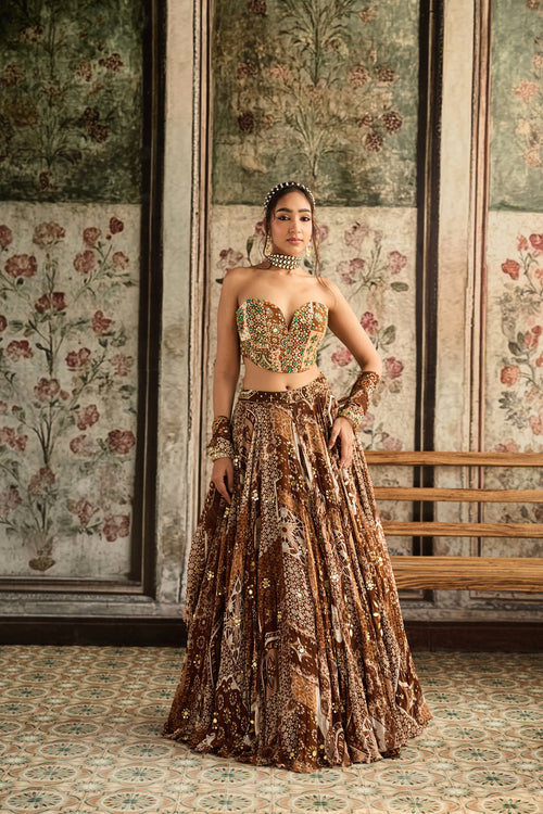 Caramel Print And Highlighted Corset Top With Lehenga Set