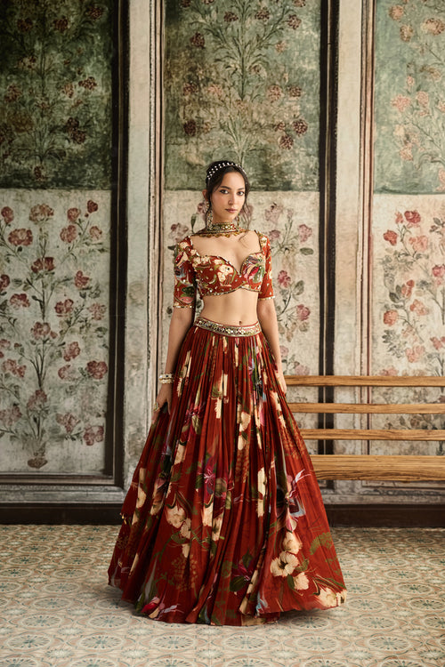 Rust Floral Printed Lehenga Set