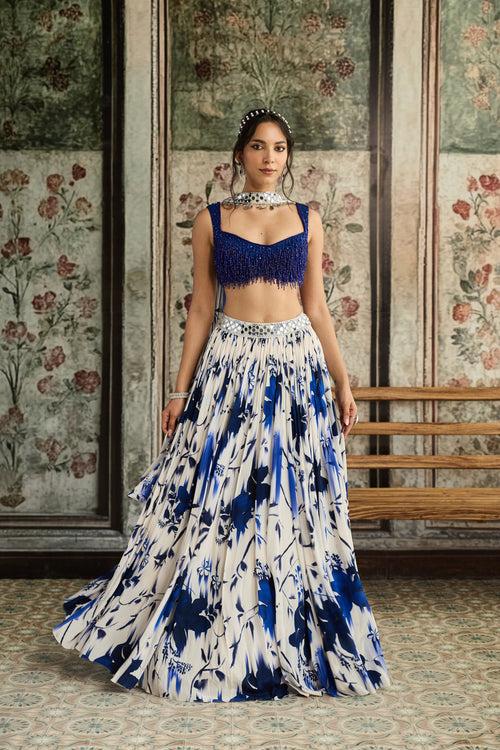 Ivory & Blue Floral Printed Lehenga Set