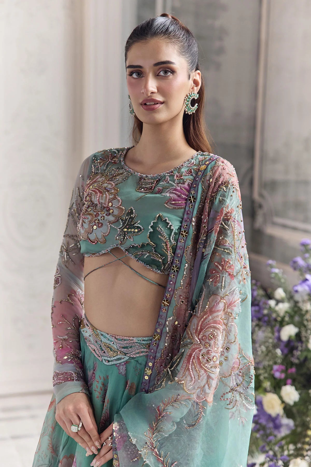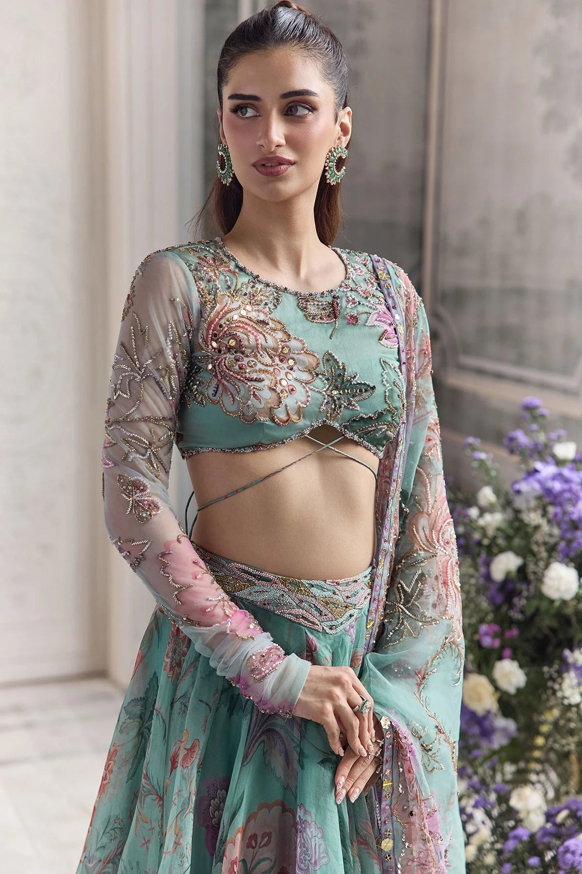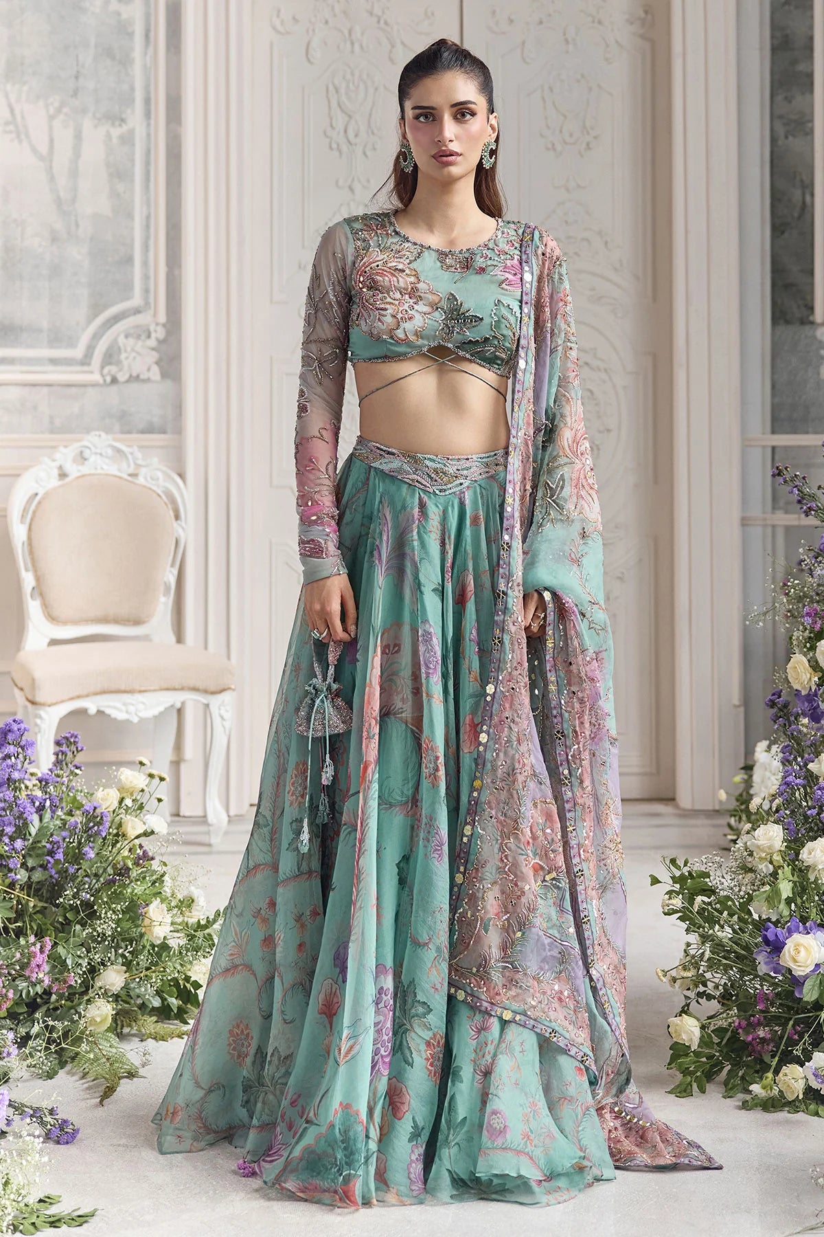 EMBROIDERED FULL SLEEVES BLOUSE PAIRED WITH EMBROIDERED DUPATTA AND FLORAL LEHENGA