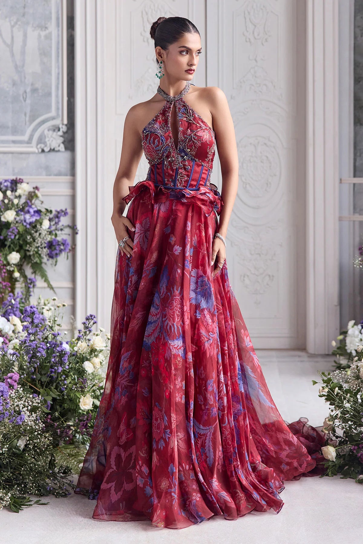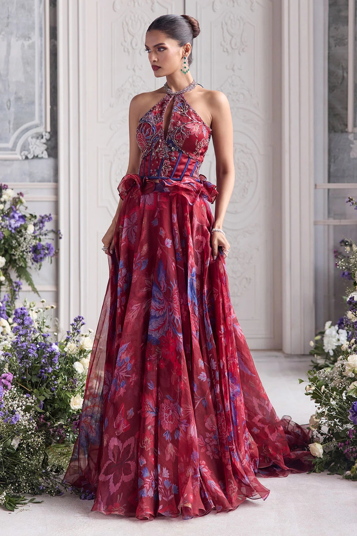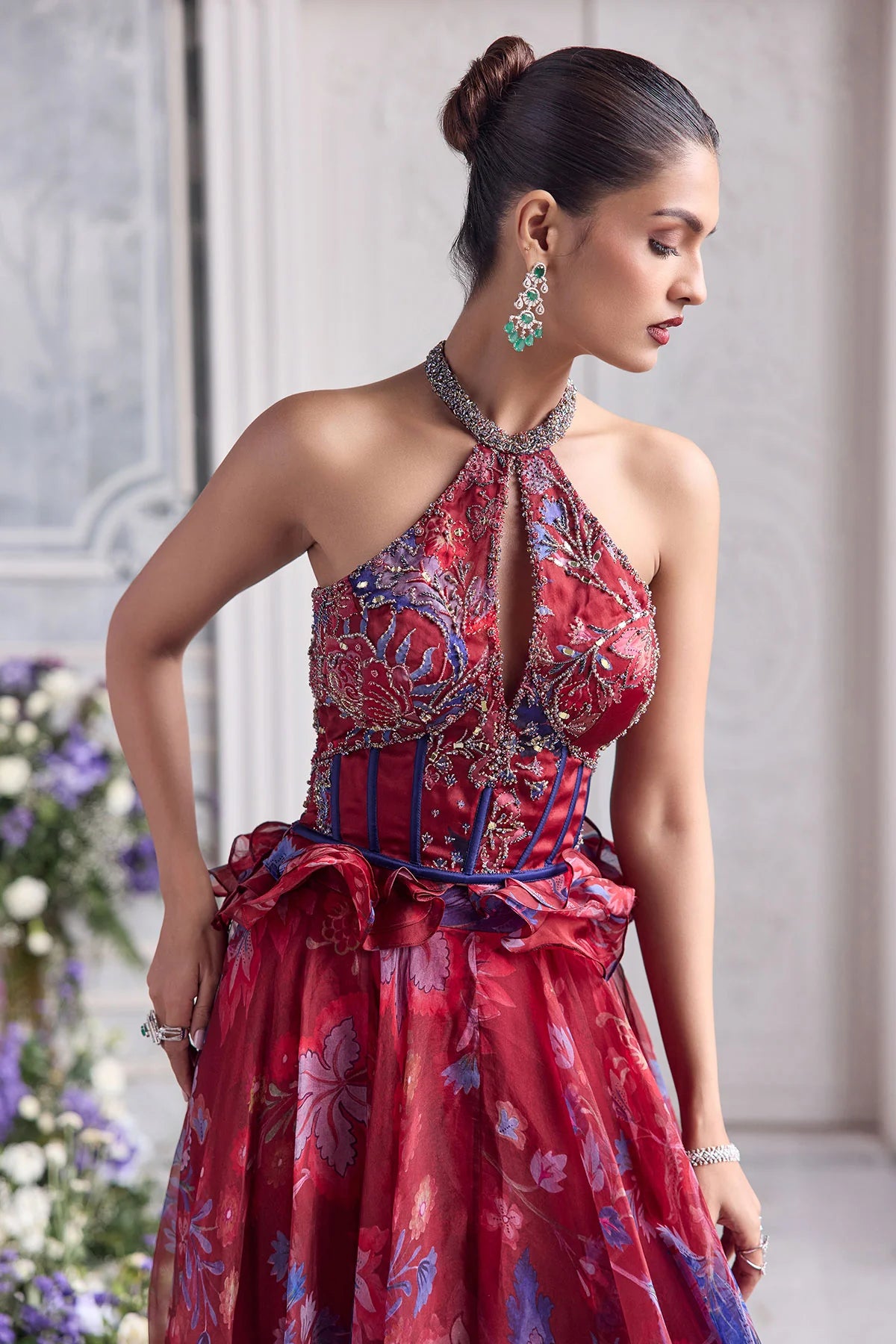 JEWELED NECK RUFFLED CORSET TOP PAIRED WITH FLORAL LEHENGA