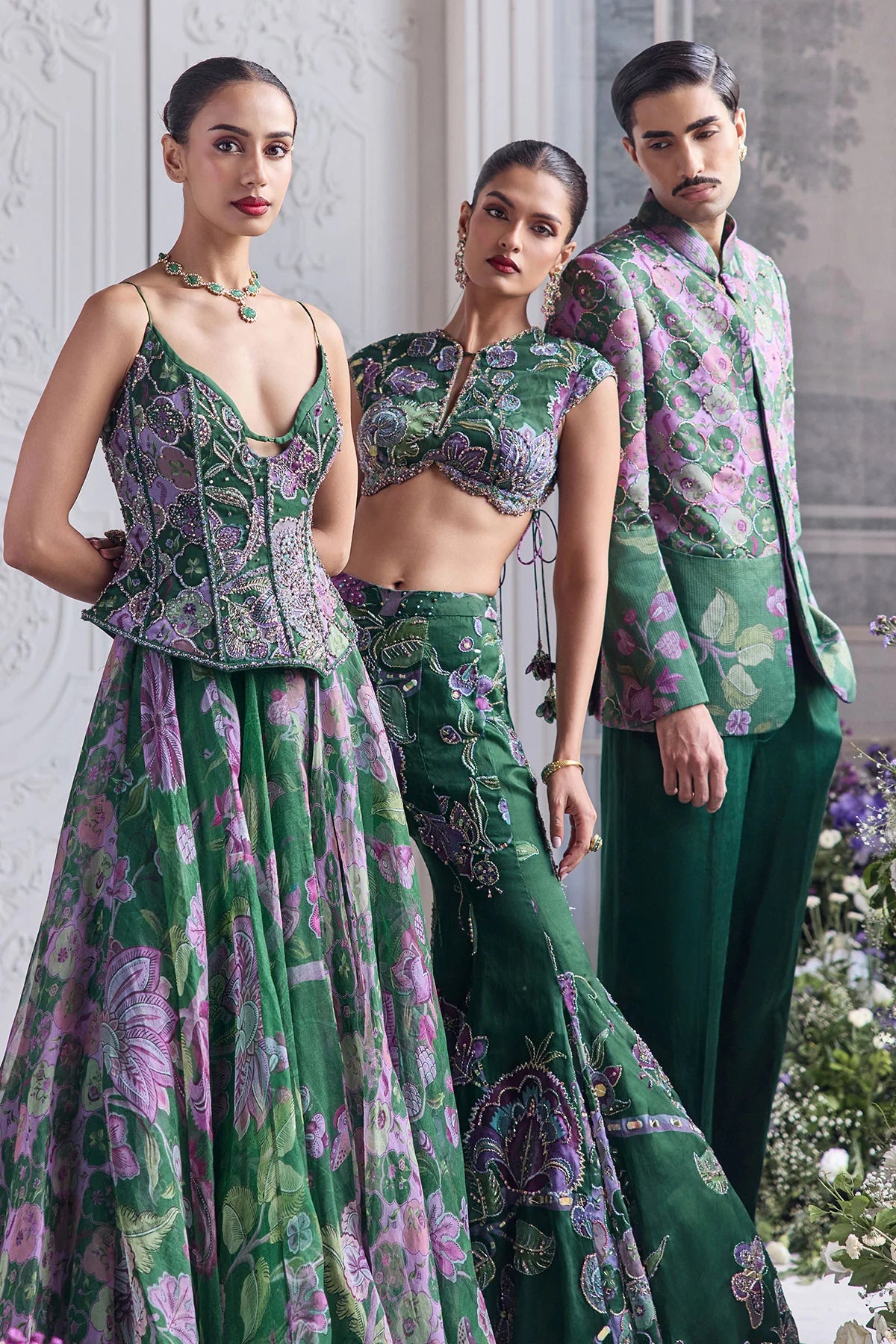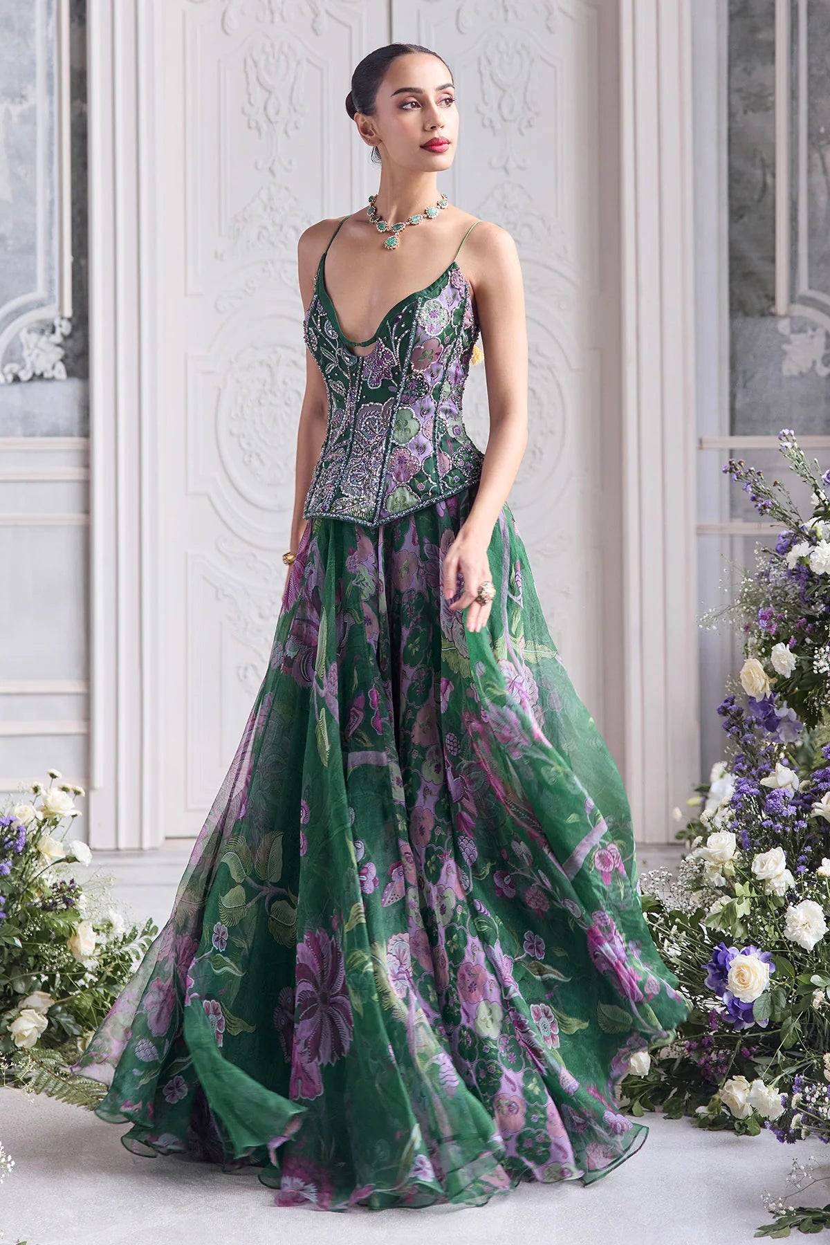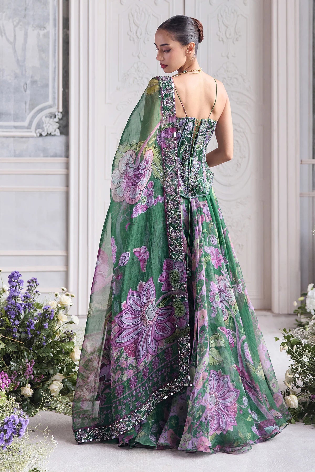 EMBRODIERED PANELLED CORSET TOP PAIRED WITH EMBROIDERED DUPATTA AND FLORAL LEHENGA