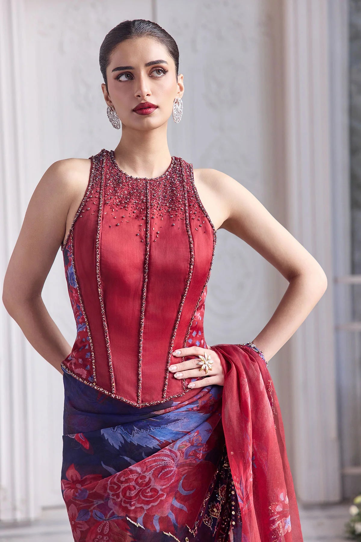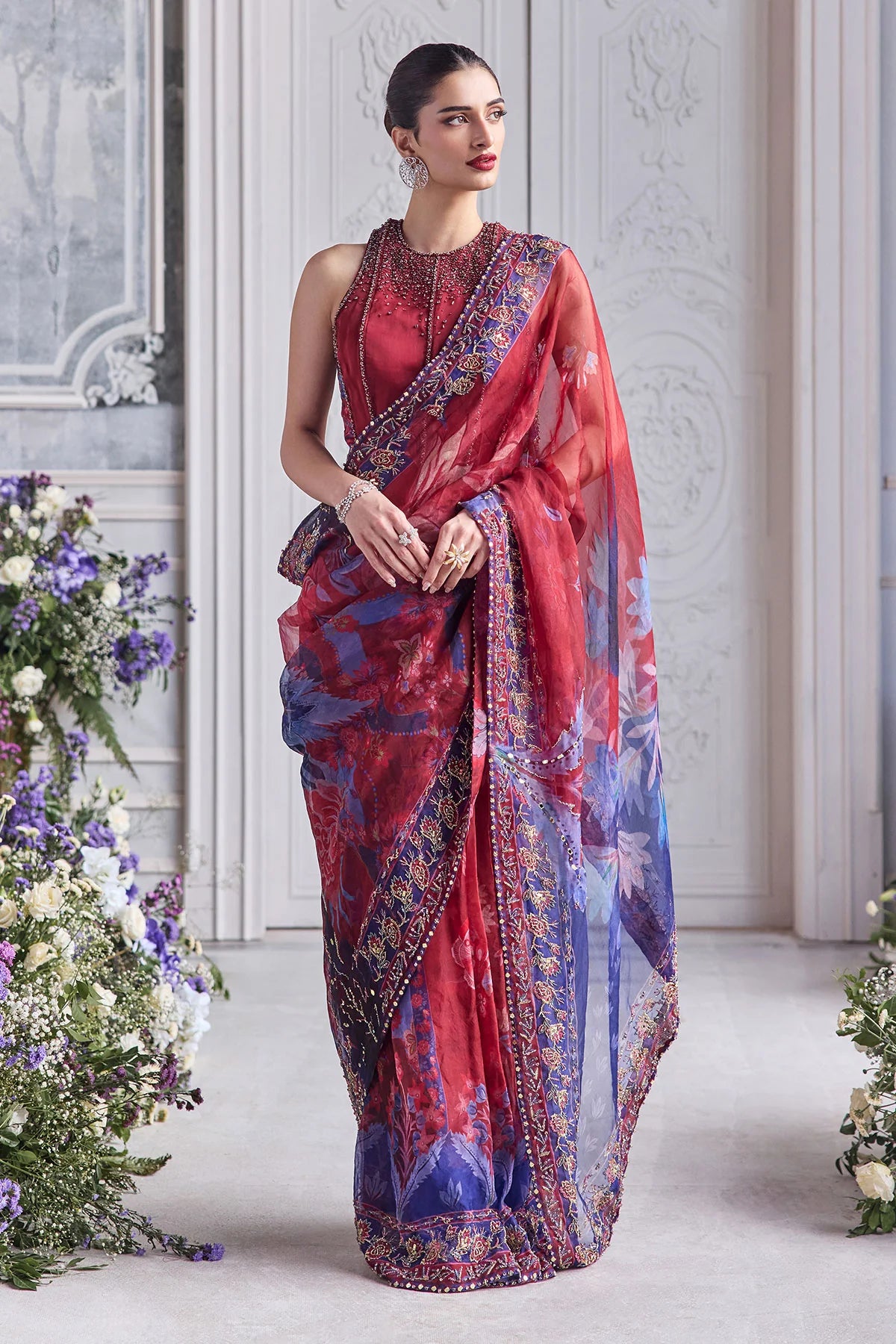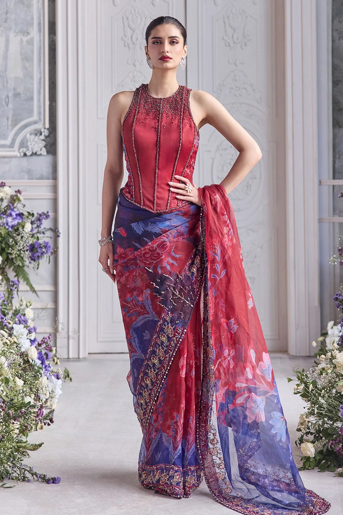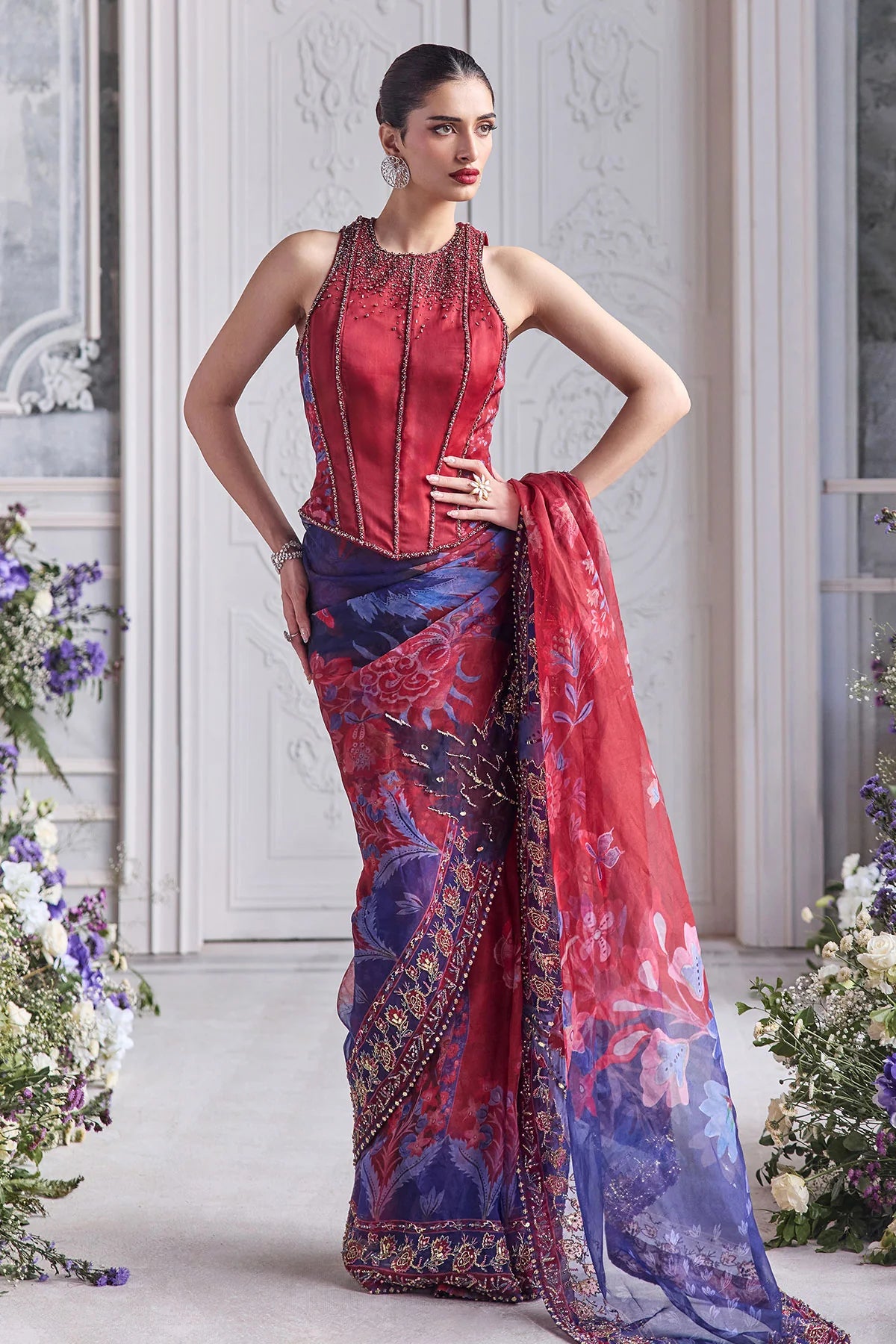 EMBROIDERED RACER BACK CORSET PAIRED WITH EMBRODIERED PREDRAPED SAREE