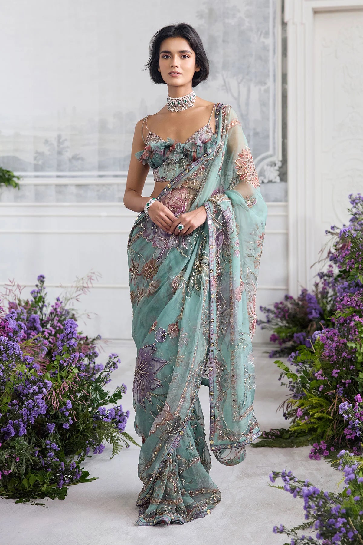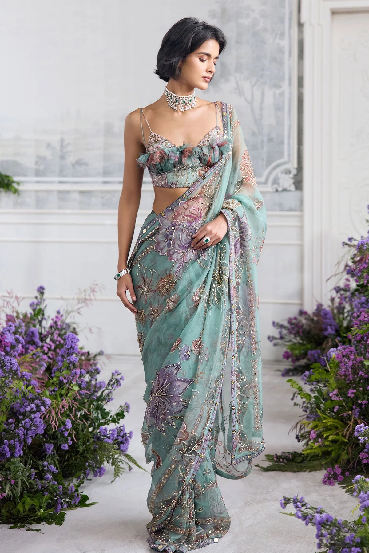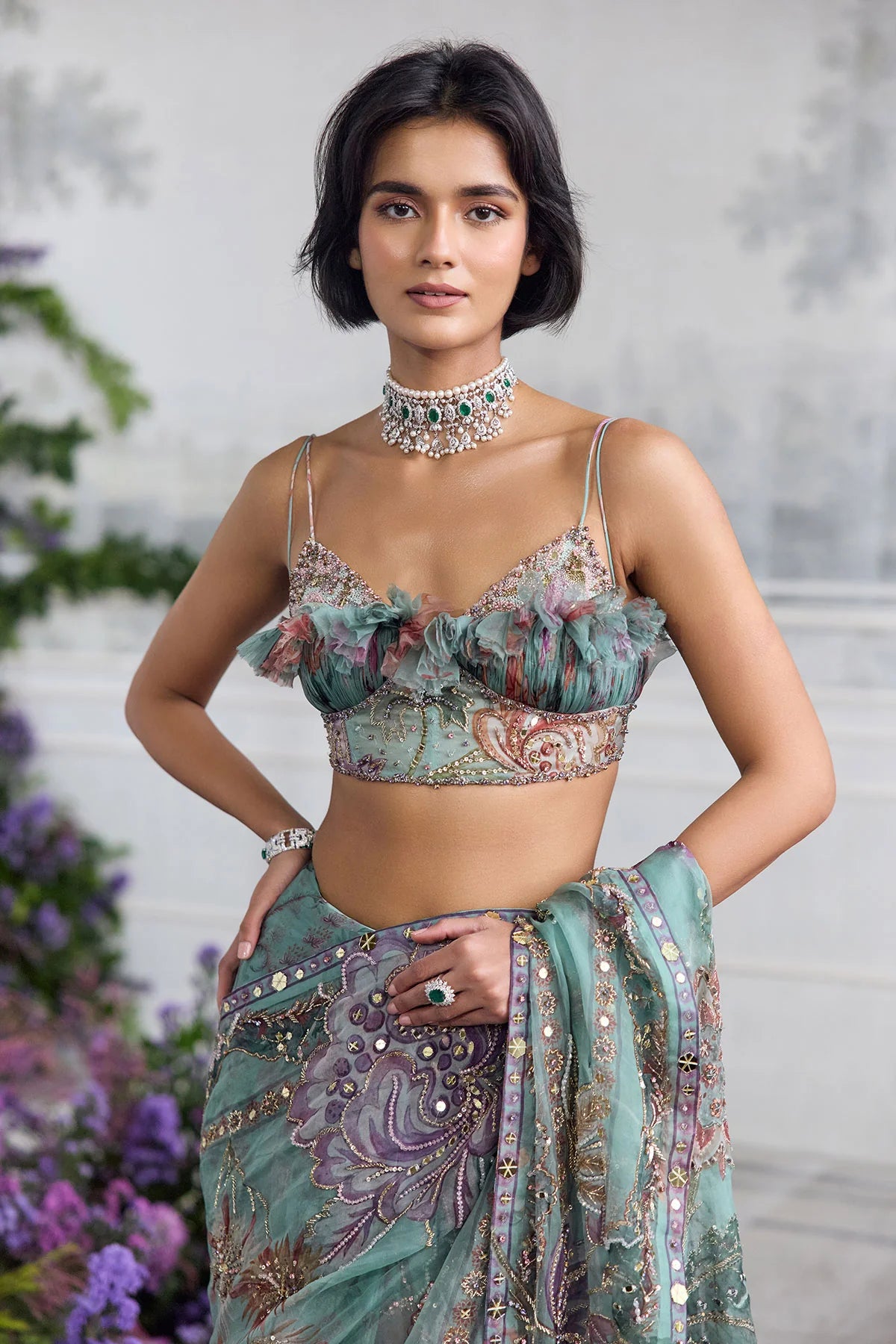 HAND EMBROIDERED RUFFLED BLOUSE PAIRED WITH EMBROIDERED PREDRAPED SAREE