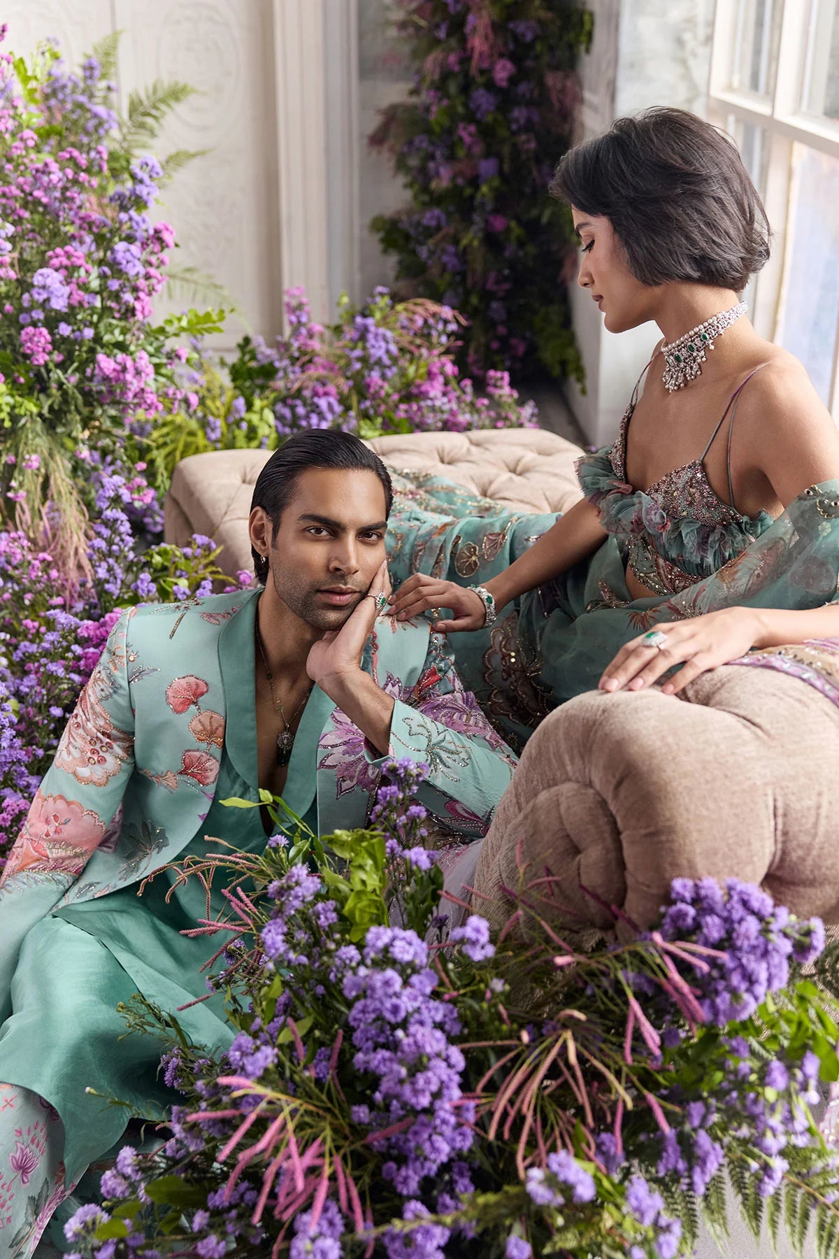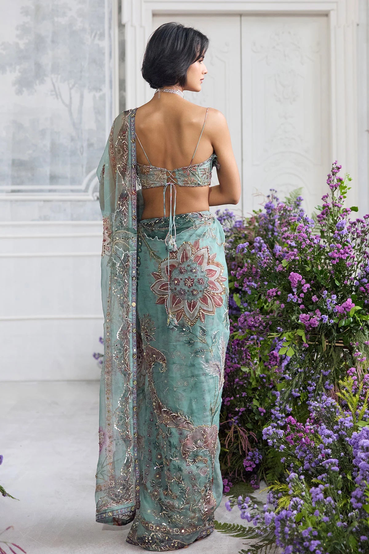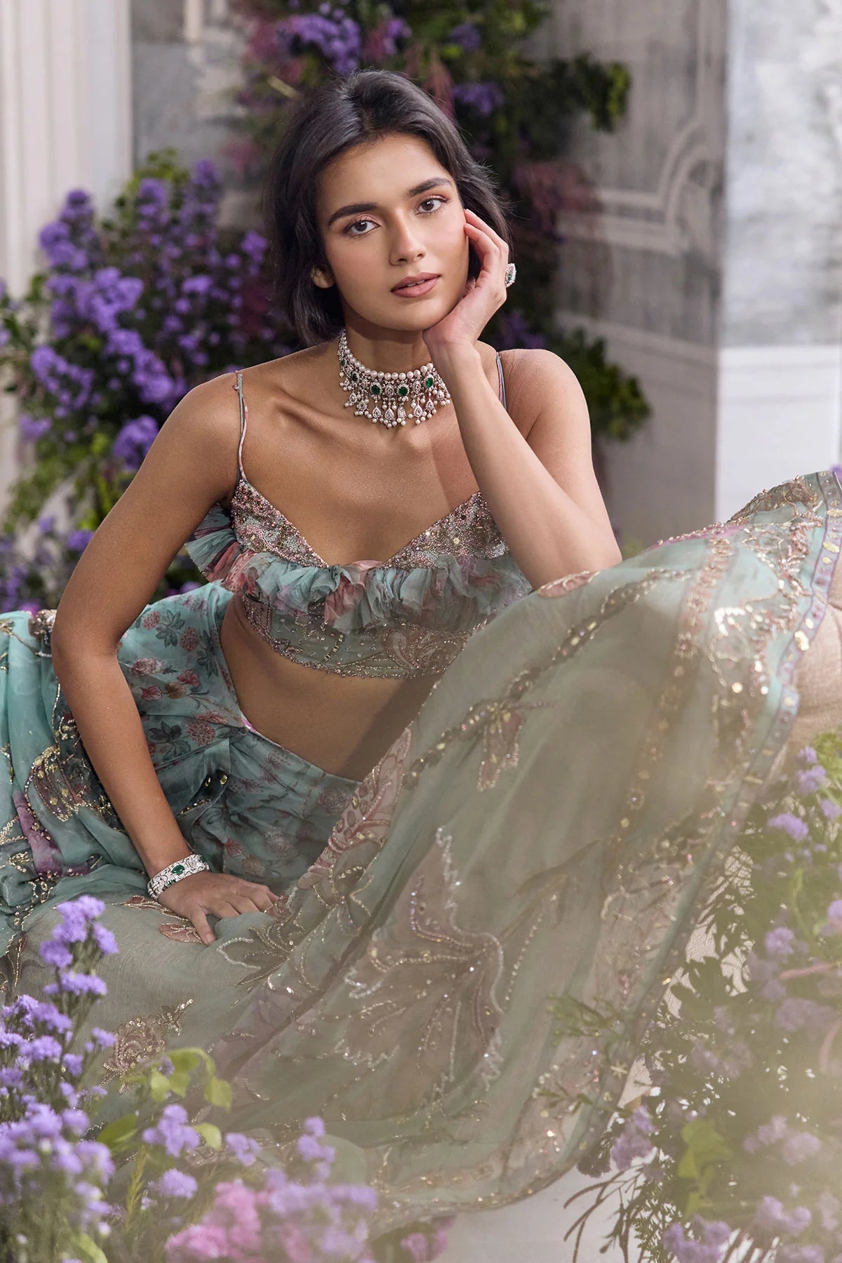 HAND EMBROIDERED RUFFLED BLOUSE PAIRED WITH EMBROIDERED PREDRAPED SAREE
