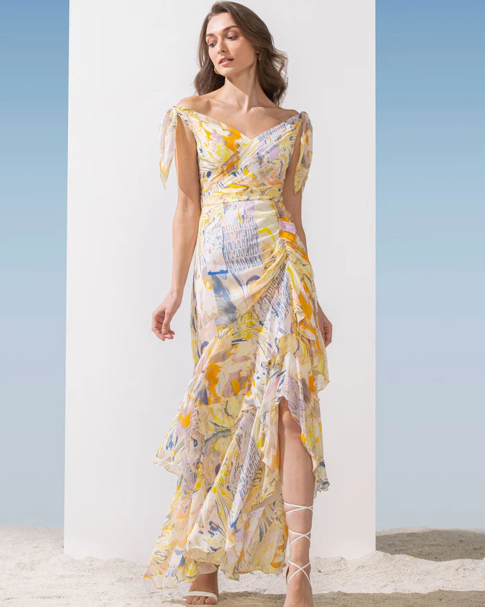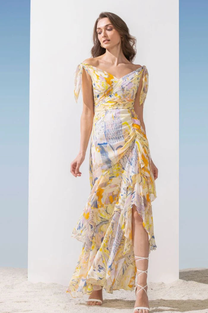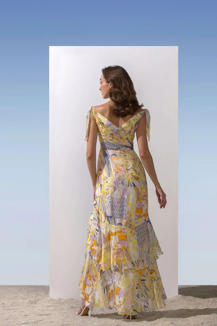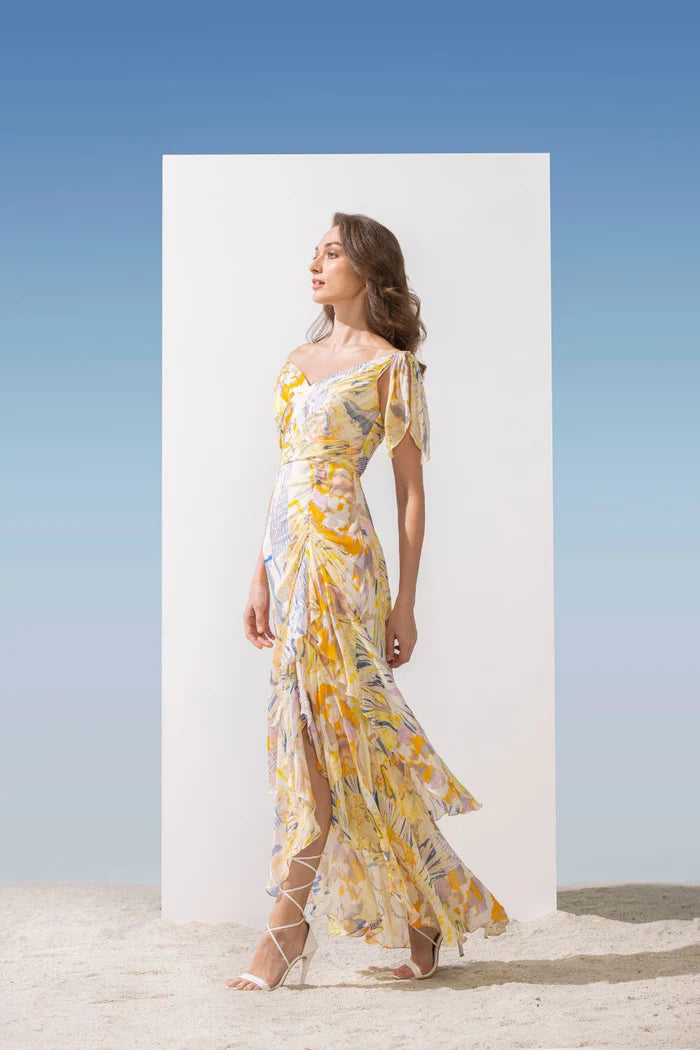 STYLING: Ideal for a lively beachside soirée or a tropical getaway, the Chiffon Yellow Multi Printed Tie Shoulder Dress radiates a carefree and vibrant charm