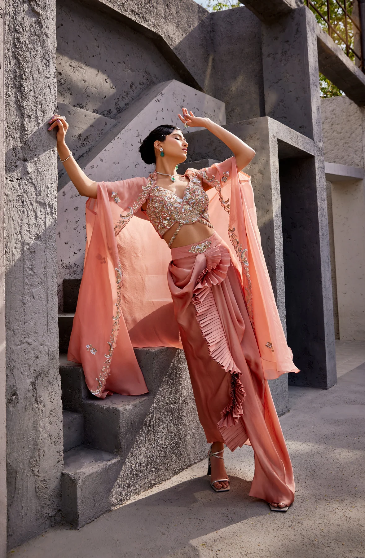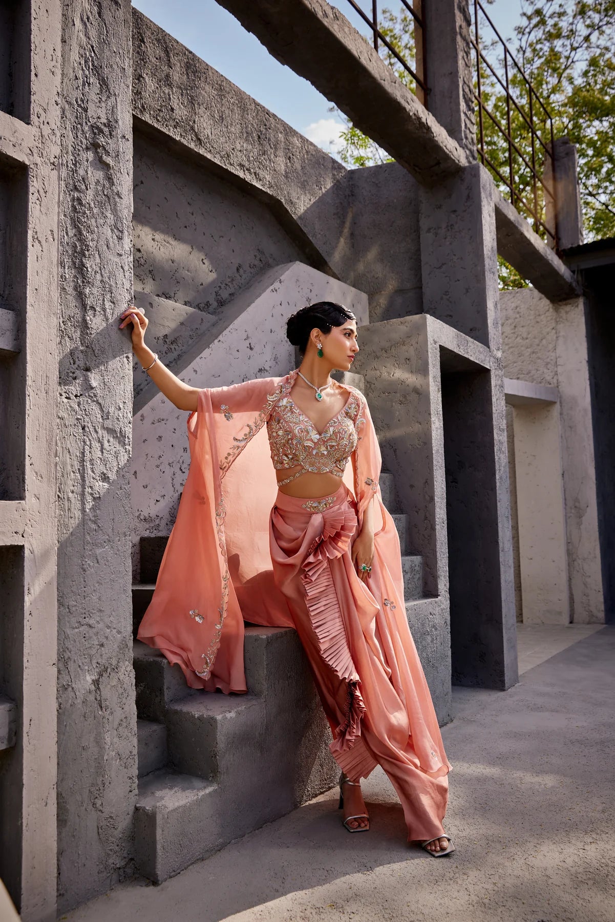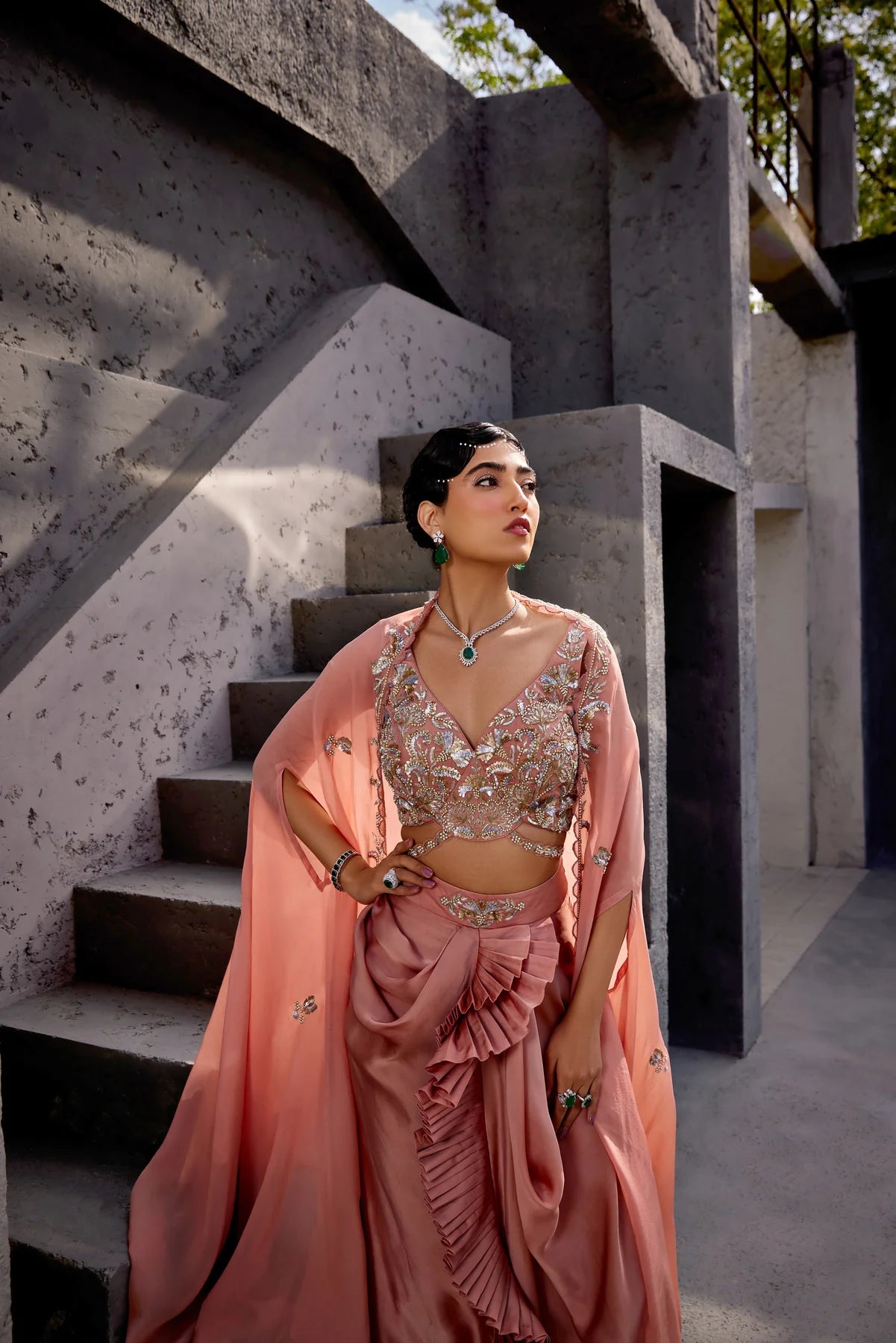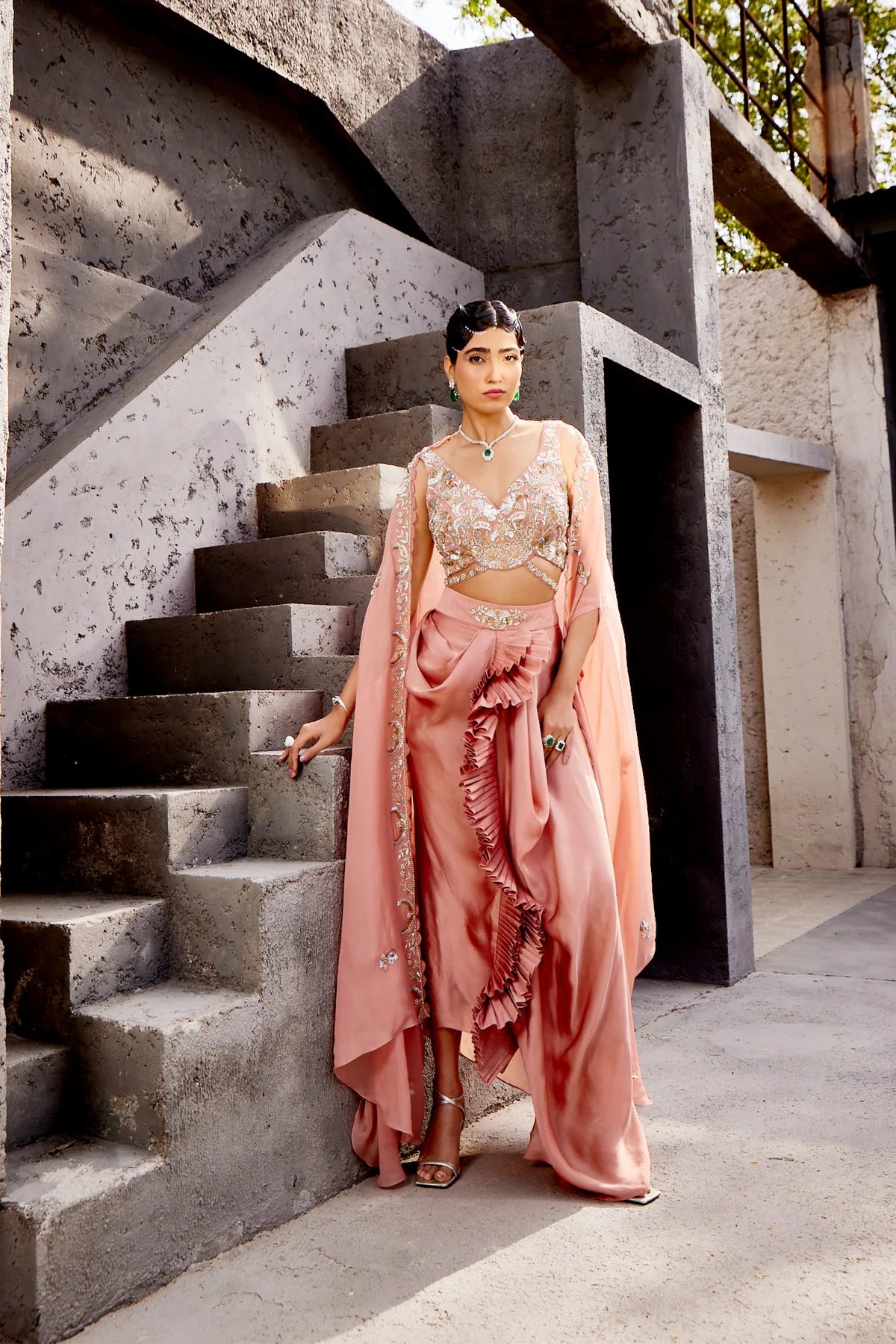 • Soft peach dress with draped skirt and pleated drape at the centre