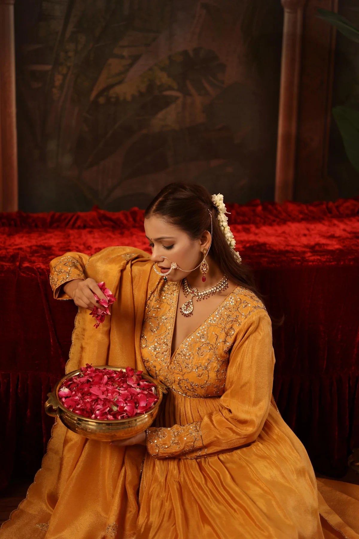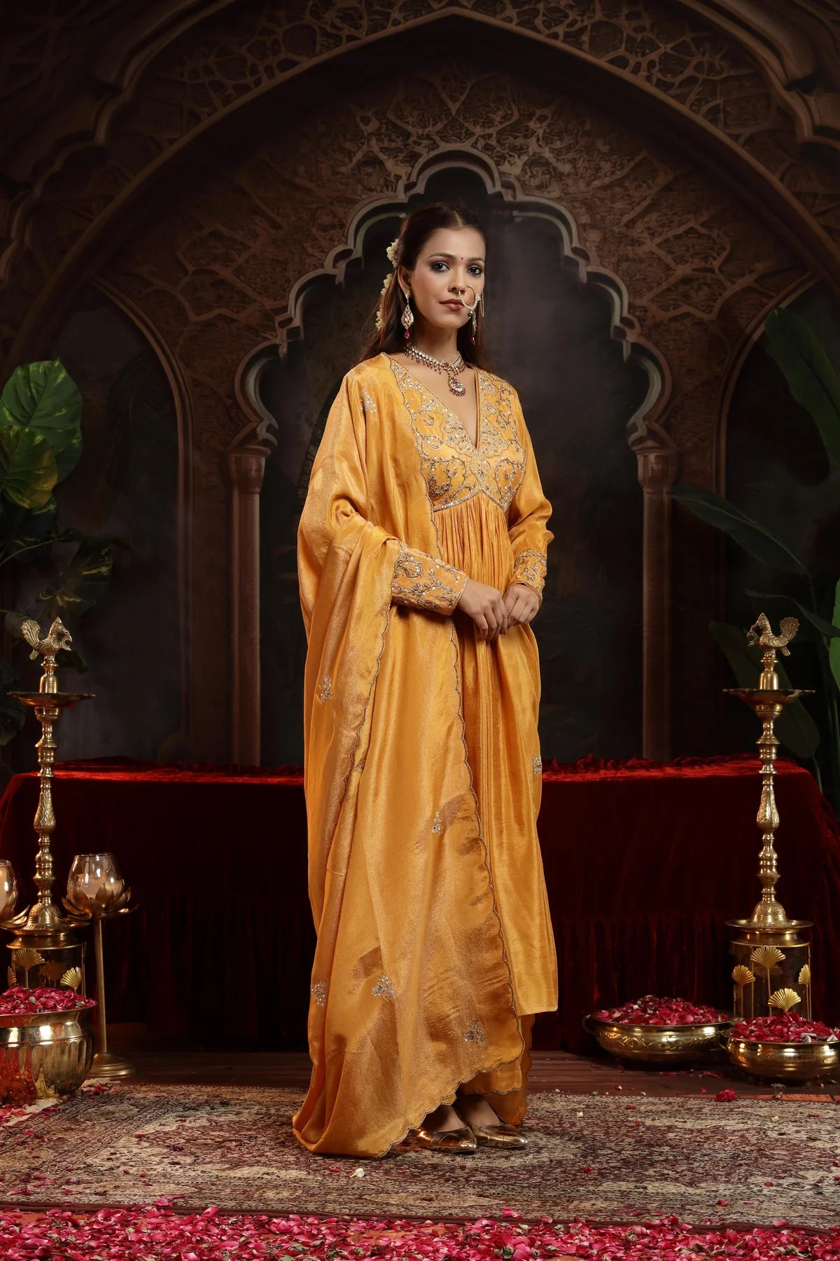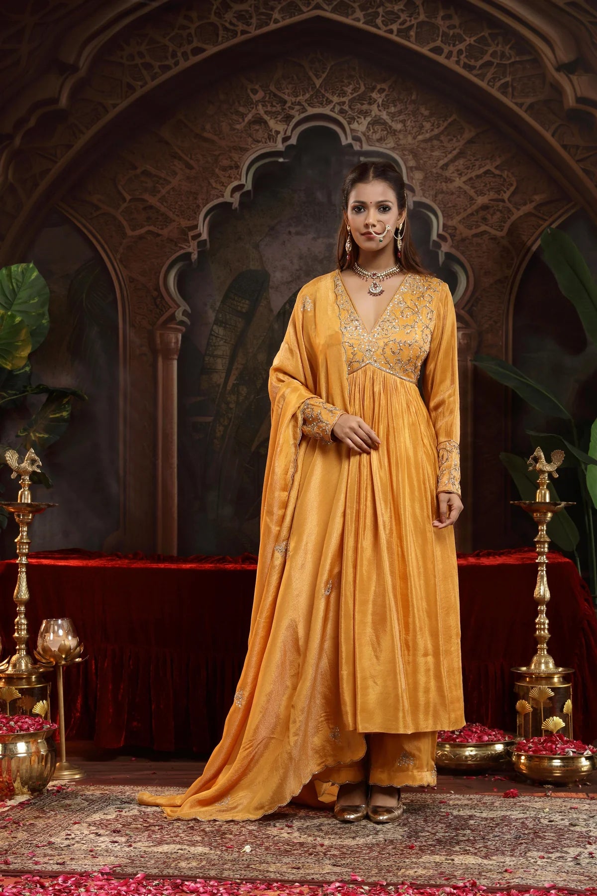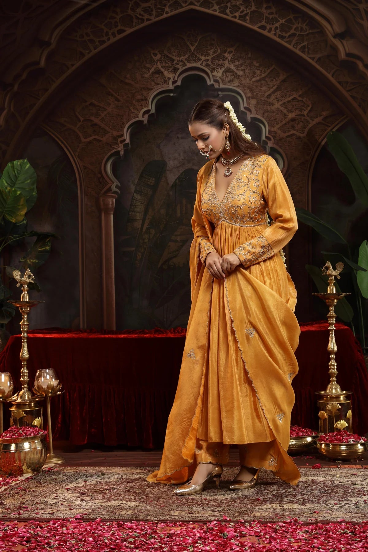 This stunning short Anarkali set is a perfect fusion of elegance and craftsmanship. The zardozi embroidery on the yoke and sleeves adds intricate detailing, giving the outfit a royal touch. The gathers at the waist subtly accentuate the waistline, enhancing the overall silhouette with grace and poise. Paired with a palazzo featuring delicate embroidery along the hem, the beautiful details peek through the Anarkali, adding depth and visual interest to the ensemble.