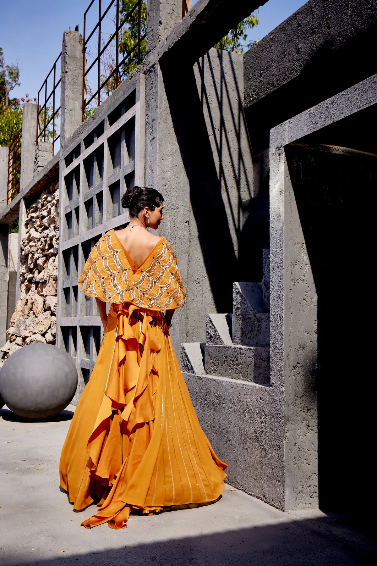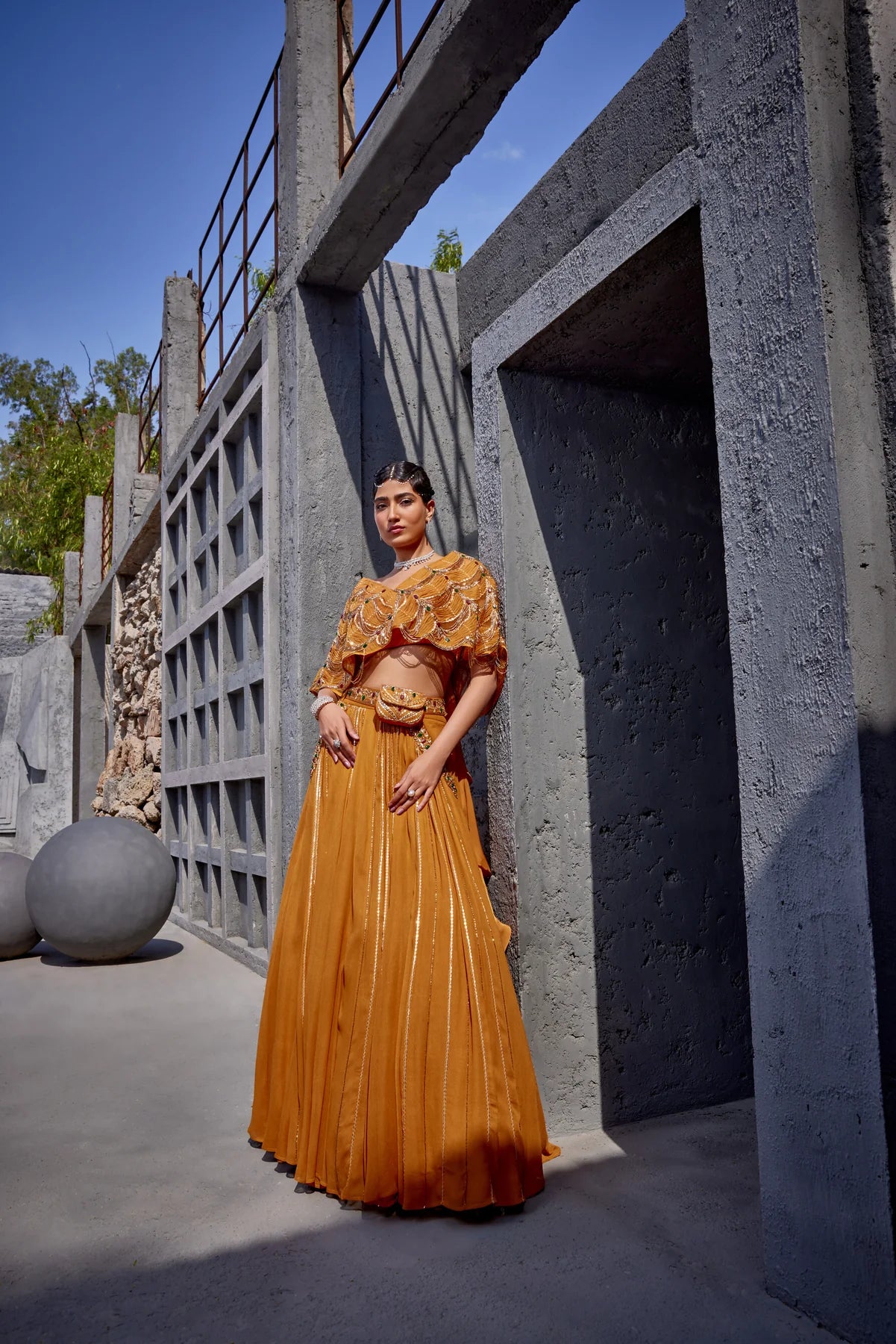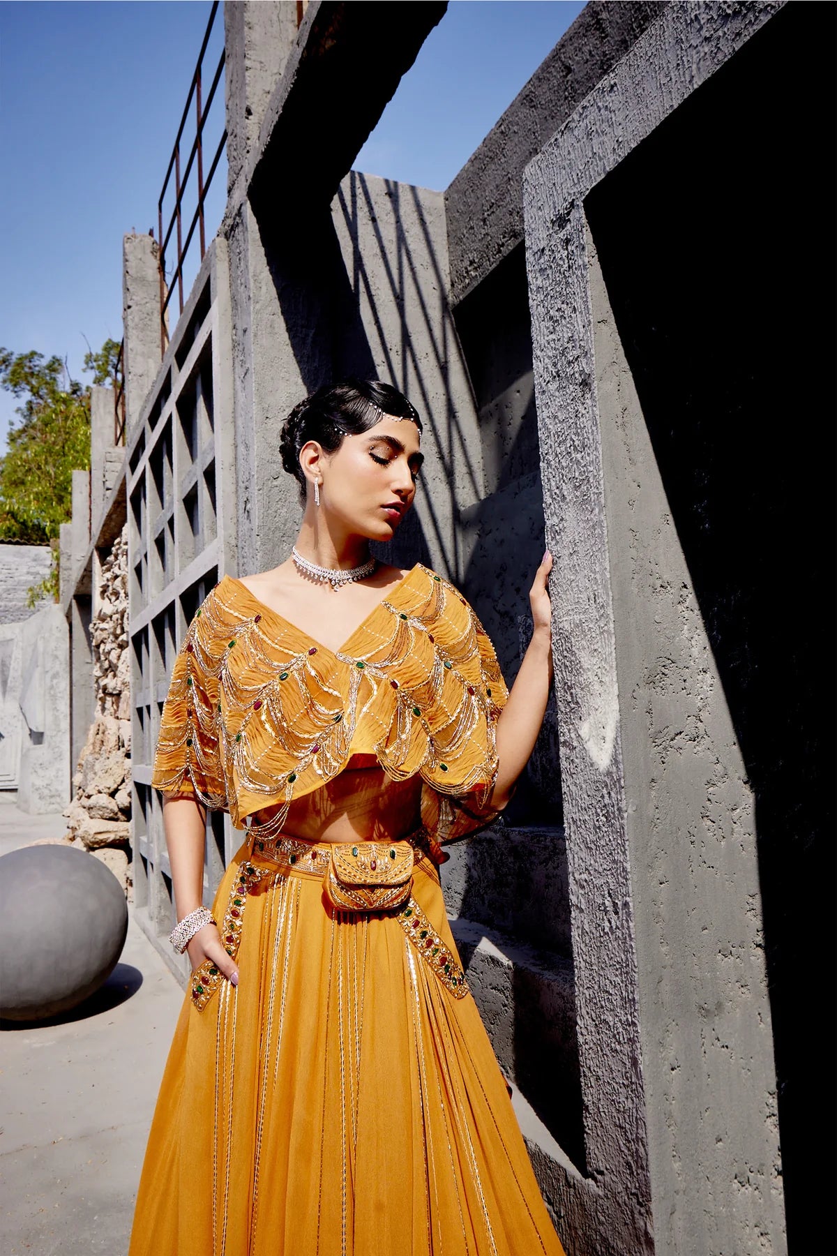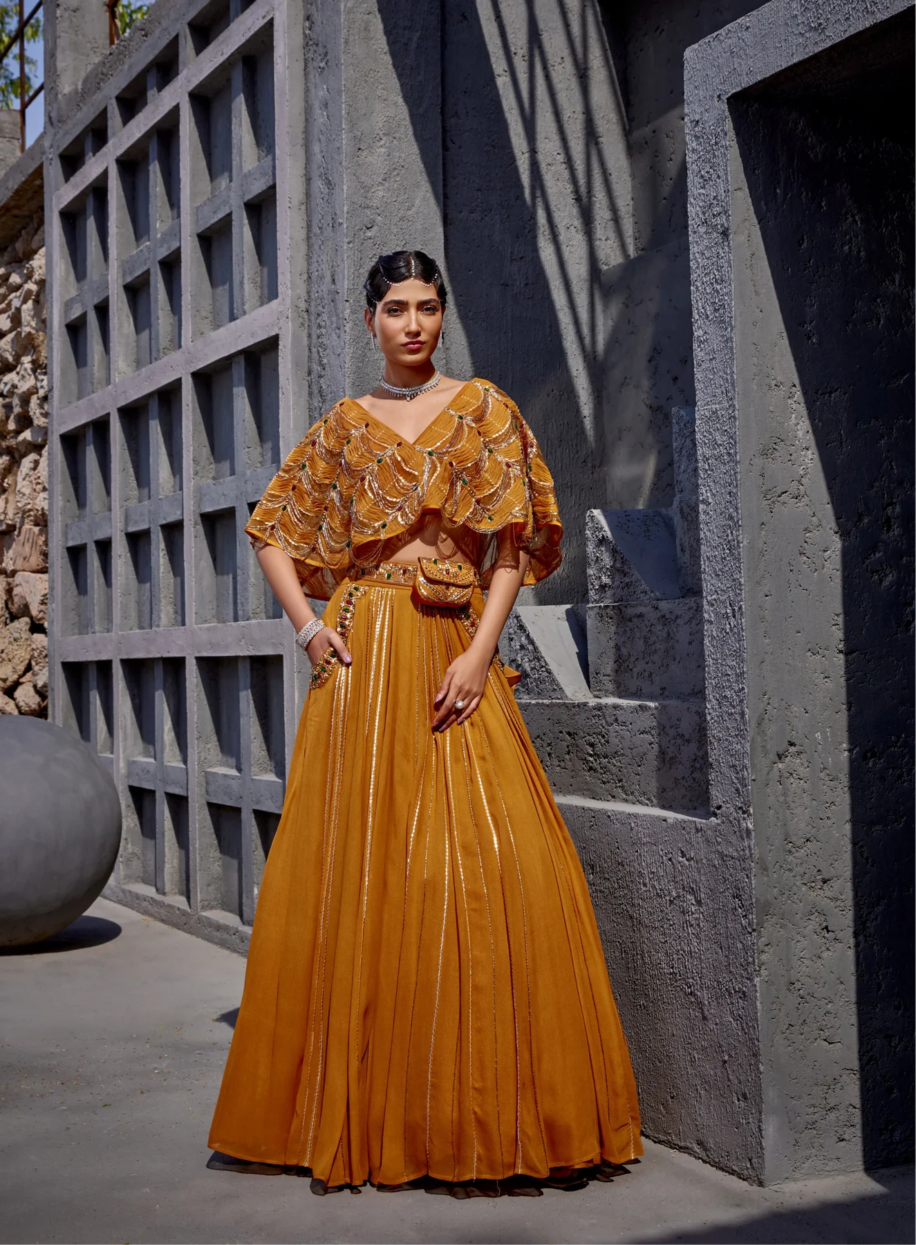 (Cape: 14 inches, Choli: 14 inches, Skirt: 45 inches, Dupatta: 46 inches, Belt and Bag)