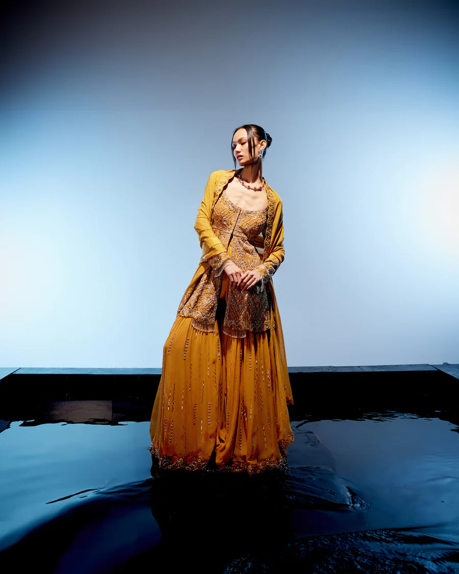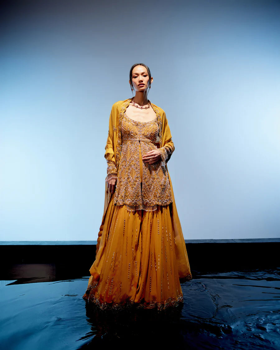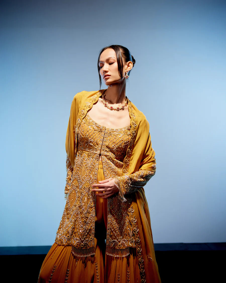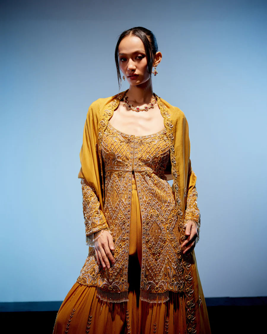 Presenting the elegant burnt orange sharara set featuring trinket embroidery. The ensemble includes a jacket-style tunic with scalloped hem detailing and a broad neckline, paired with a coordinating dupatta to complete the look.